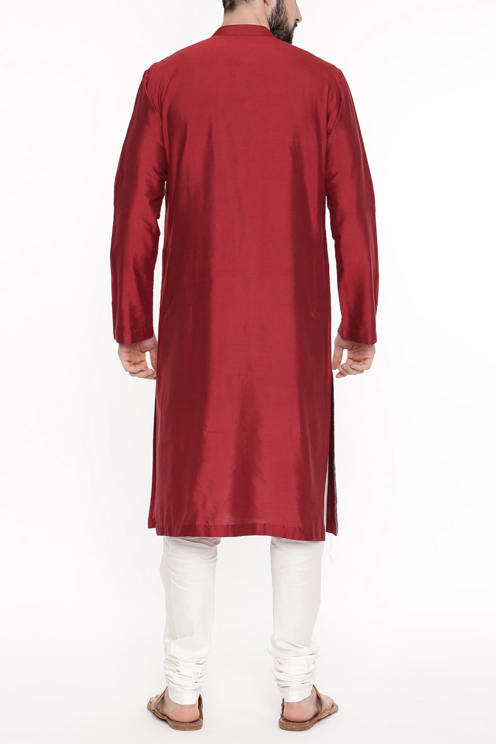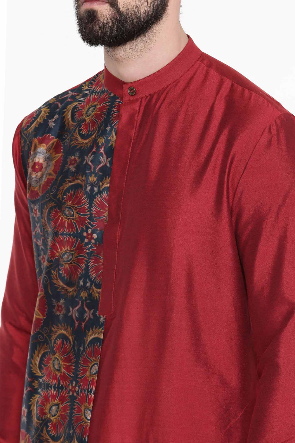 Mayank Modi designs this red silk kurta with a printed panel, pairing it with a churidar. Style the look with a pair of kolhapuris for a rooted appeal.