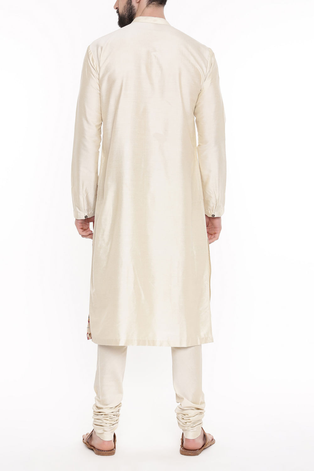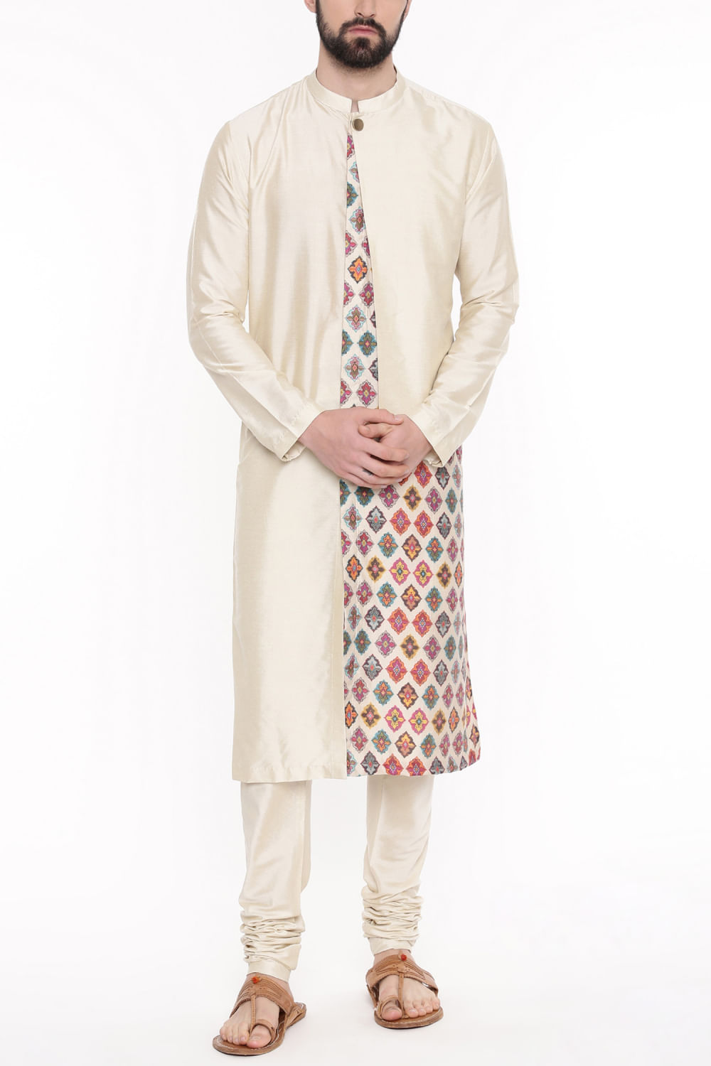 Mayank Modi designs this minimalistic beige kurta in silk with print detailing and artsy cuts. It is paired with a churidar. Style the look with a pair of handcrafted mojris.