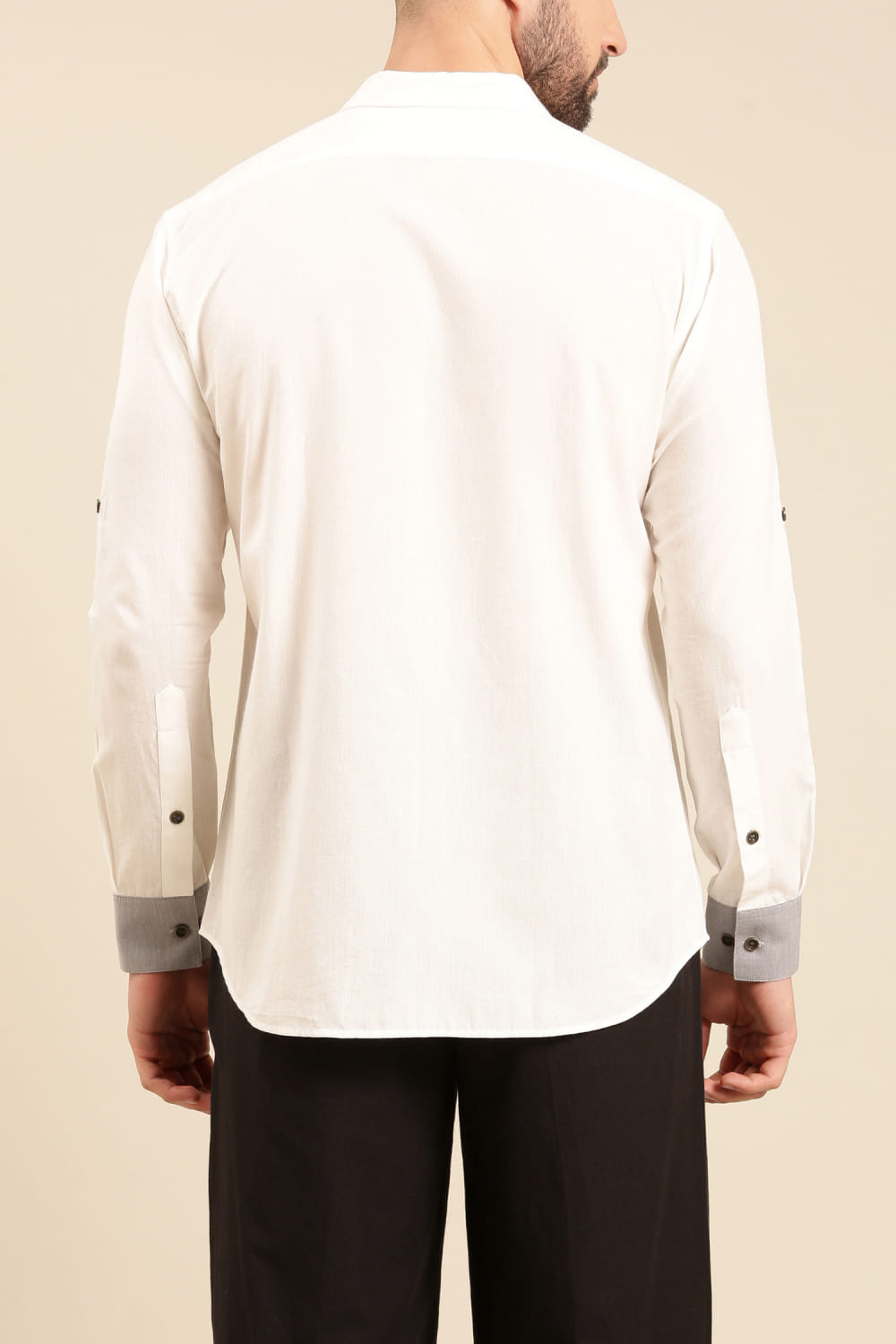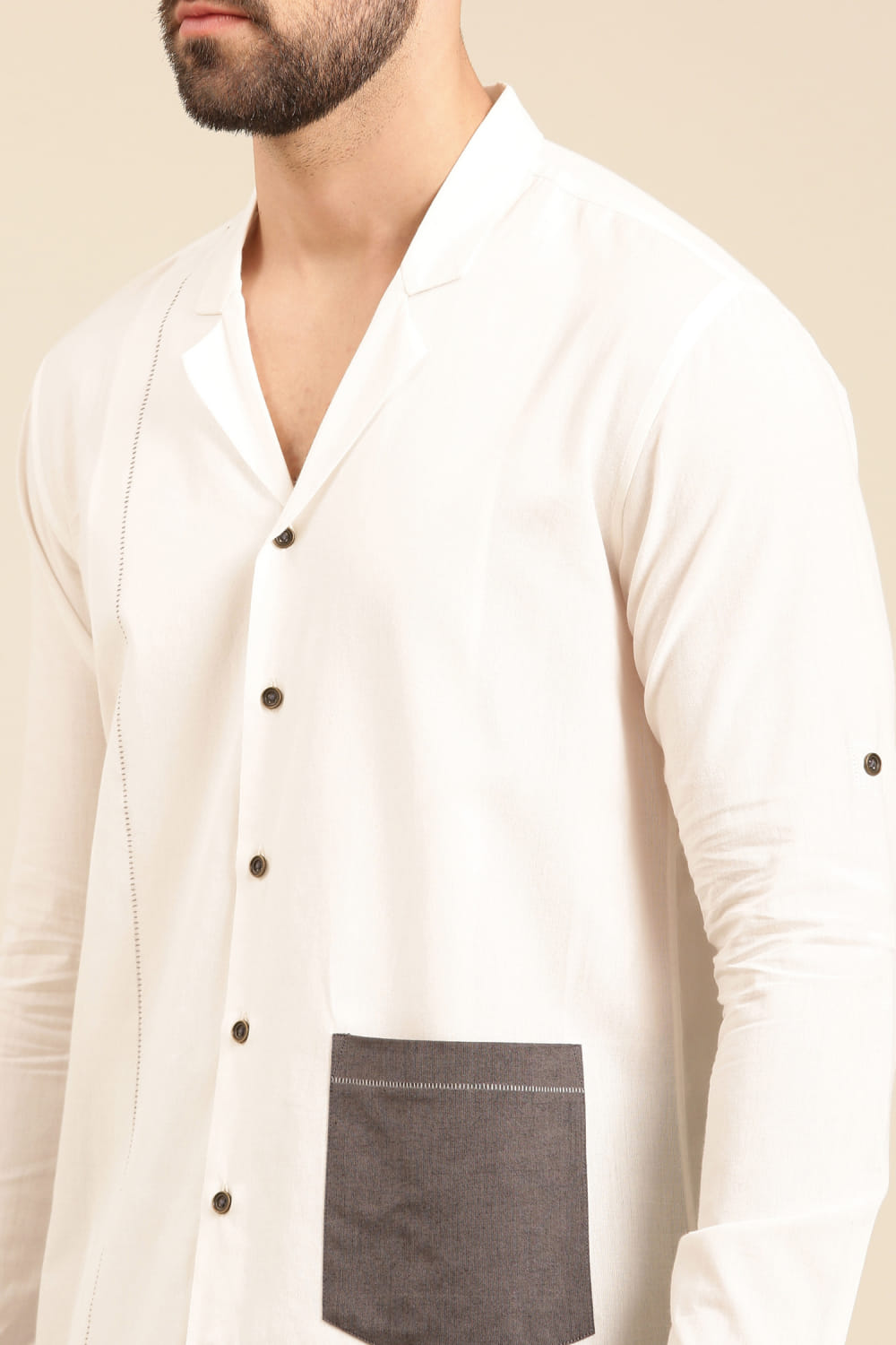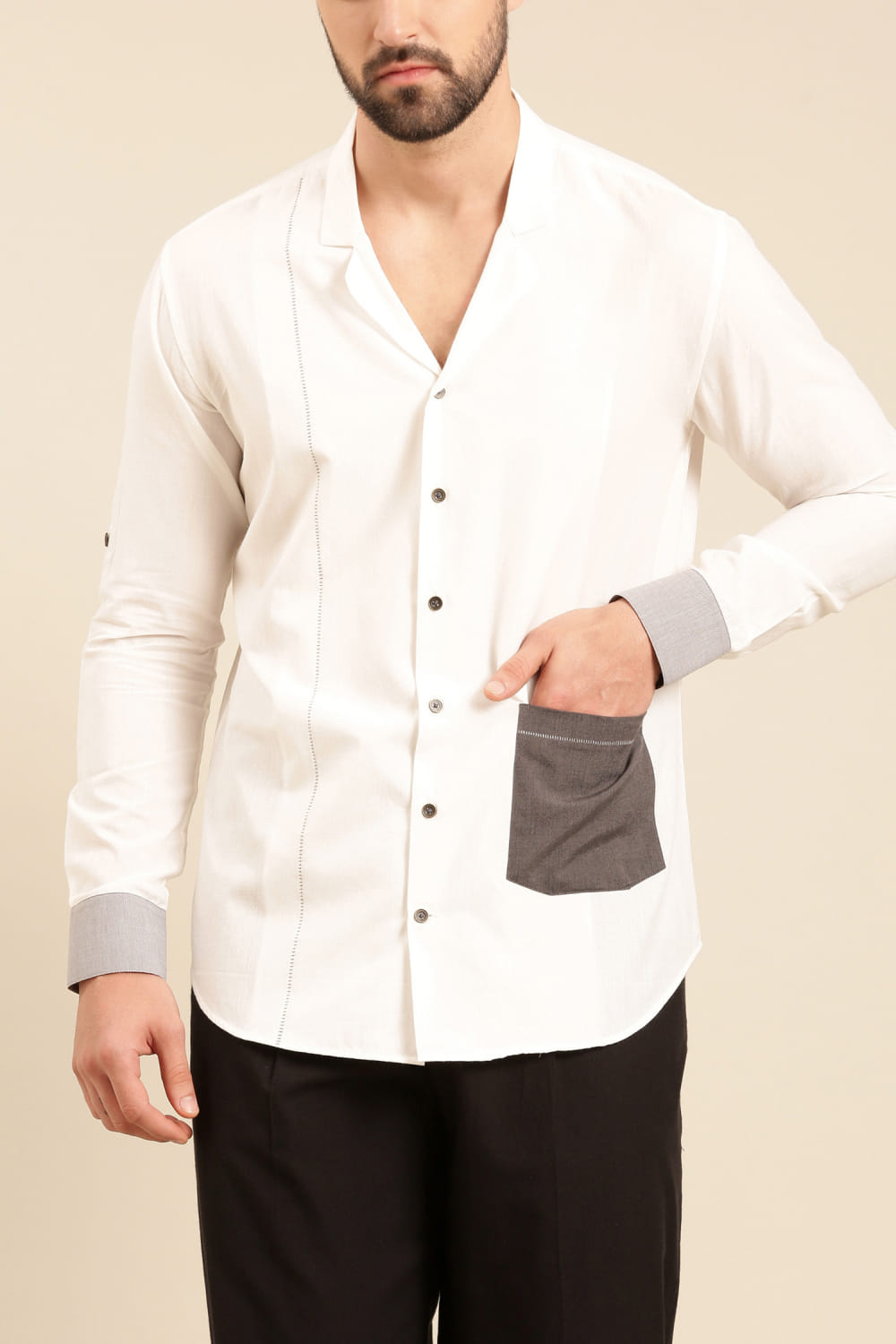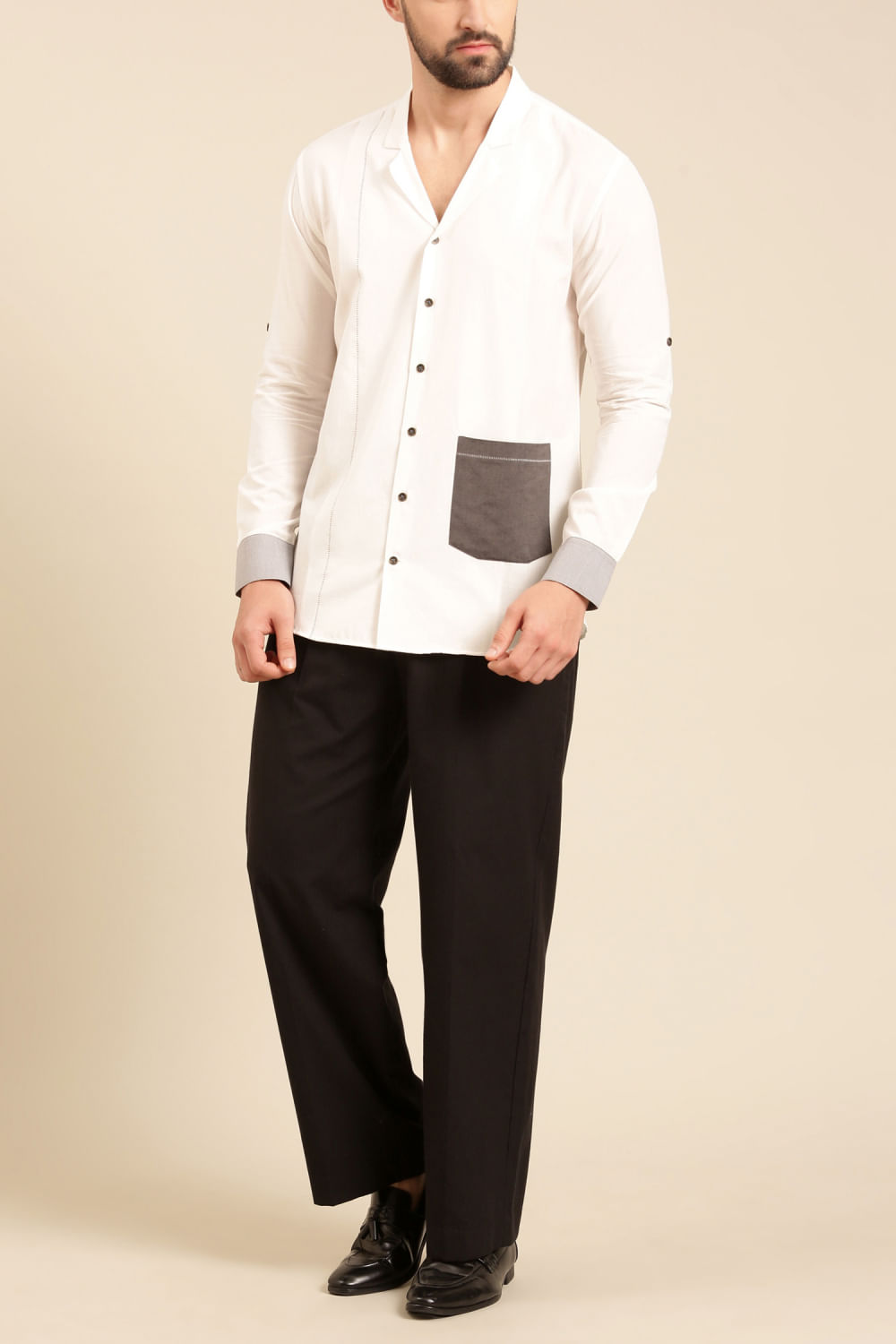 Mayank Modi designs this opulent shirt customised in malai cotton with a collar, buttons and contrasting pocket detailing. Style it with denim pants and sneakers. The pants here are shown for styling purposes only.