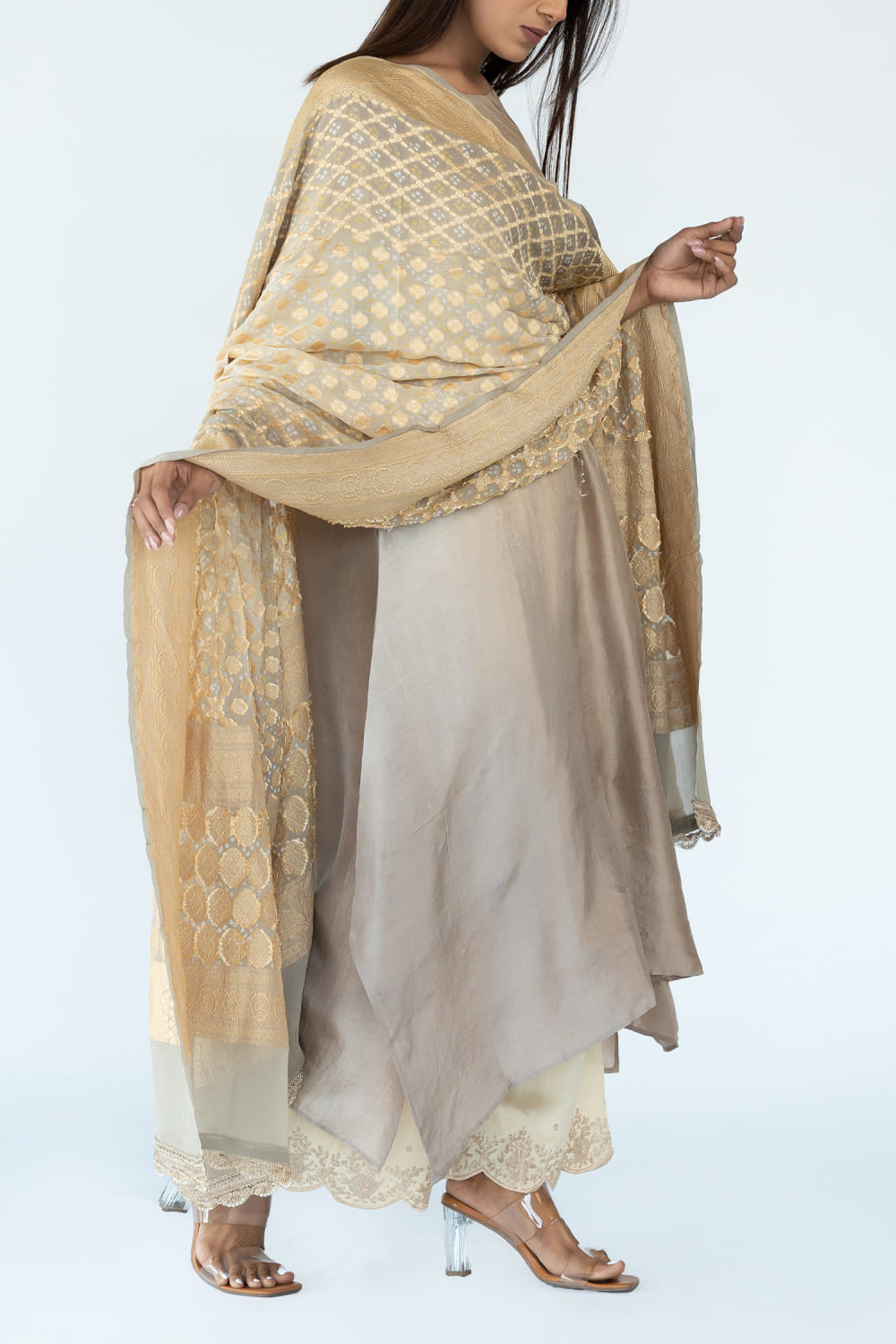 Meghna Panchmatia designs this timeless dress-style kurta embraced in pure silk with an asymmetrical hemline and ombre shade, teaming it with a matching zari woven banarasi bandhani dupatta. Style the look with dhoti pants and juttis for a festive vibe. The pants here are shown for styling purposes only.