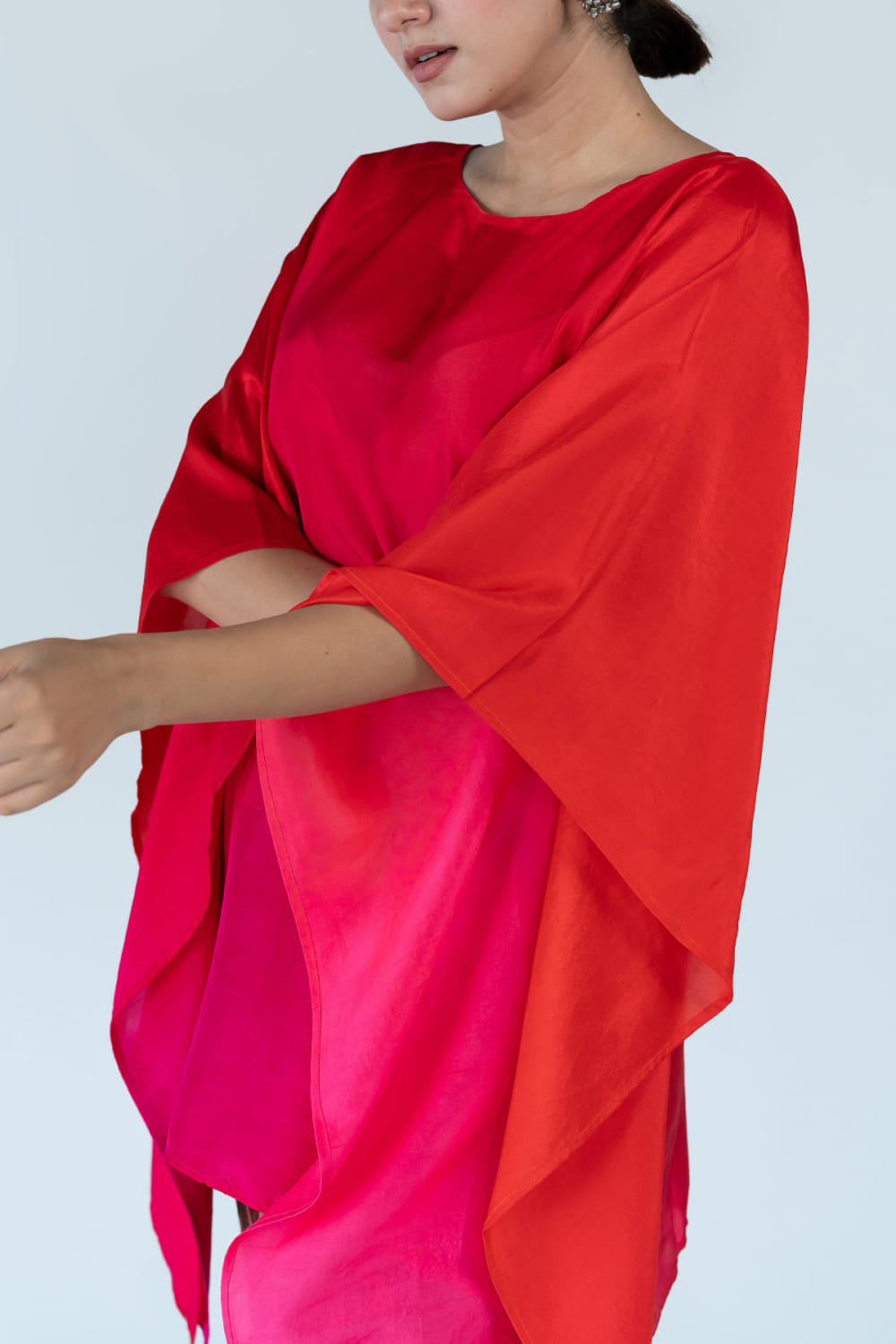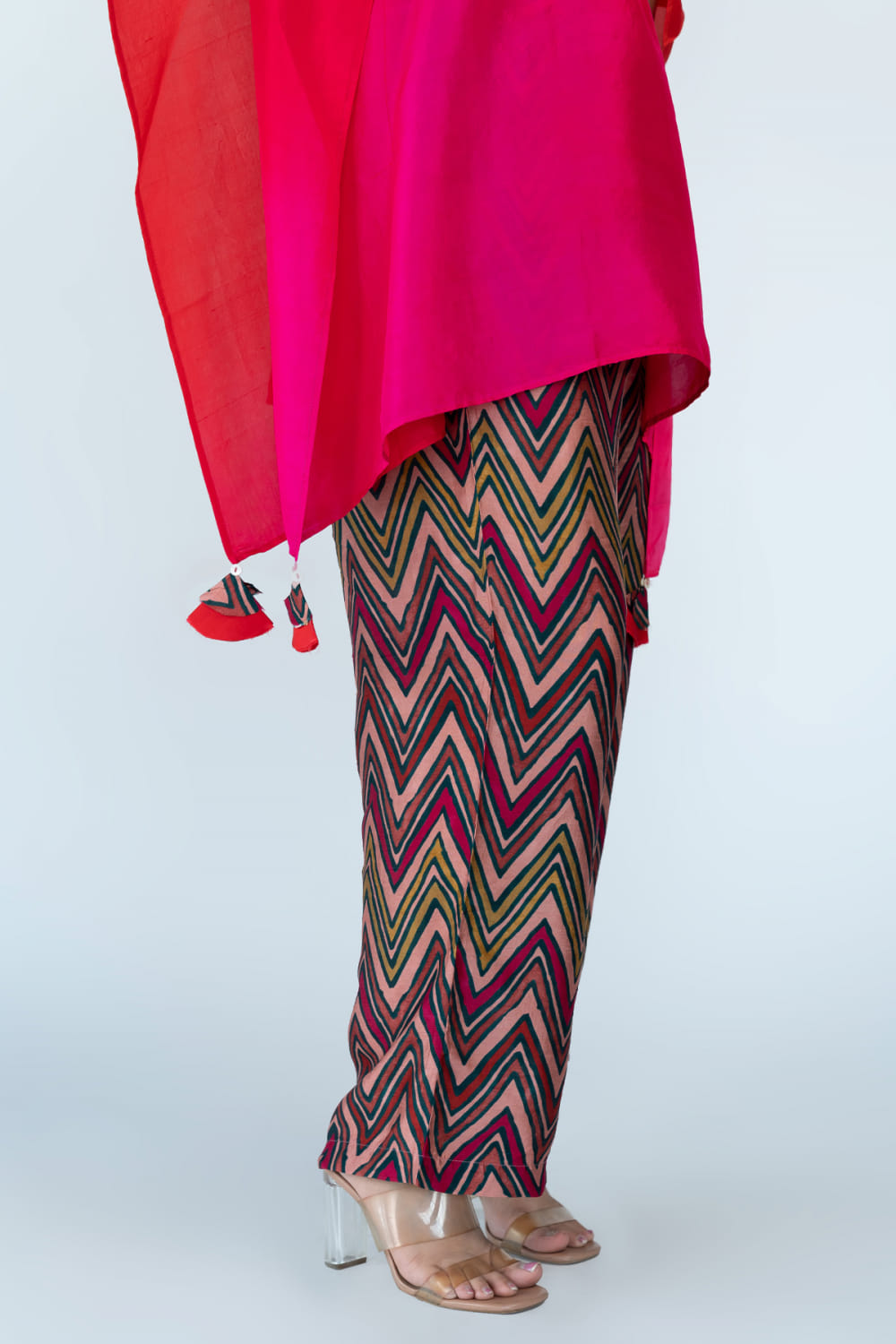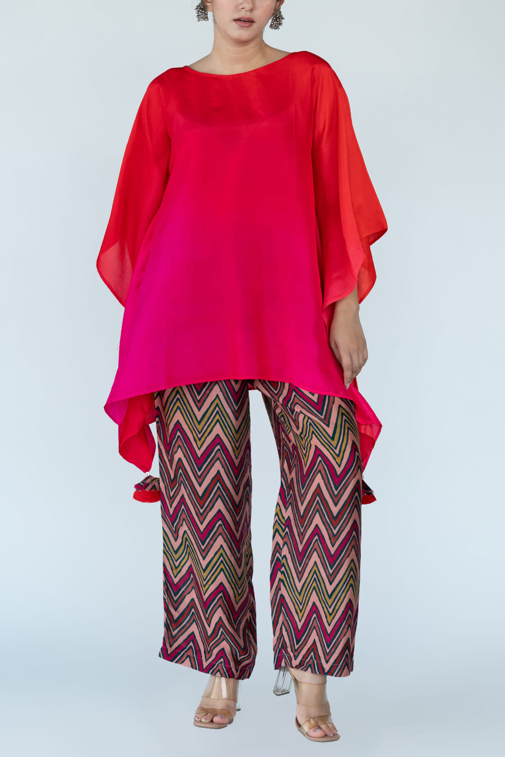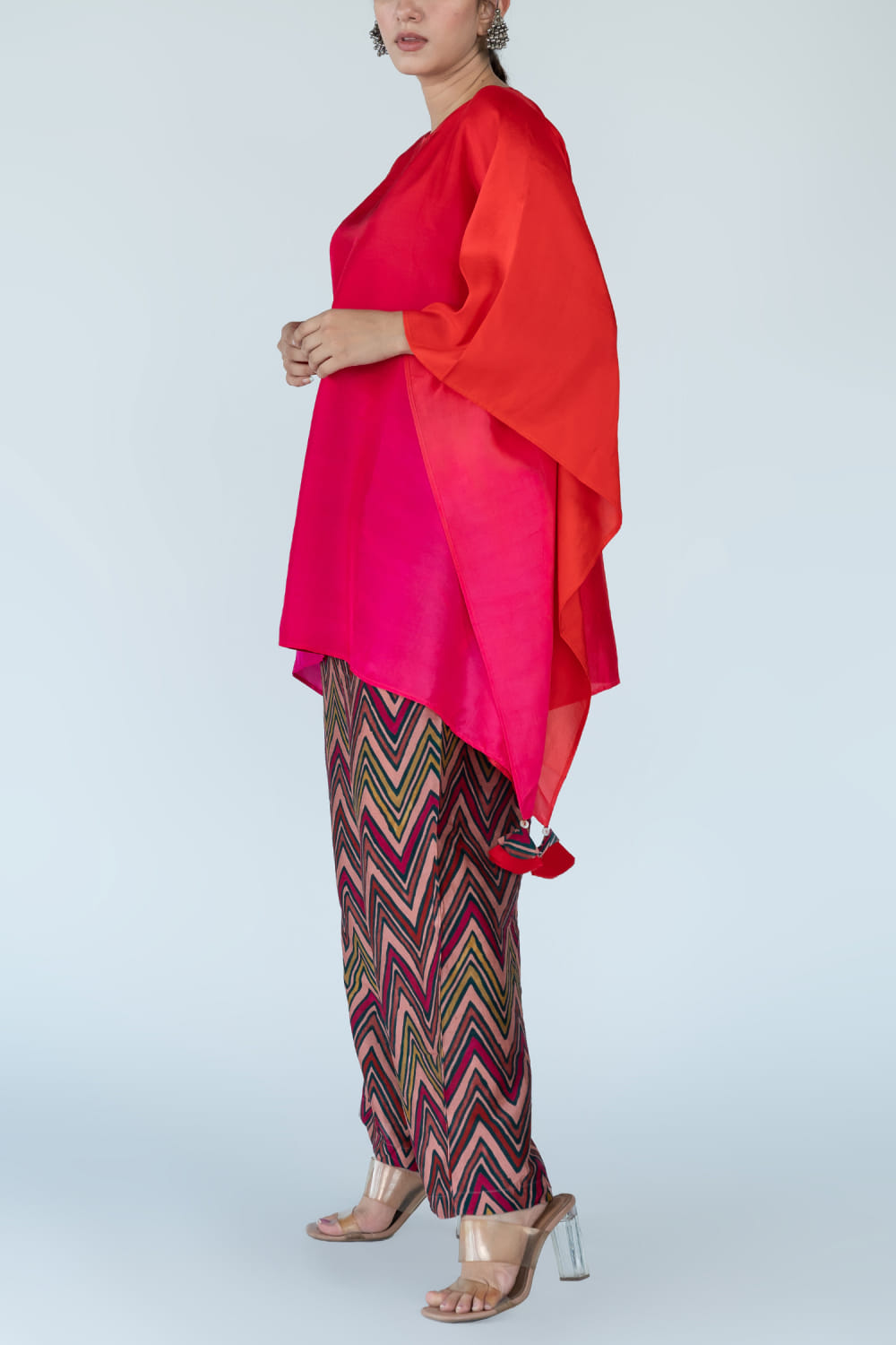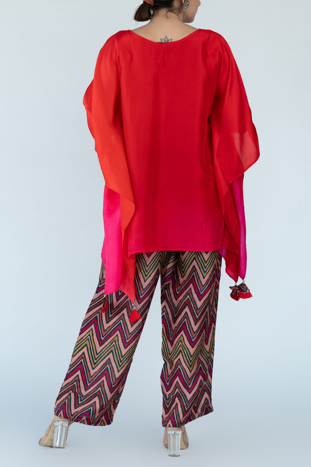 Meghna Panchmatia designs this distinctive kaftan hand-dyed in pure silk with an ombre shade featuring tassel detailing, complementing it with zig-zag block printed pants. Style the look with a layered chain necklace and a multi-finger ring to make a statement.