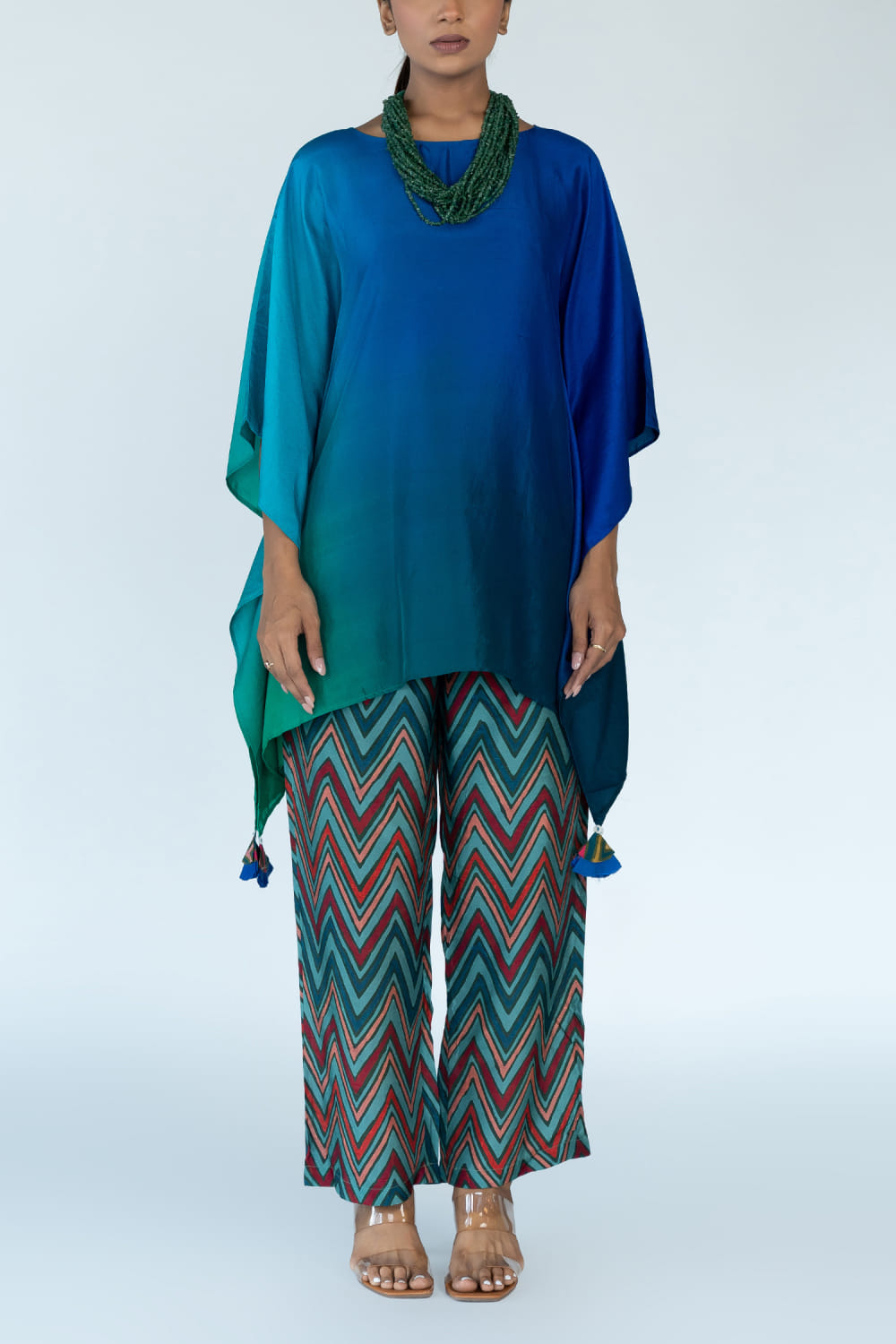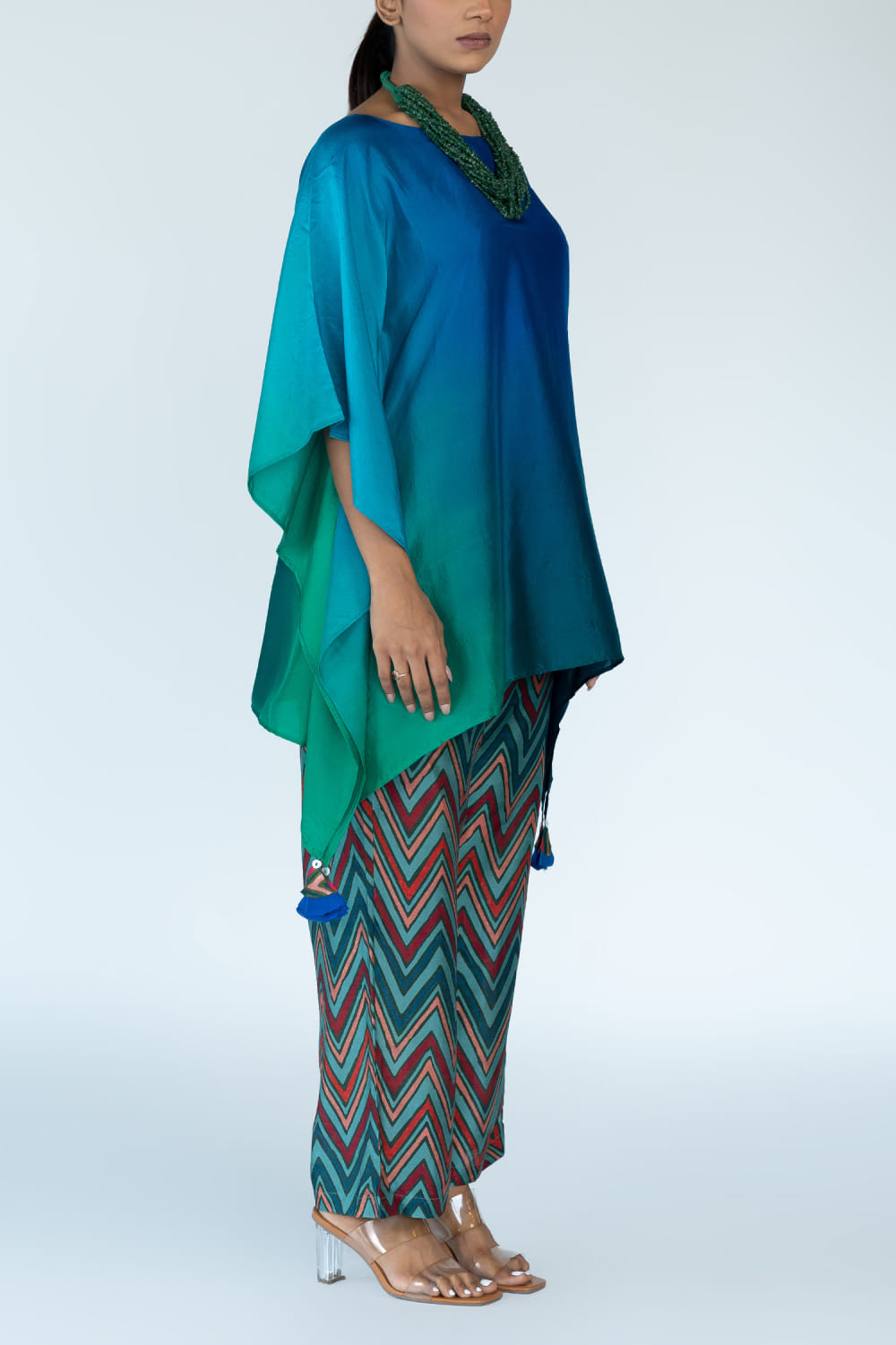 Meghna Panchmatia designs this contemporary kaftan hand-dyed in pure silk with an ombre shade featuring tassel detailing, pairing it with zig-zag block printed pants. Style the look with gemstone earrings and a hand cuff for a resort soiree.
