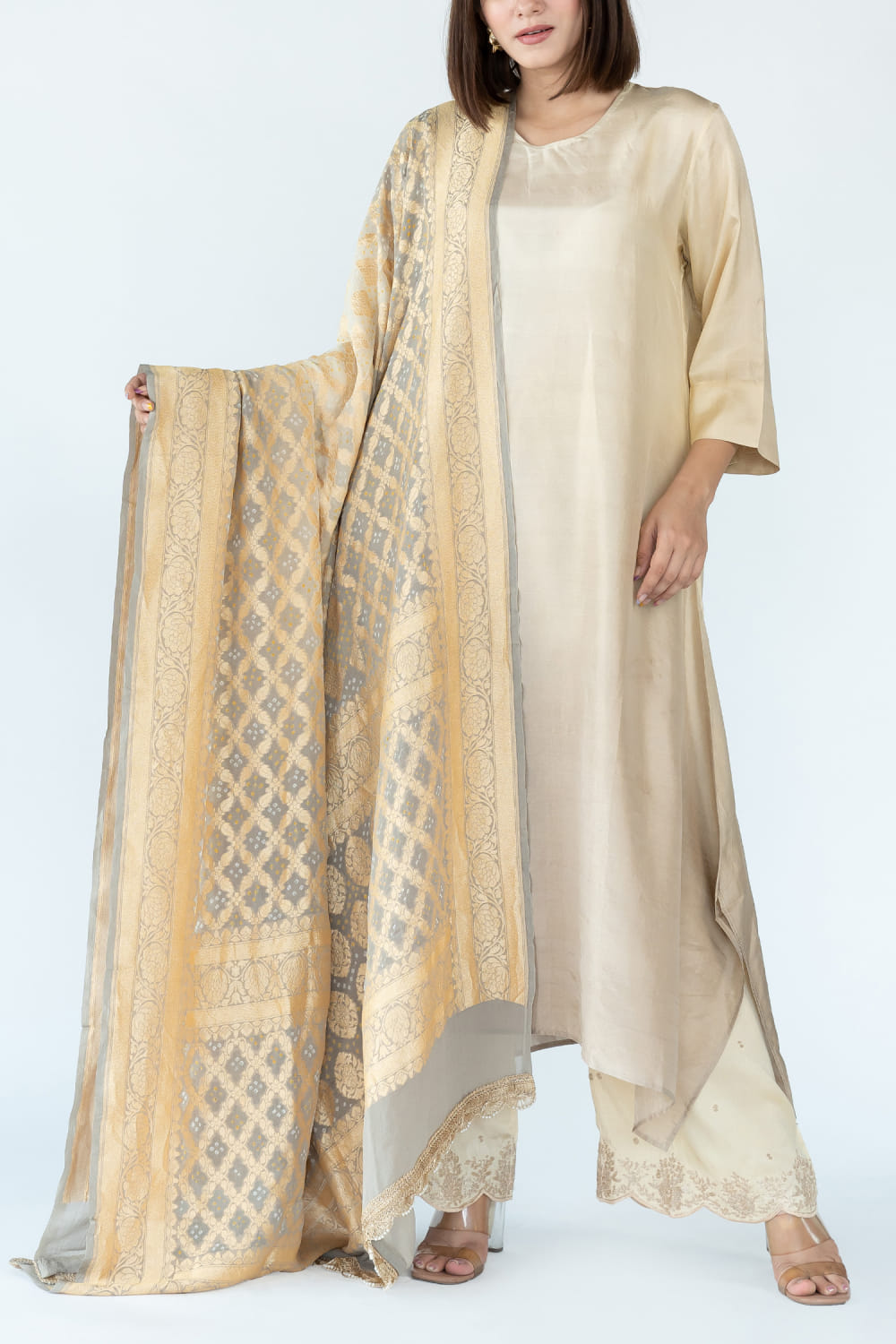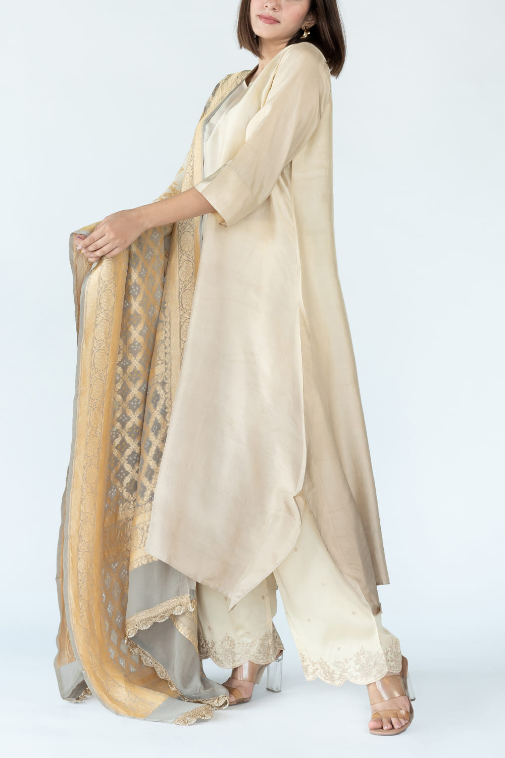 Meghna Panchmatia designs this classic dress-style kurta embraced in pure silk with an asymmetrical hemline and ombre shade, pairing it with a matching zari woven banarasi bandhani dupatta. Style the look with salwar pants and jhumkas for intimate festivities. The pants here are shown for styling purposes only.