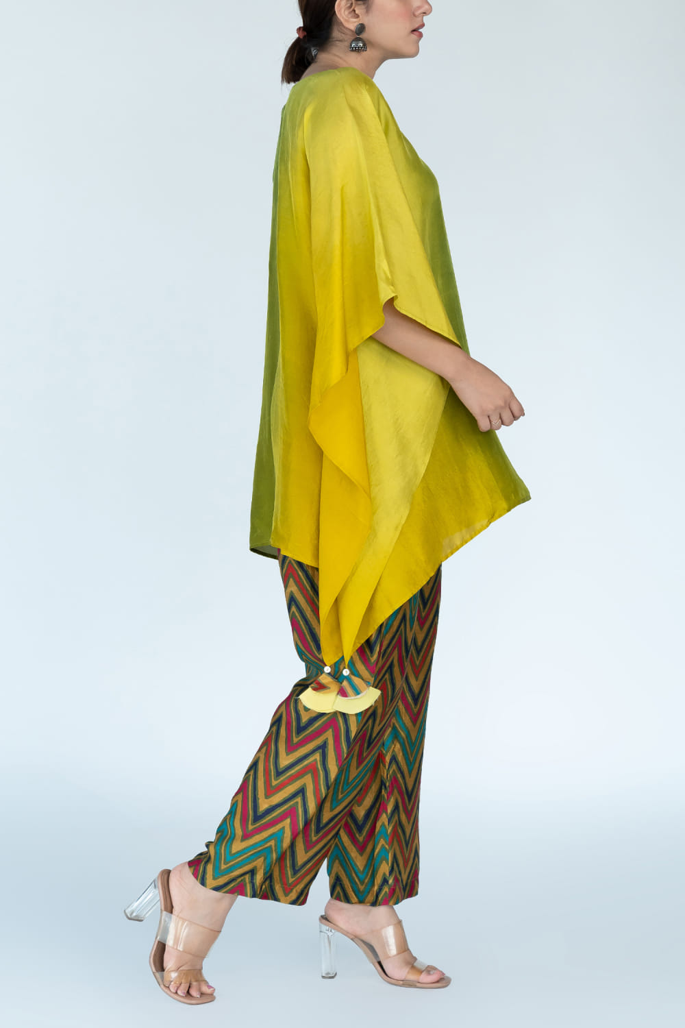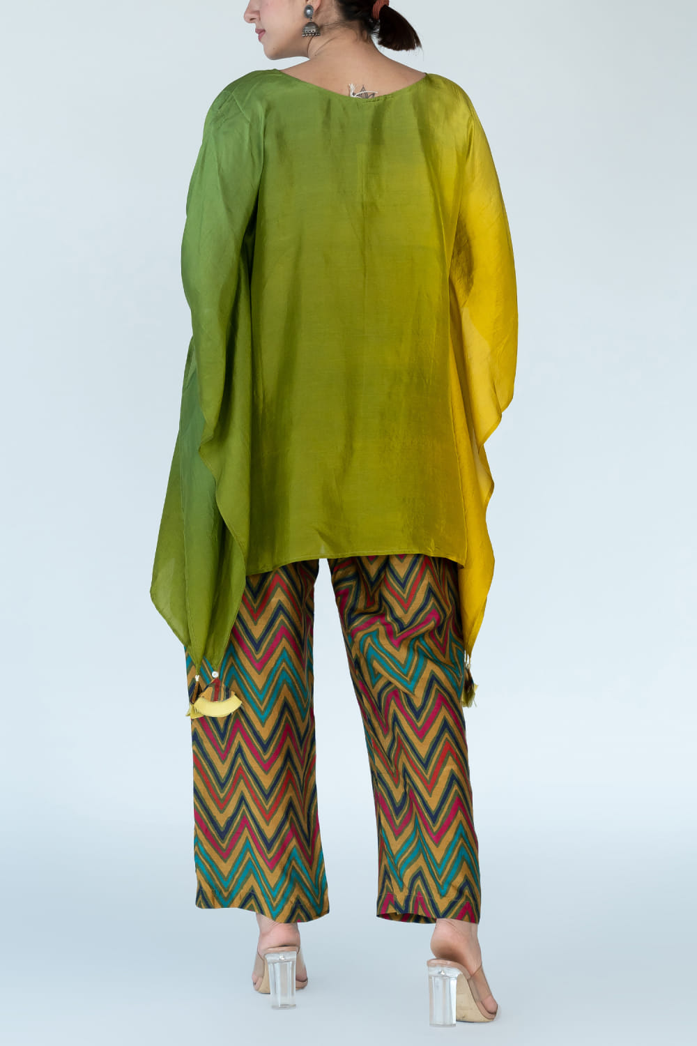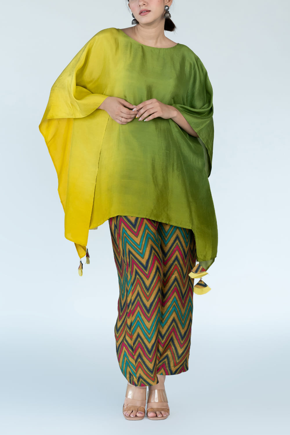 Meghna Panchmatia designs this ultra-stylish kaftan hand-dyed in pure silk with an ombre shade featuring tassel detailing, teaming it with zig-zag block printed pants. Style the look with embellished hoops and a sling bag for a stylish appeal.