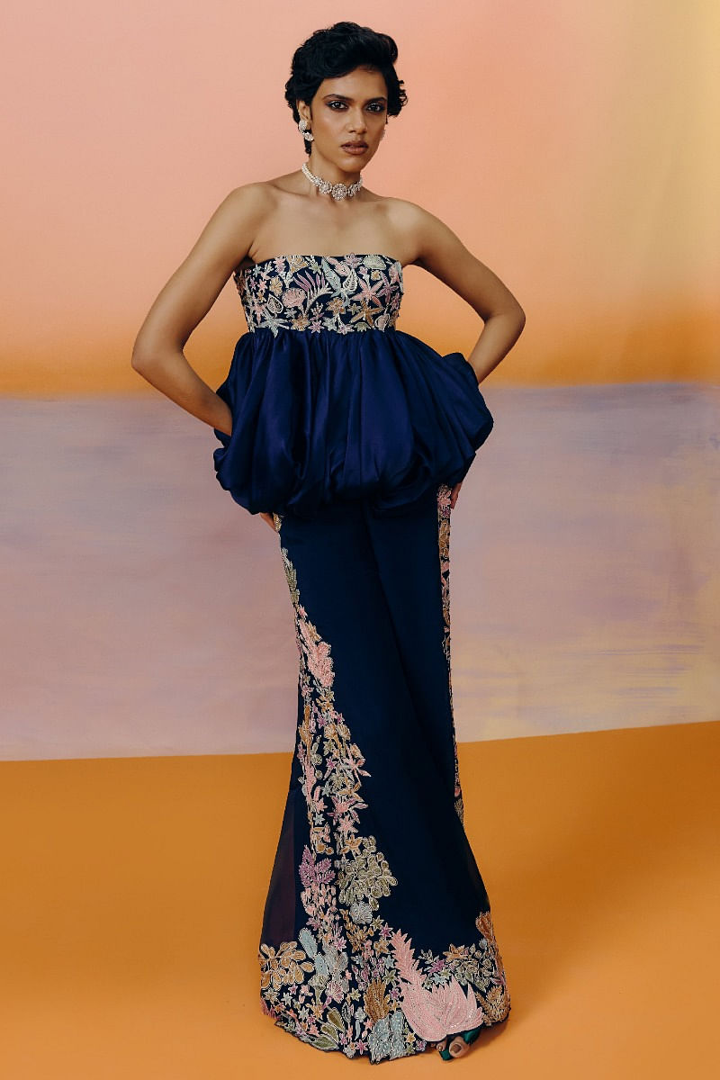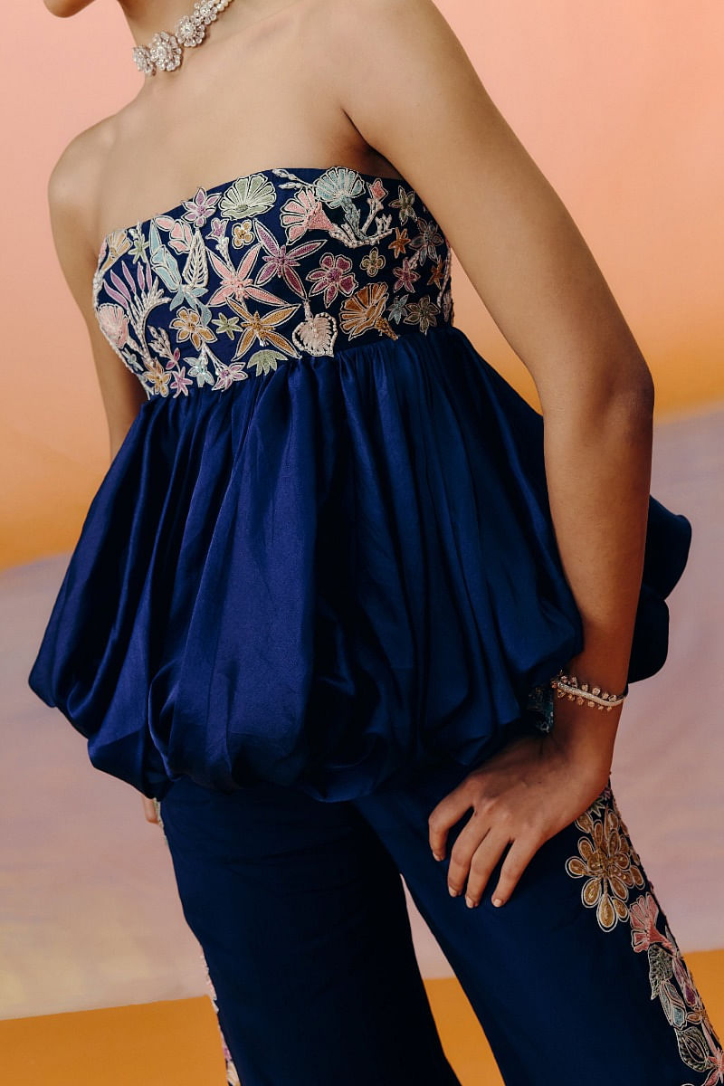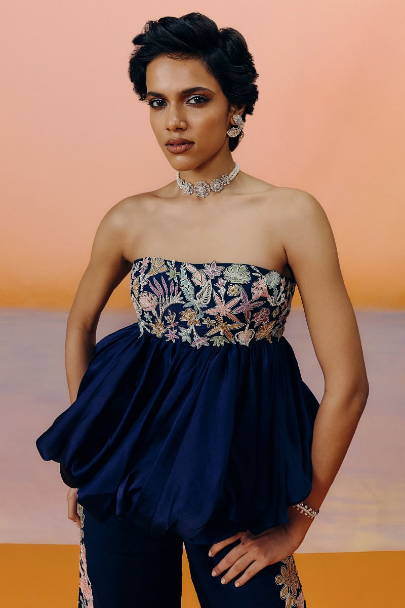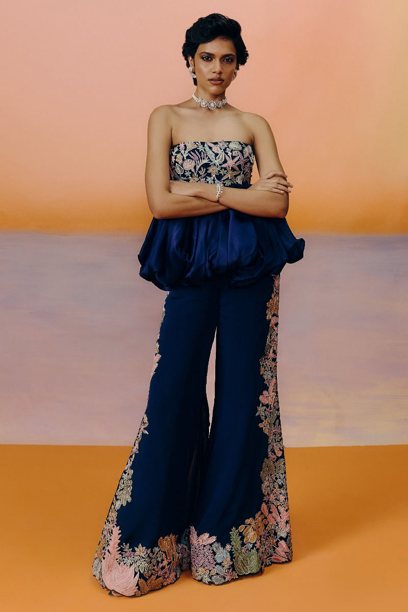 Mishru designs this glamour-laced, bubble-hem top crafted in organza, adorned with wildflower appliqué embroidery, teamed with pants. Style the look with crystal embellished heels for a festive gathering.