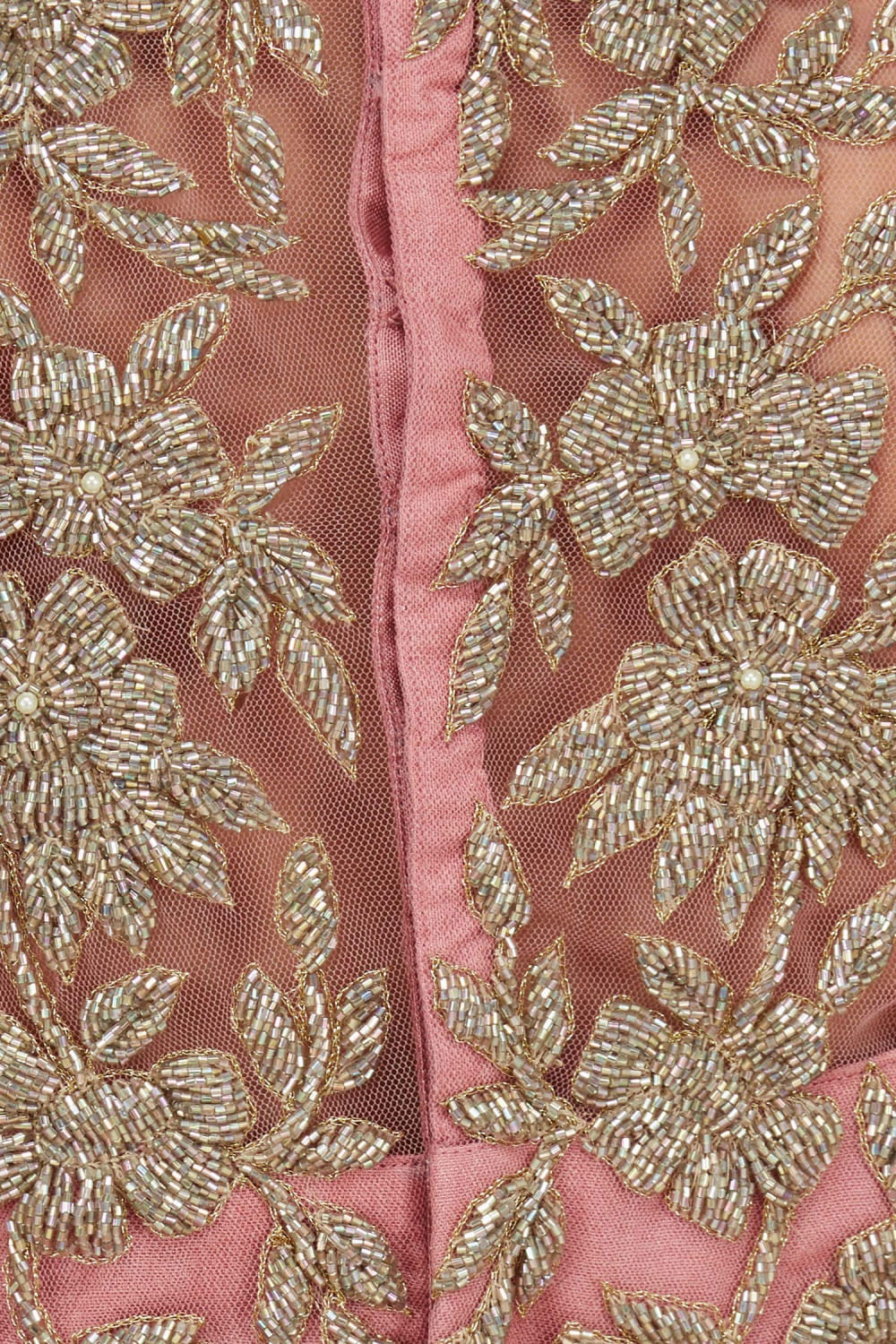 Mrunalini Rao designs is a dainty mix of floral prints, charming embroideries and flowy silhouettes featuring a pink printed organza lehenga paired with pink cutdana blouse and an embroidered dupatta. Style the look with a statement ear cuff and capsule clutch.