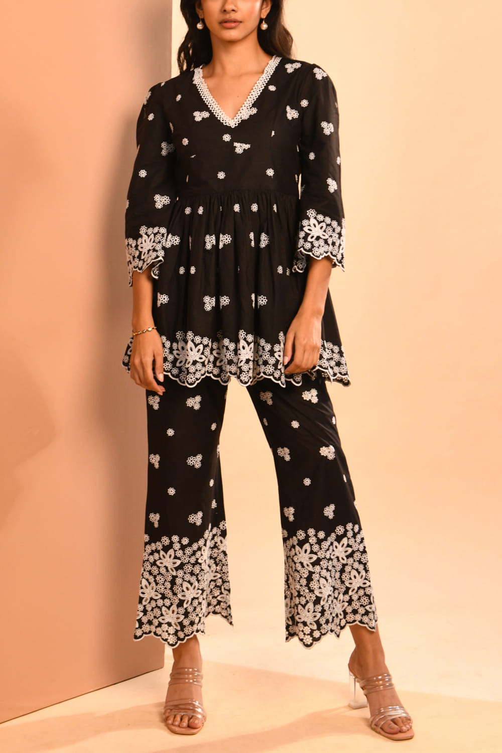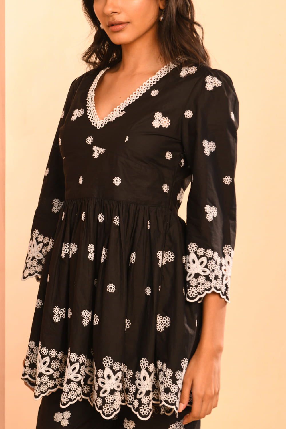 Black floral cutwork peplum kurta set