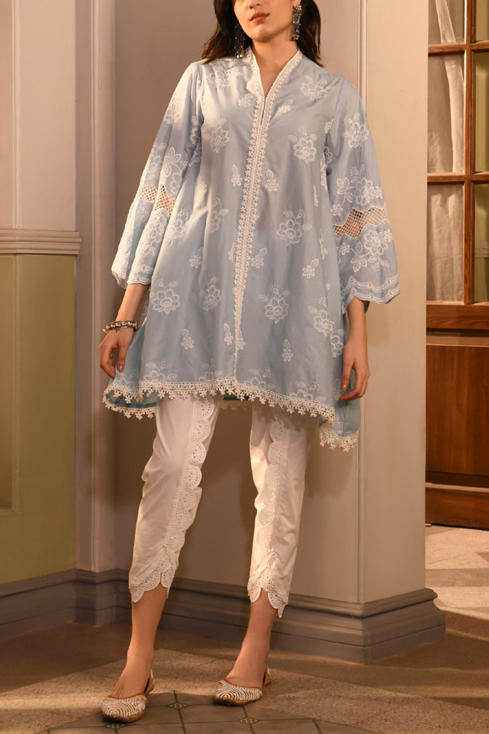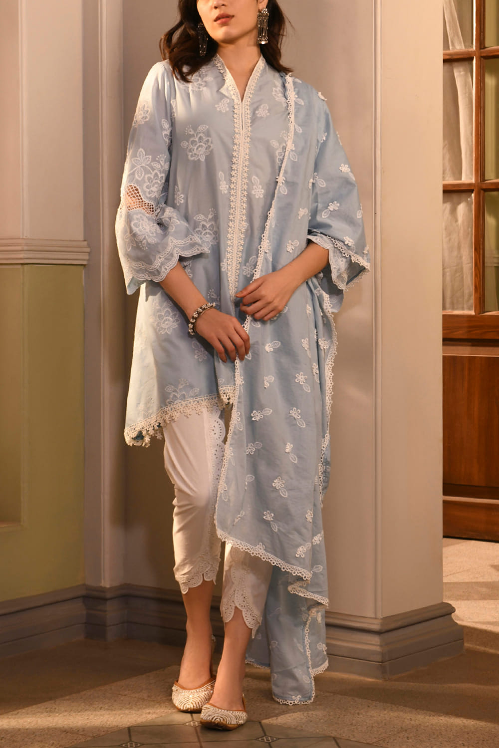 Blue floral embroidered A-line kurta set