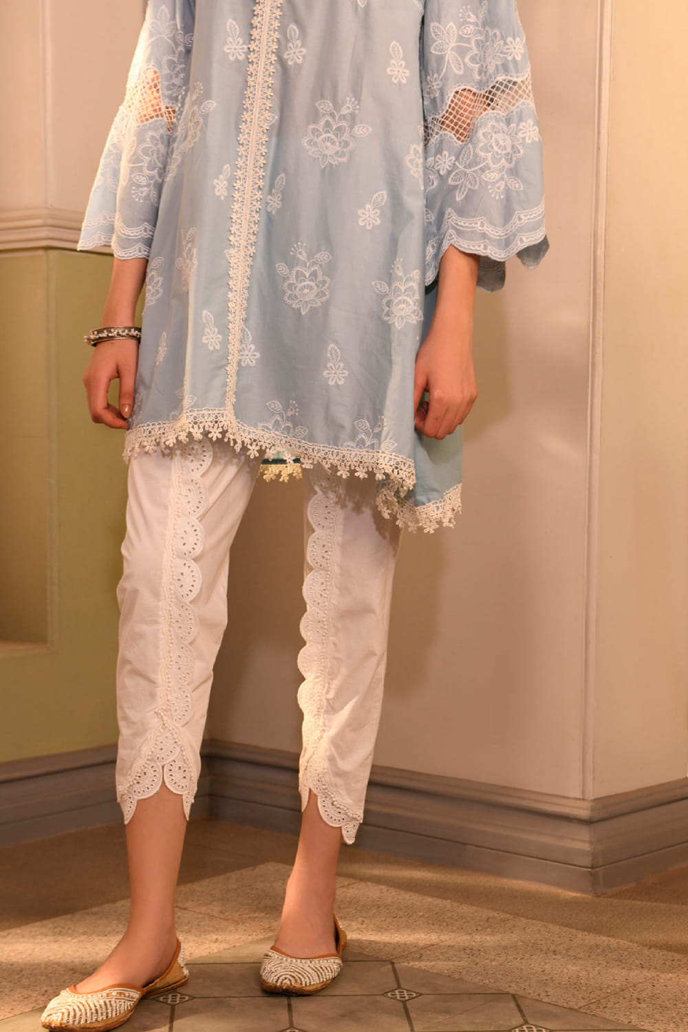 Mulmul designs this mesmerising A-line kurta in mulmul cotton encapsulated with delicate thread embroidery detailing in floral patterns featuring a scalloped hem and intricate lace work in an asymmetrical silhouette. It is teamed with contrasting tulip pants and a matching dupatta. Style the look with chunky hoops and a sling bag for an engagement function.