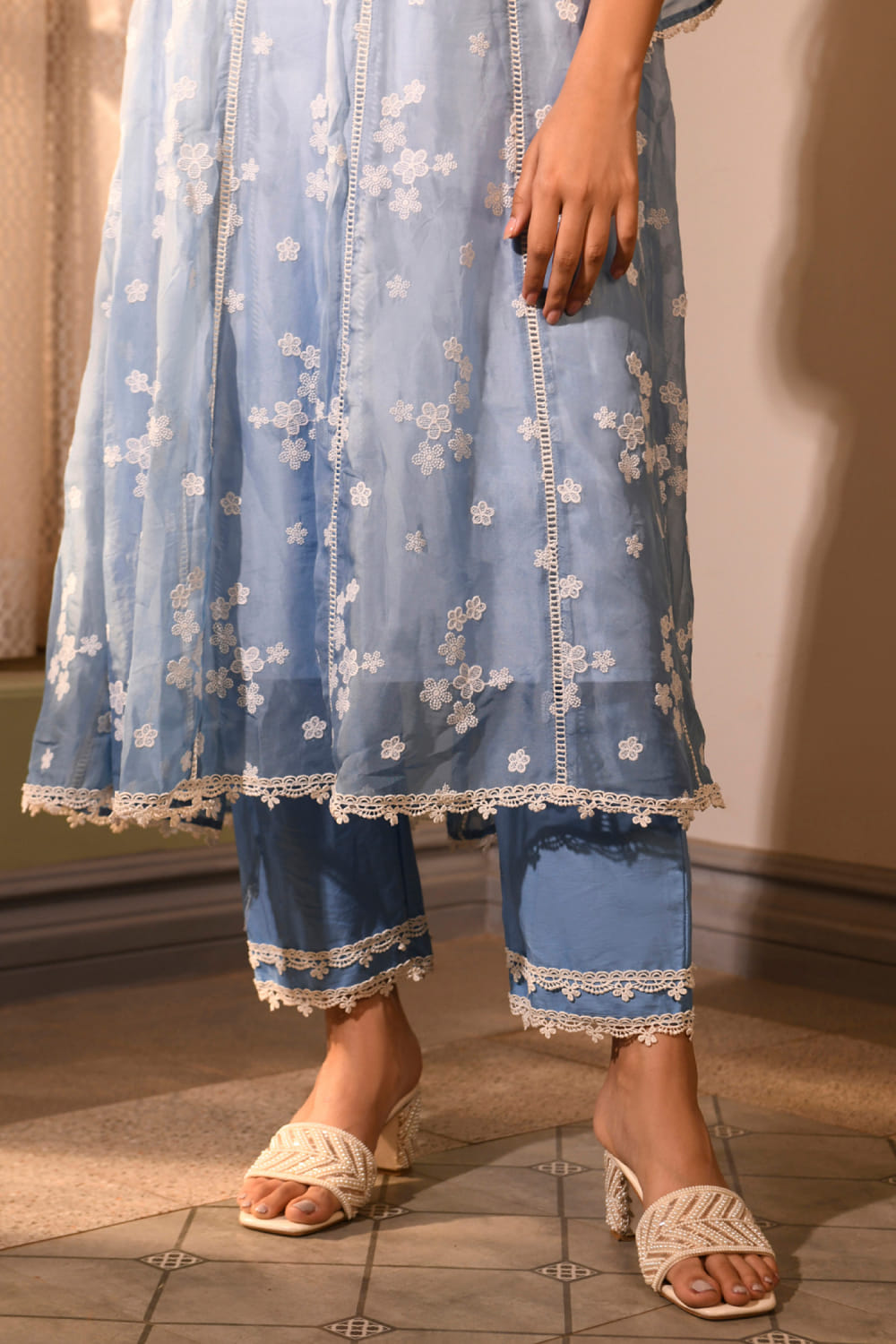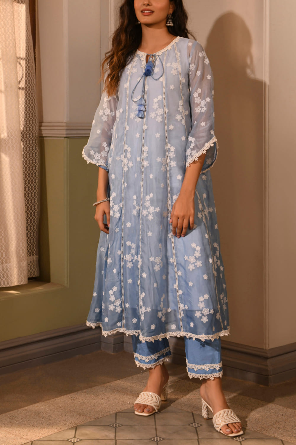 Mulmul designs this captivating anarkali kurta customised in tencel luxe with thread embroidery detailing in floral patterns featuring tie-up detailing and a subtle ombre shade. It is teamed with matching pants. Style the look with chunky hoops and block heels for a festive update.