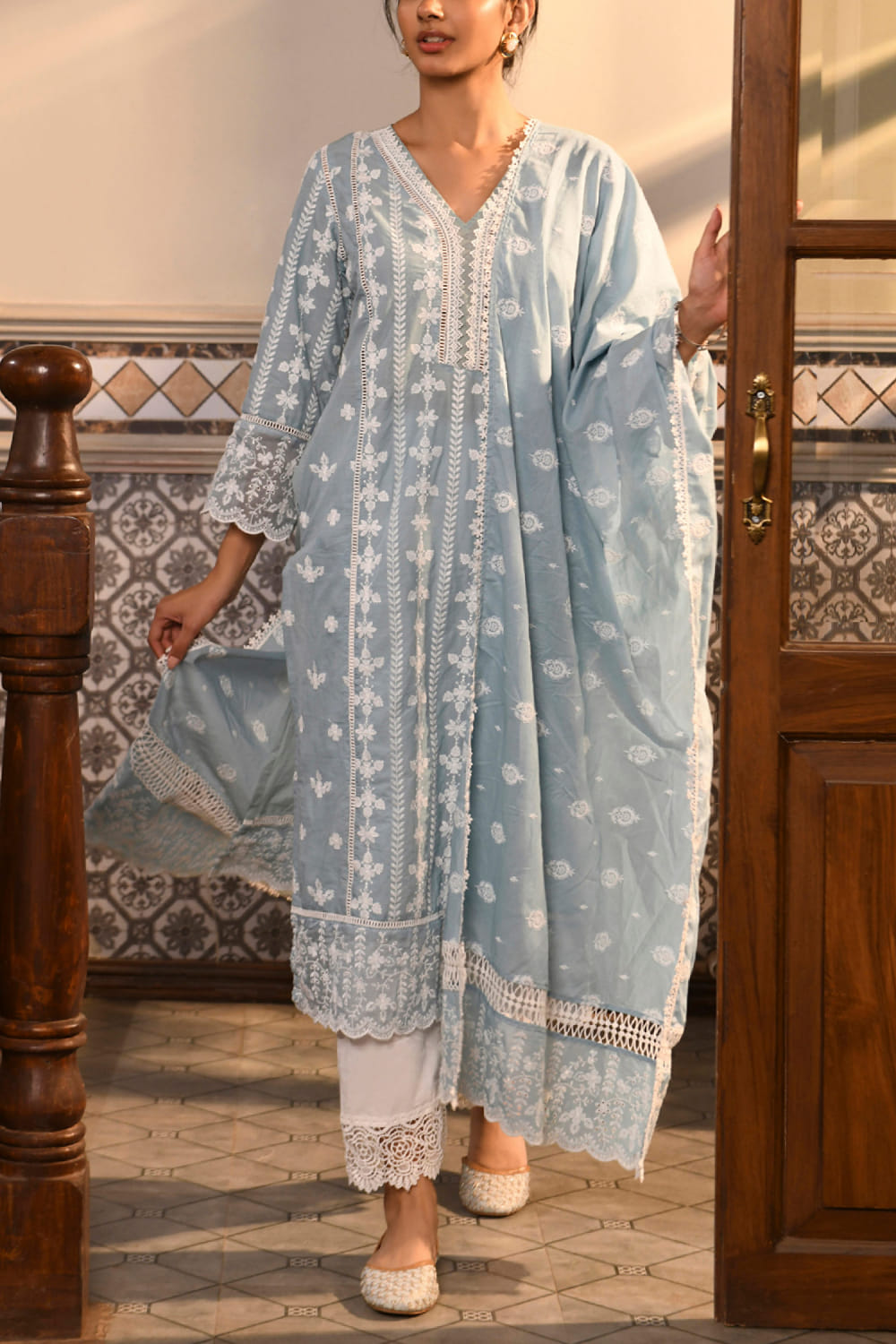 Mulmul designs this occasion-ready kurta customised in mulmul cotton with delicate thread embroidery detailing in floral patterns featuring a scalloped hem and intricate lace work, pairing it with contrasing pants and a matching dupatta. Style the look with a polki ring and mules for a mesmerising appeal.
