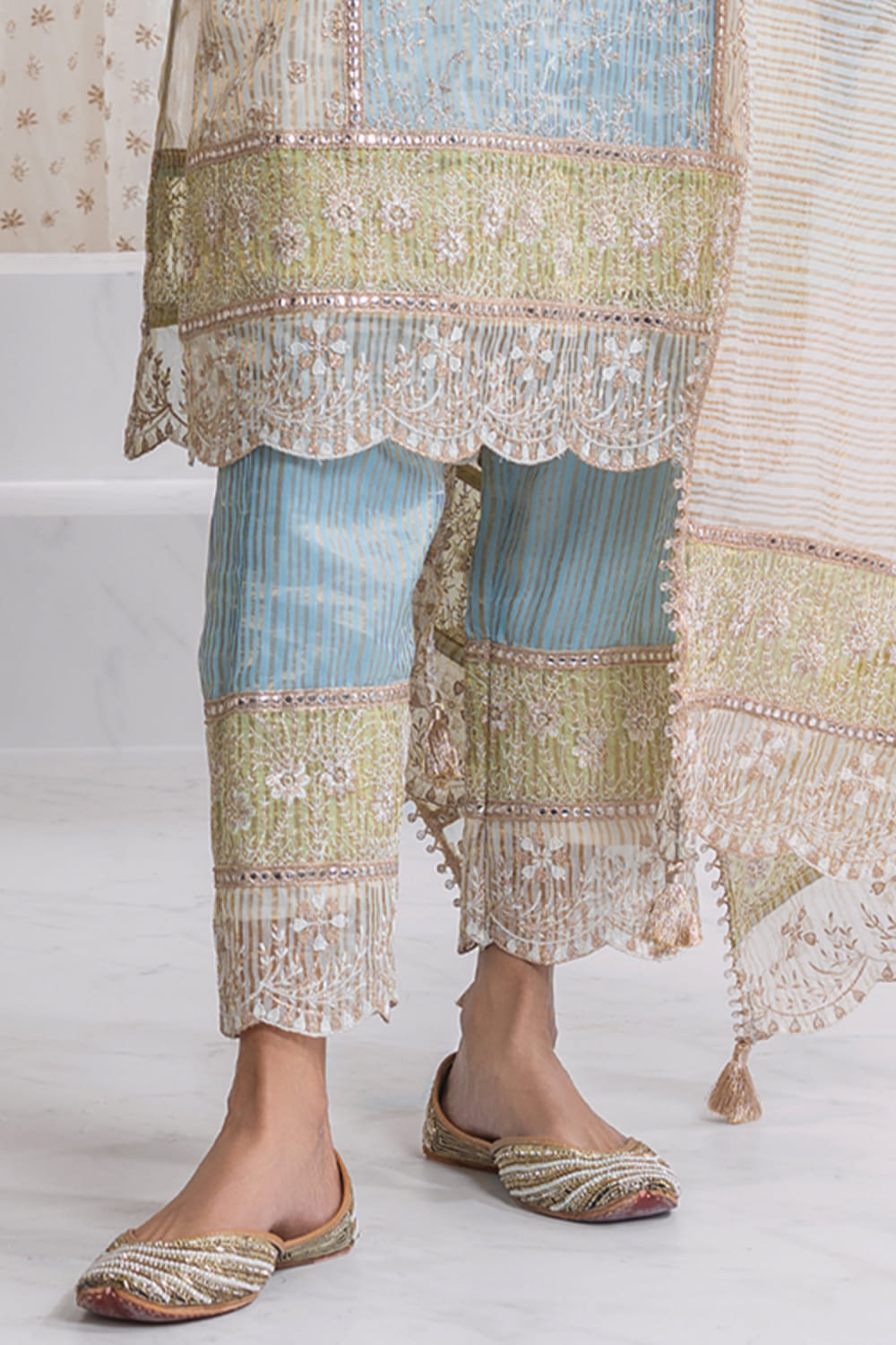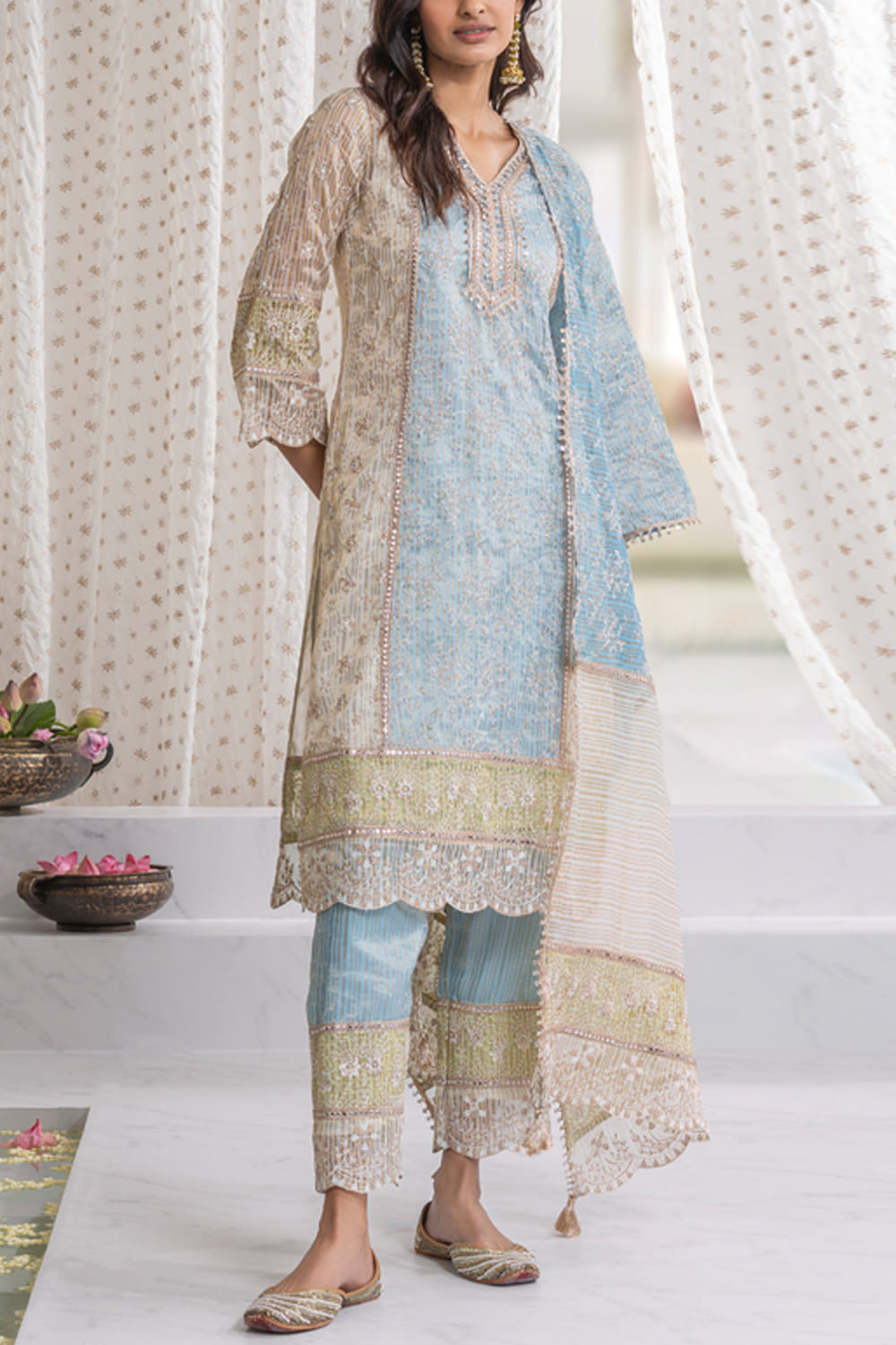 Mulmul designs this occasion-worthy kurta enriched with stripes, scalloped hem, sequins, mirror work, gota detailing, zari and thread embroidery in floral patterns, complementing it with matching pants. Style the look with a dupatta and pearl drop earrings for a statement appeal.