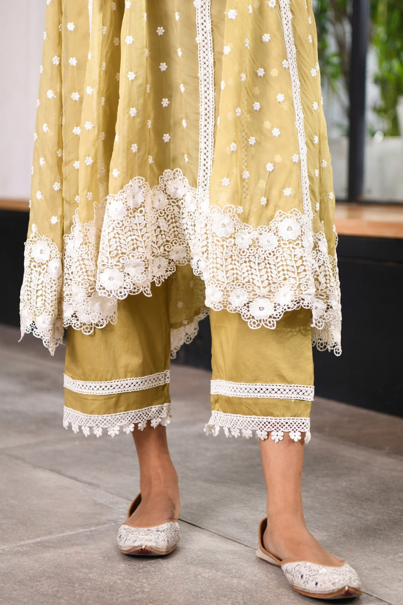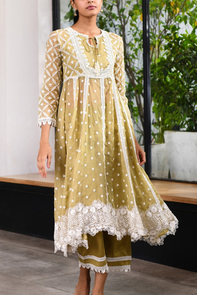 Mulmul designs this new-age short anarkali customised with a keyhole neckline, lace work, pearl tassel detailing and thread embroidery in floral motifs and leaf patterns, teaming it with matching lace-adorned straight pants. Style the look with an embroidered potli bag and a matching dupatta for a traditional affair. The dupatta here is shown for styling purposes only.