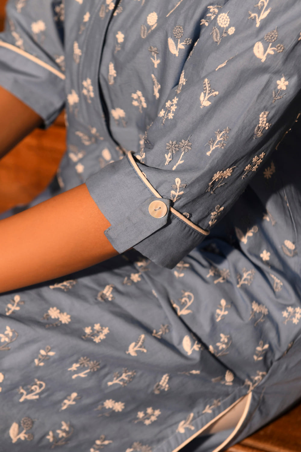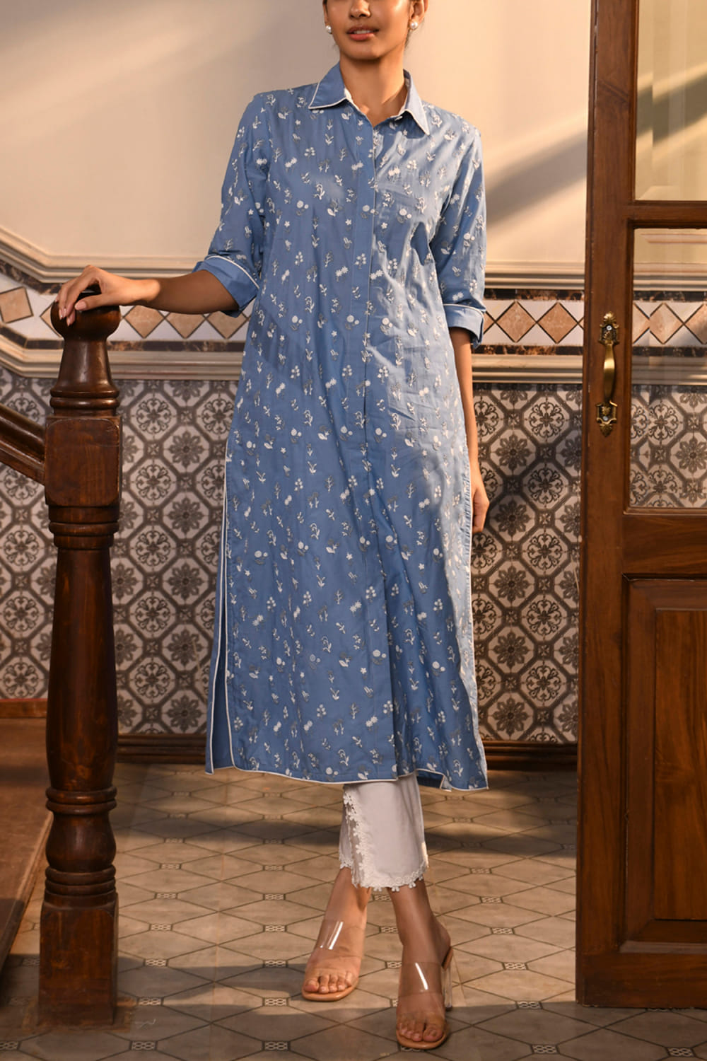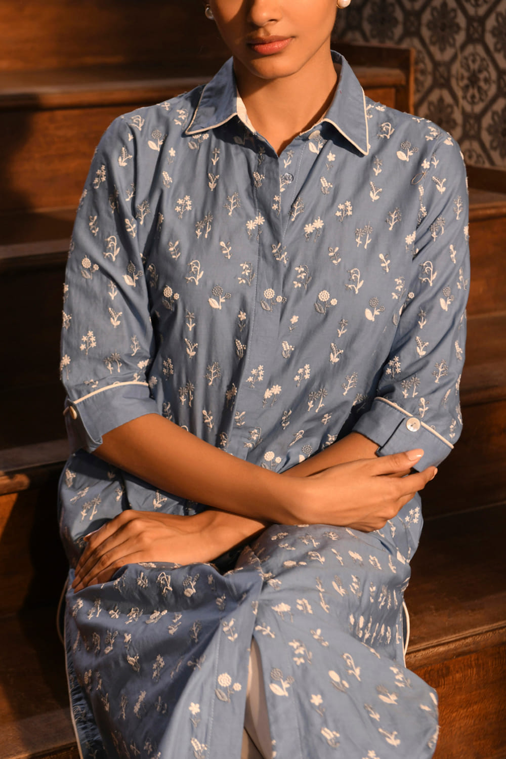 Mulmul designs this collar kurta rendered in mulmul cotton with embroidery detailing in floral motifs, pairing it with contrasting tulip pants. Style the look with oversized hoops and a capsule clutch for a formal occasion.