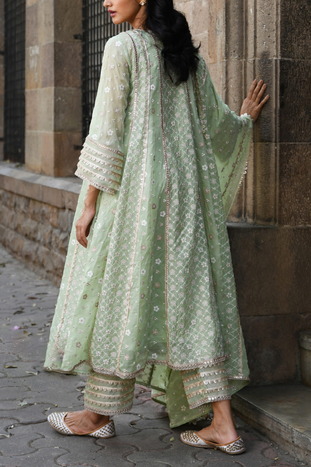 Mulmul designs this gorgeous anarkali-style kurta rendered in tencel luxe organza with intricate gota work and delicate embroidery in floral patterns featuring panel detailing. It is paired with matching pants. Style the look with a polki ring and block heels for an occasion.