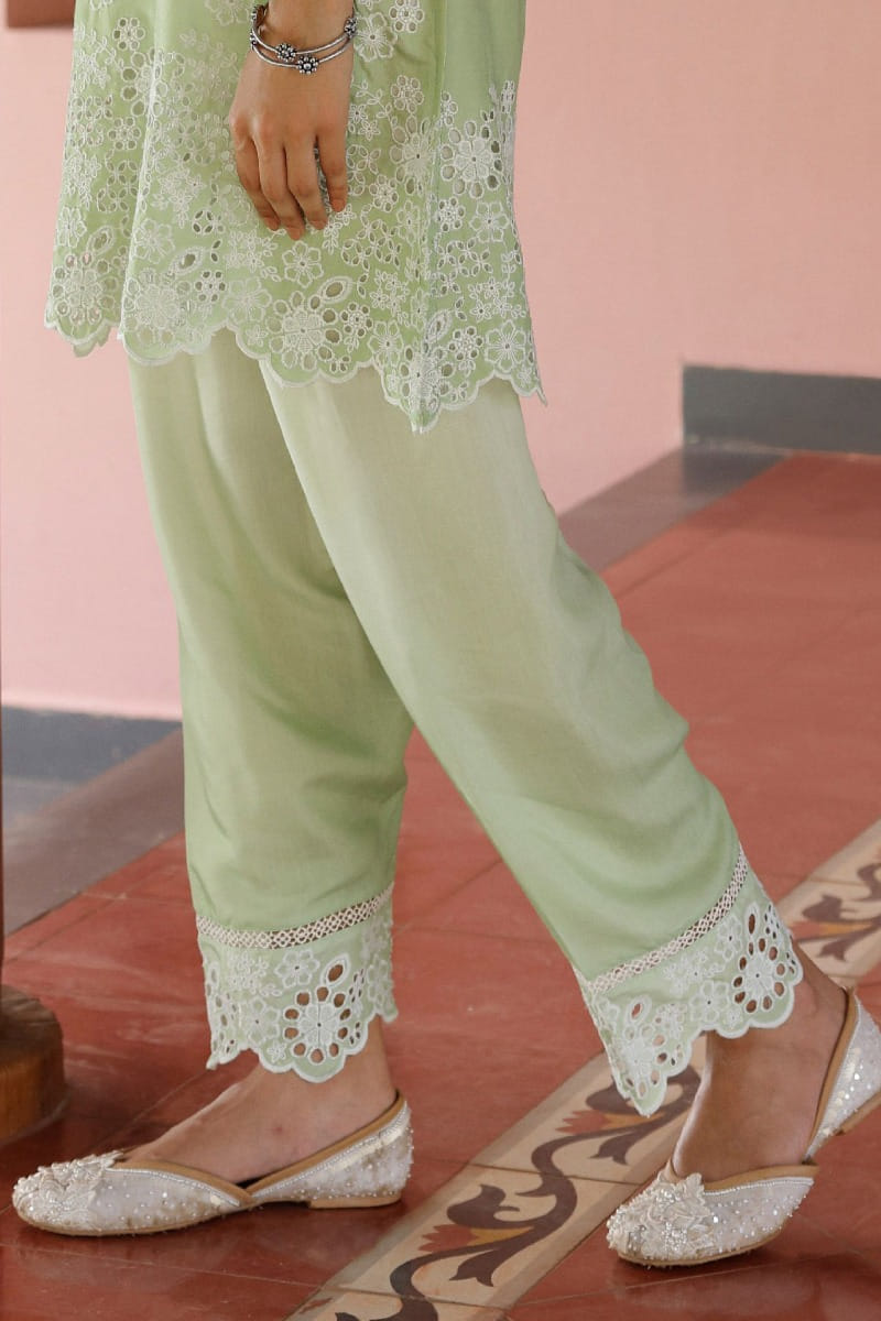 Mulmul designs this everyday staple kurta customised in cupro lawn with floral embroidery and scalloped edges, complementing it with lace-detailed salwar pants. Style the look with jhumkas and juttis for intimate festivities.