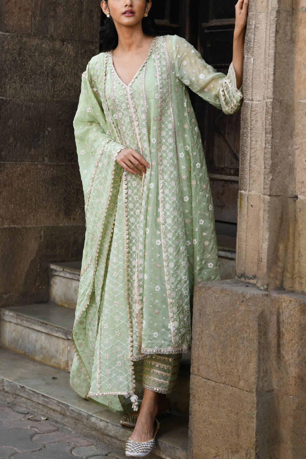 Green floral embroidery panel kurta set