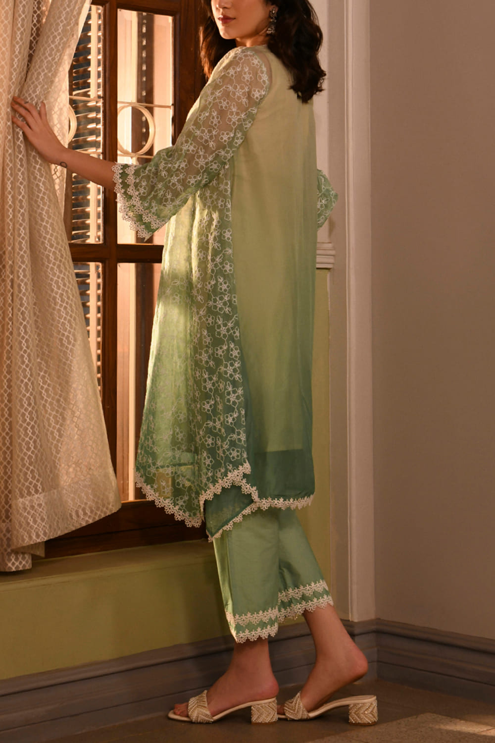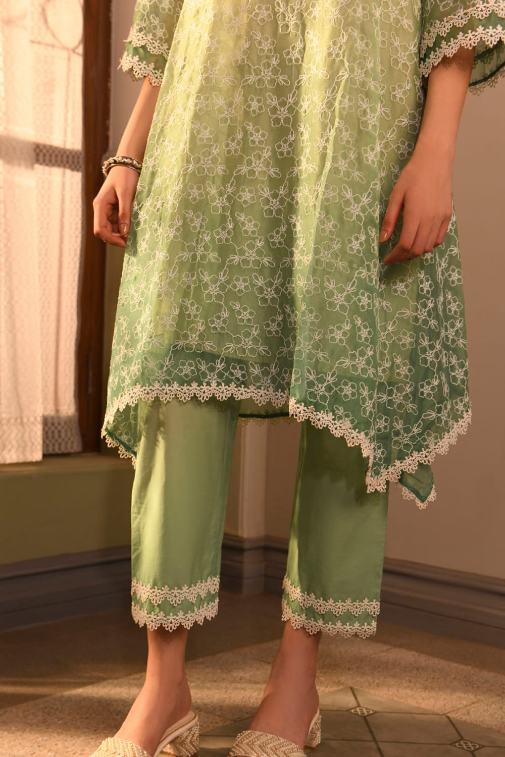 Mulmul designs this striking kurta in mulmul cotton enriched with thread embroidery detailing in floral patterns, lace work and an ombre shade featuring an asymmetrical silhouette. It is teamed with matching pants. Style the look with a capsule clutch and mule heels for festivities.
