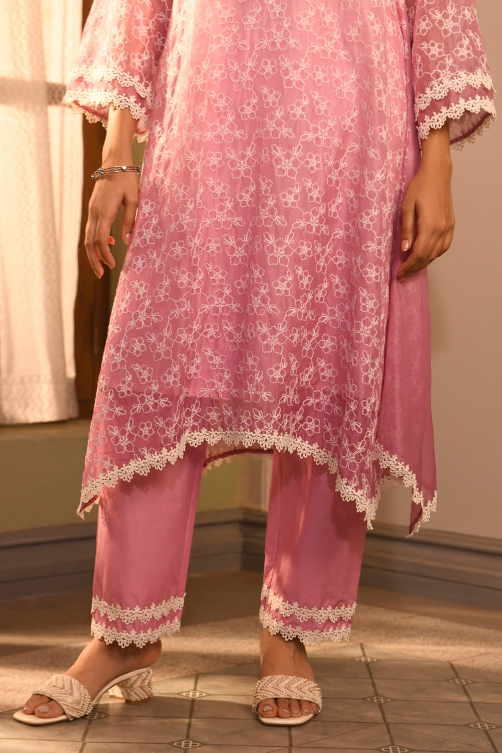 Mulmul designs this everyday-wear kurta rendered in mulmul cotton with thread embroidery detailing in floral patterns and lace work featuring an asymmetrical silhouette. It is teamed with matching pants. Style the look with a saddle bag and wedges for a laid-back outing.