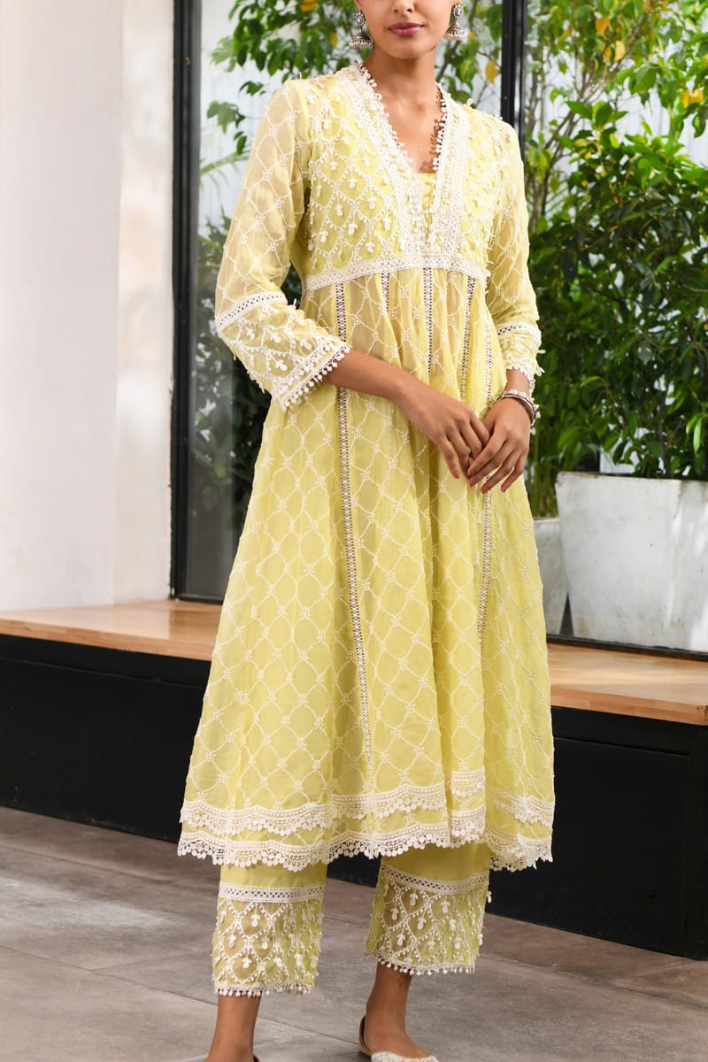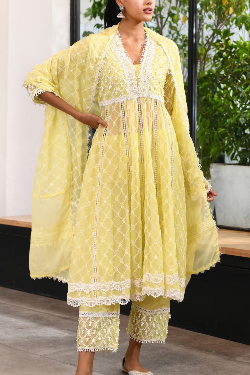 Mulmul designs this summer-ready short anarkali enriched with lace work, tassel detailing and thread embroidery in geometric patterns featuring a scalloped hemline, teaming it with matching embroidered straight pants and matching embroidered dupatta. Style the look with pearl earrings and embroidered mules.