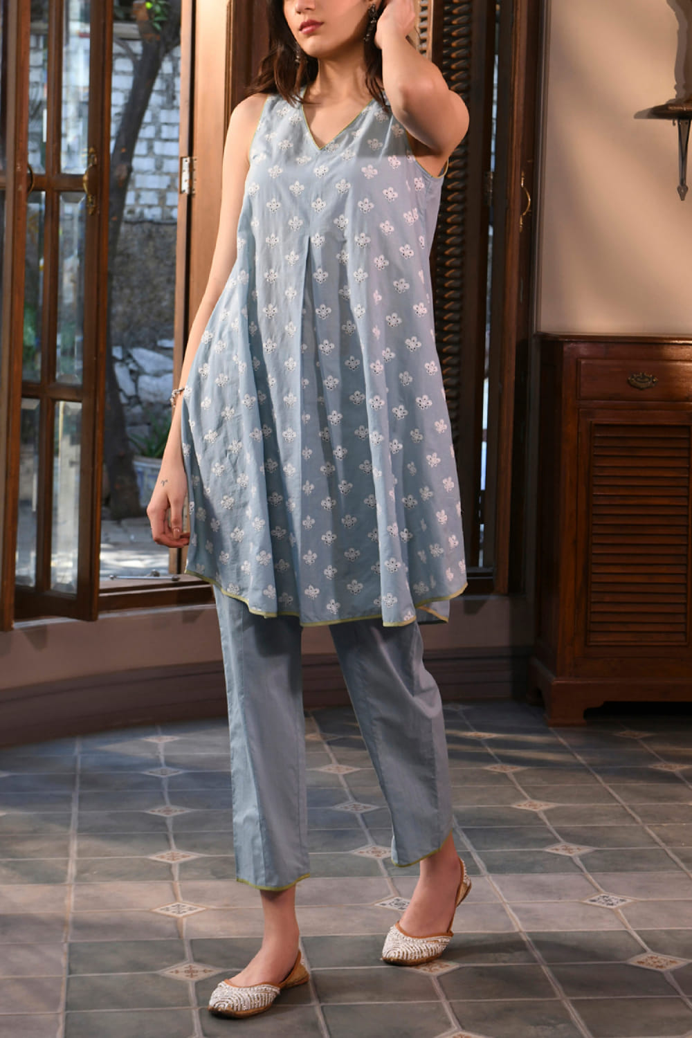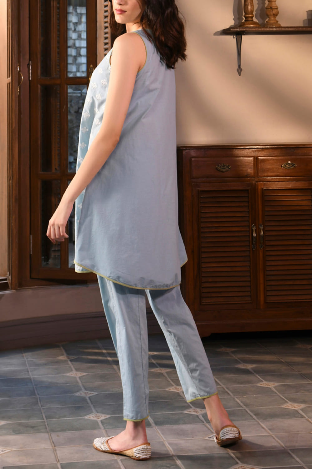 Mulmul designs this comfy sleeveless kurta crafted in mulmul cotton with a V neck and thread embroidery detailing in floral motifs. It is paired with matching narrow pants. Style the look with a box clutch and wedges for an informal lunch.