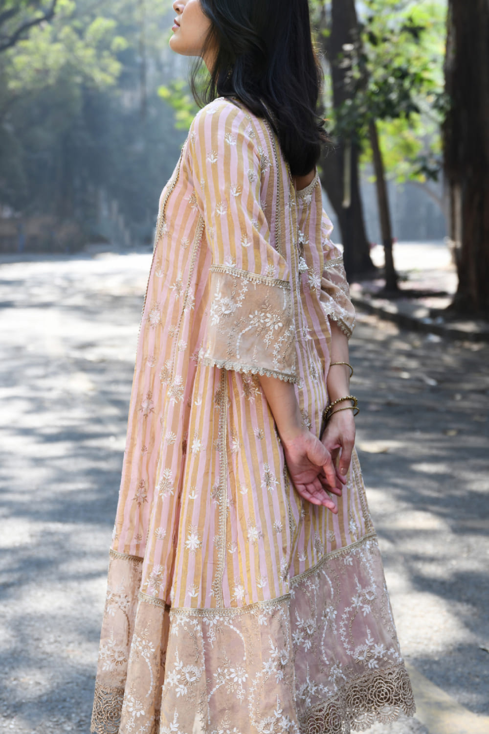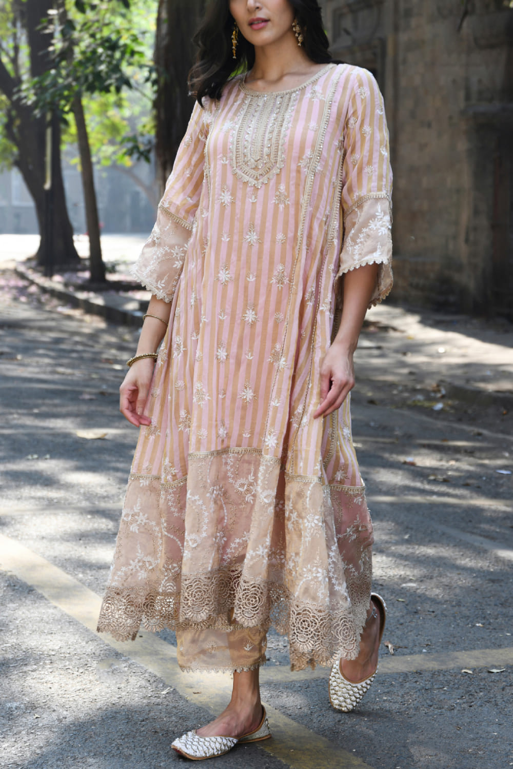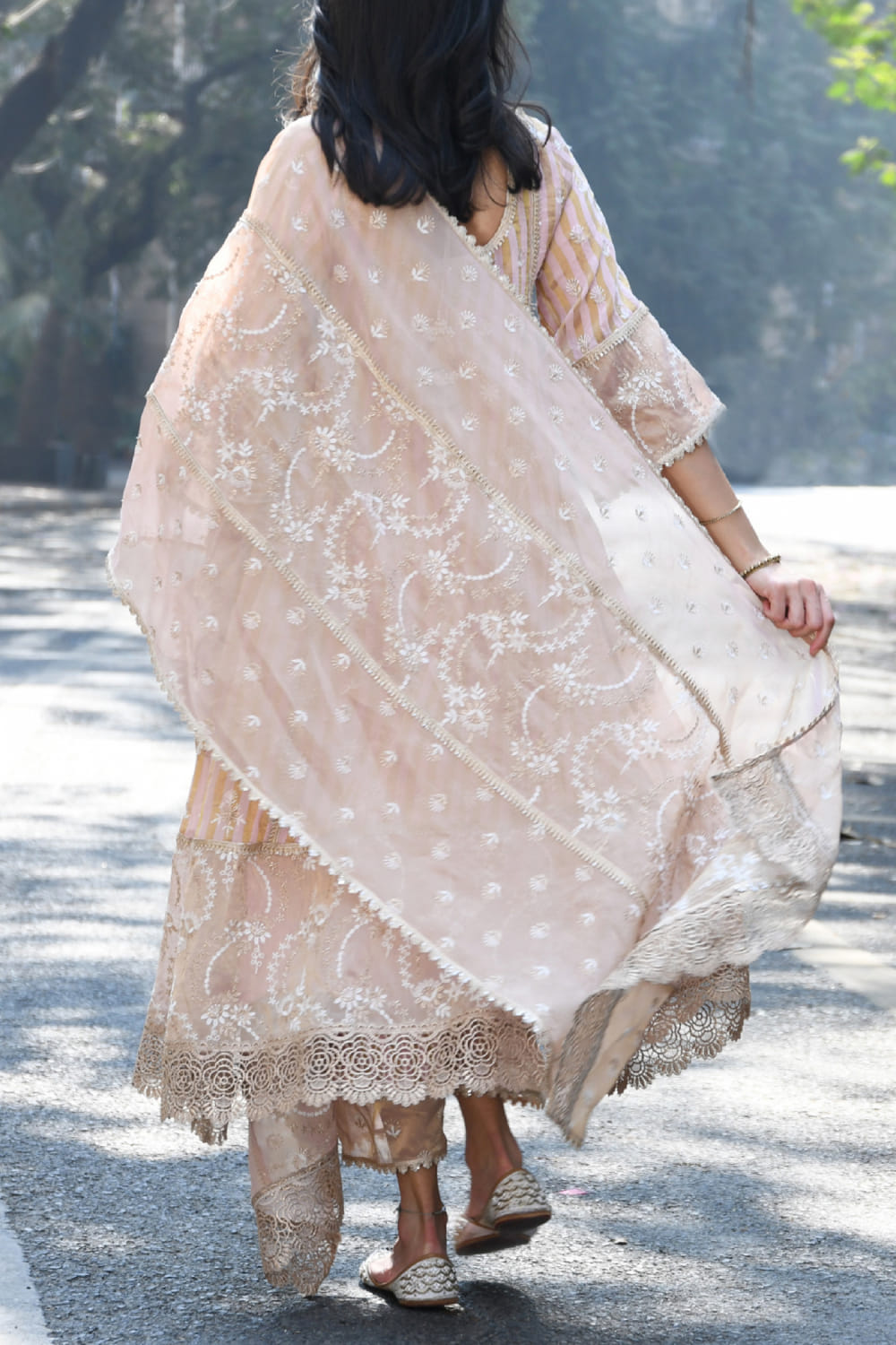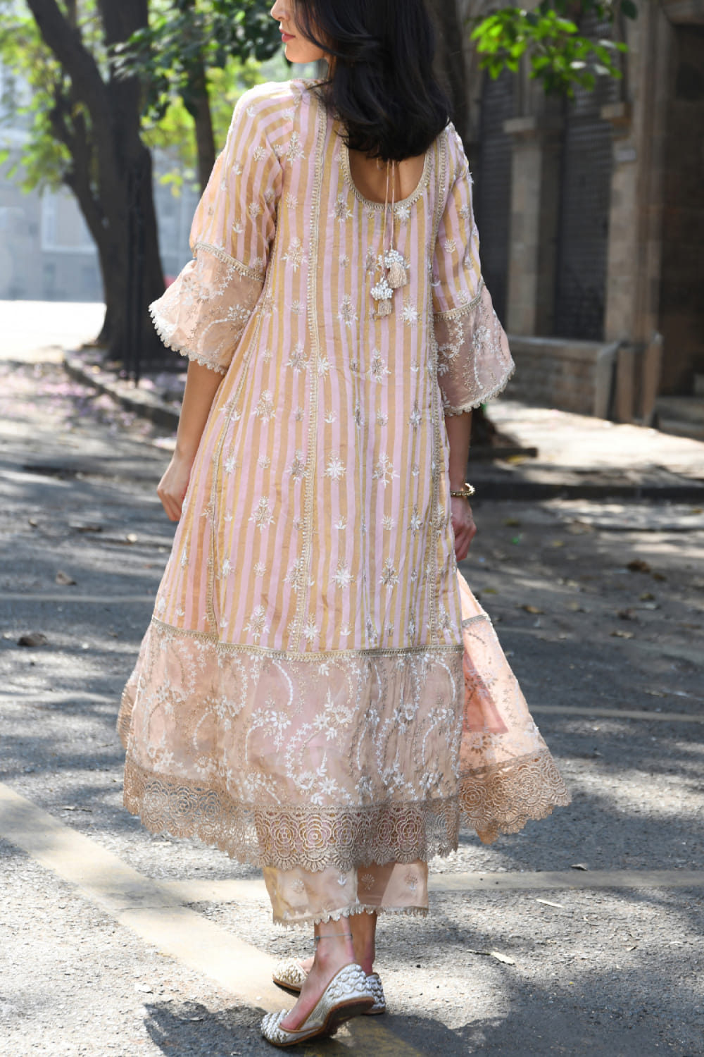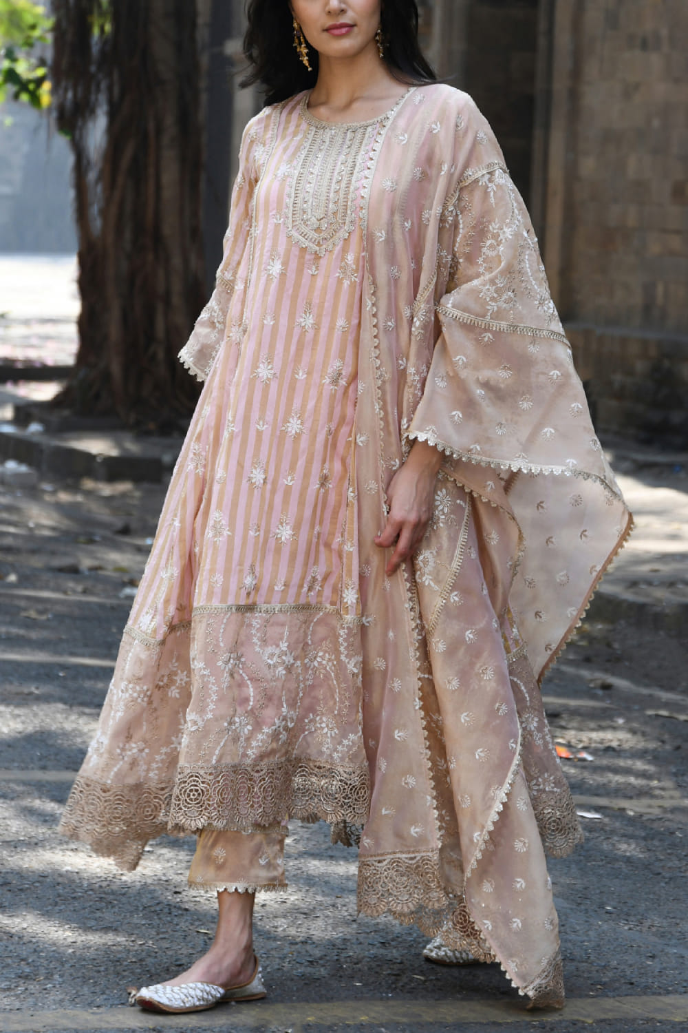 Mulmul designs this striking anarkali-style kurta crafted in tencel luxe organza with striped banarasi patterns, gota work, lace detailing, scalloped border and delicate embroidery in floral motifs. It is teamed with matching pants and a matching dupatta. Style the look with oversized hoops and block heels for a traditional occasion.