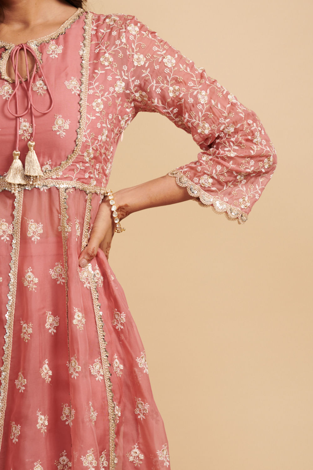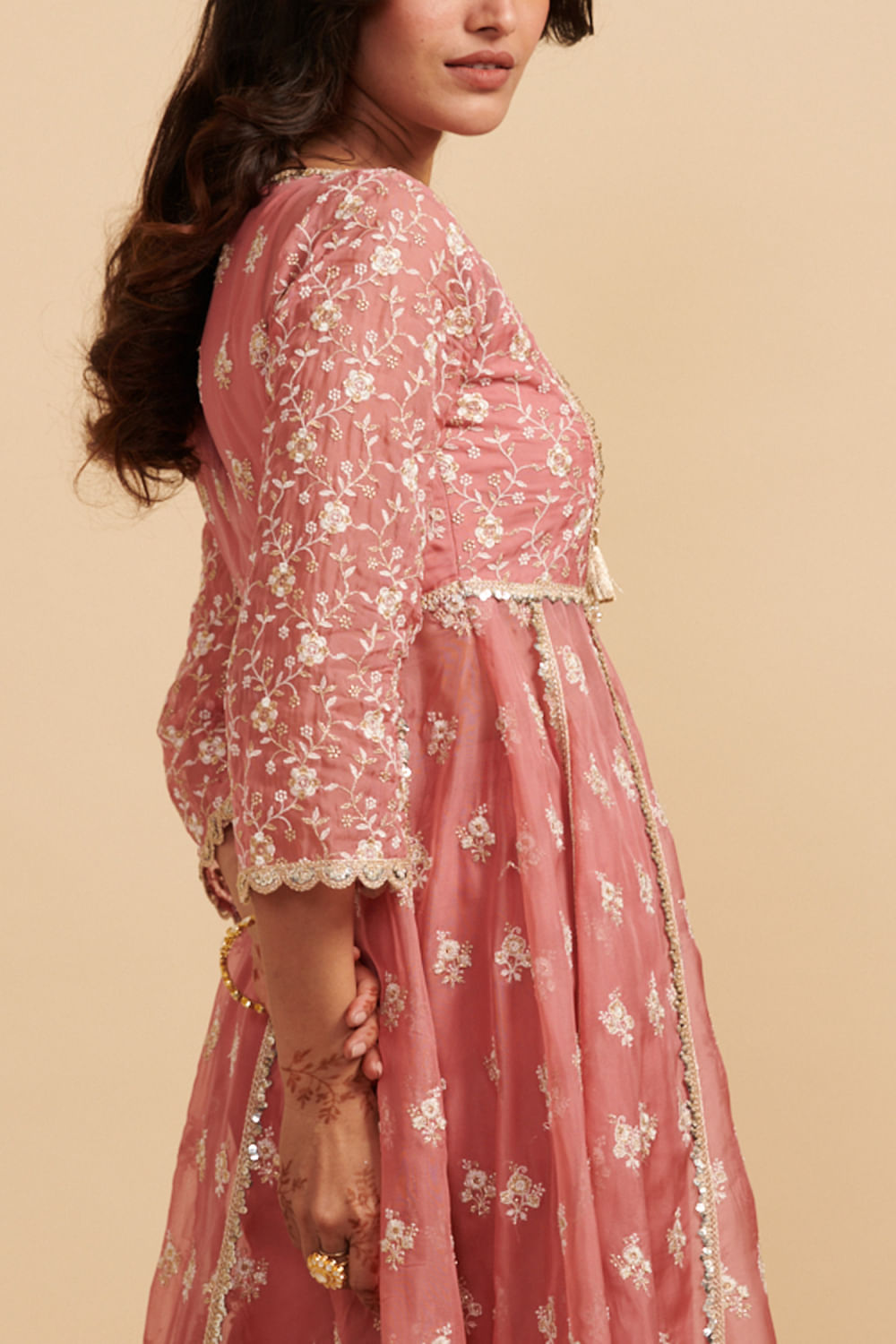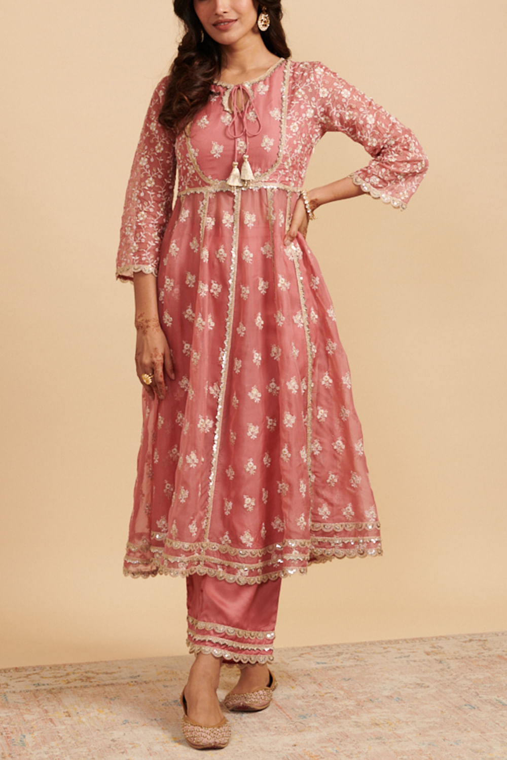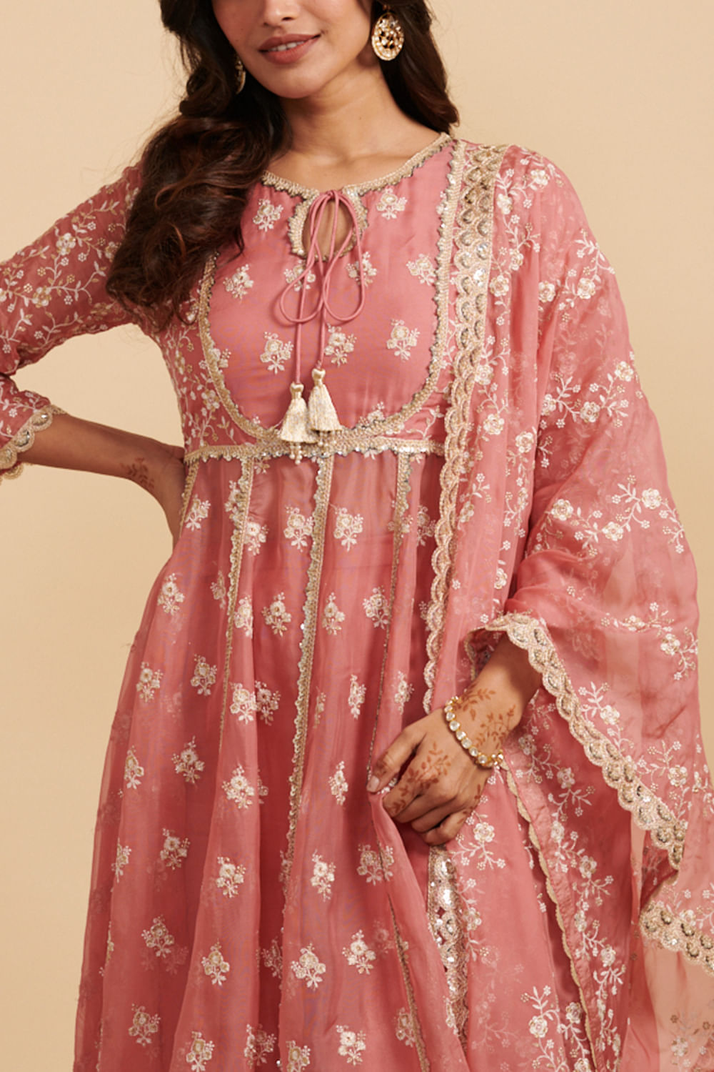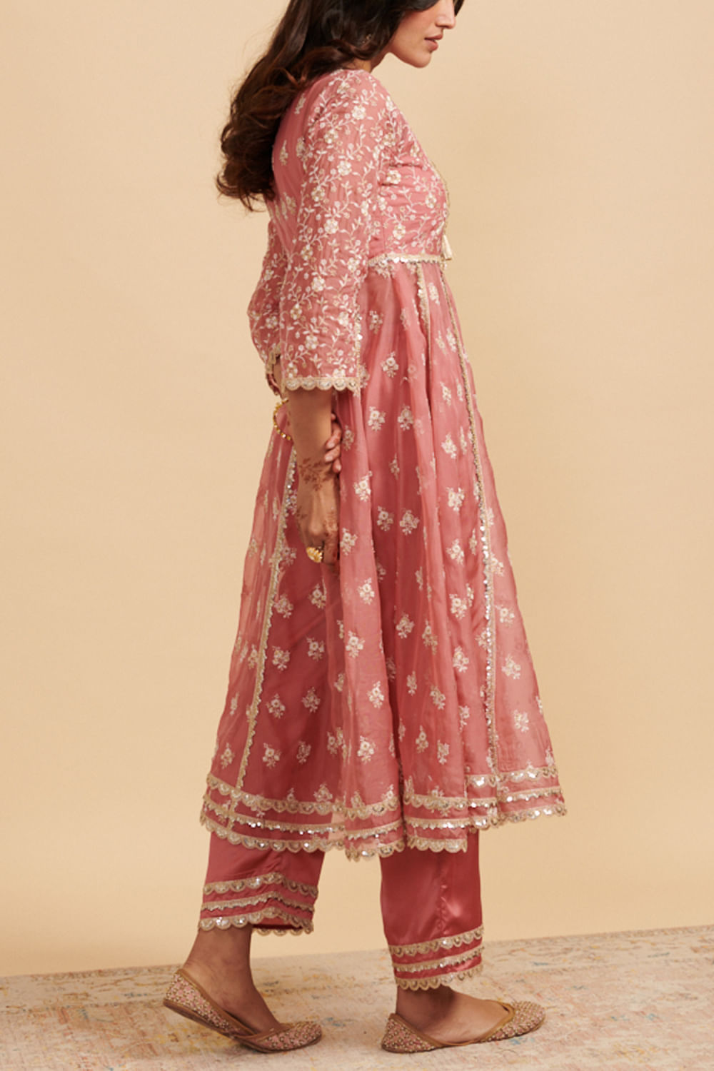 Mulmul designs this timeless anarkali set embraced in mulmul cotton with floral motif embroidery pattern, featuring thread and zari work and teamed with stylised embellished wide-leg pants. The look is complemented with an embroidered dupatta. Style the look with jhumkas and stackable bangles for a luncheon.