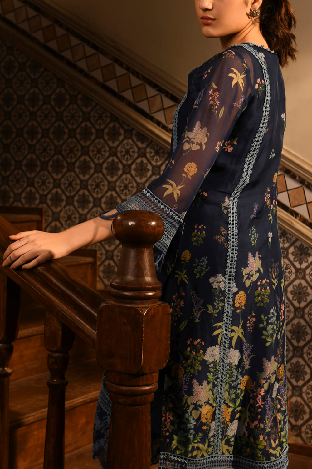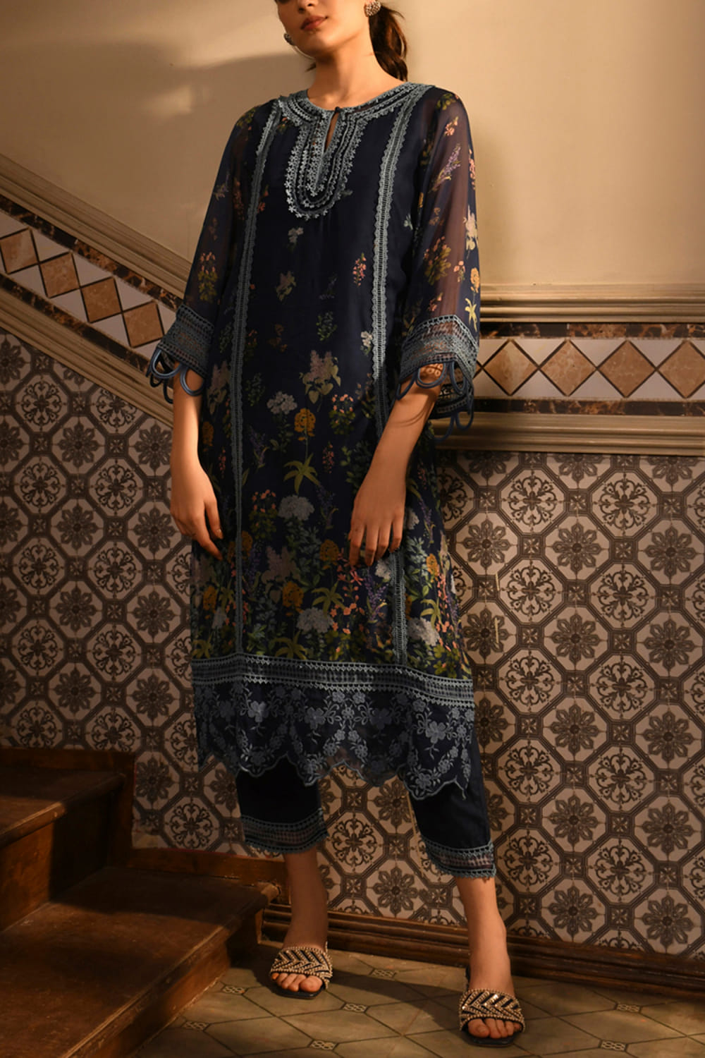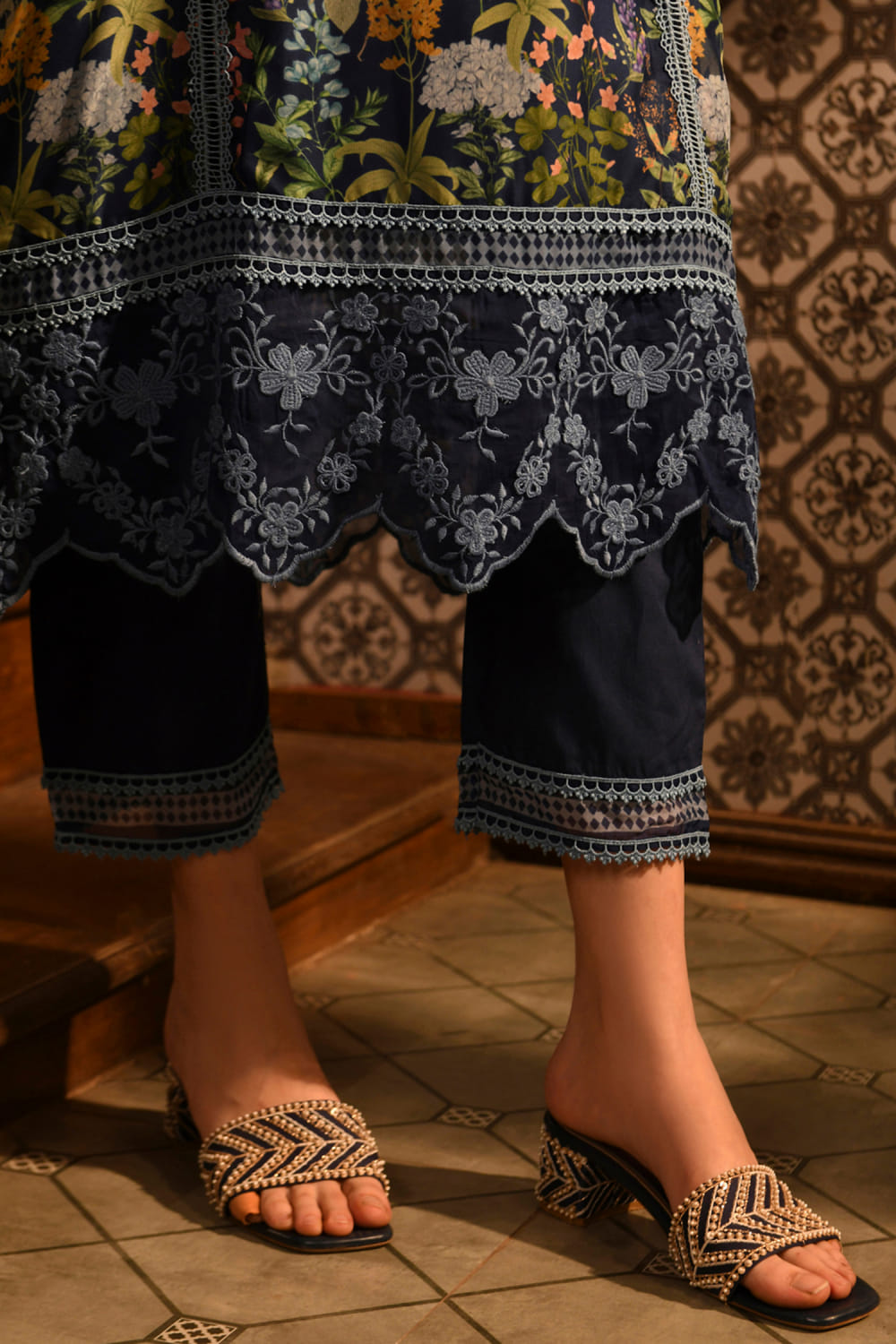 Mulmul designs this ethereal kurta embraced in tencel luxe with floral and leaf prints featuring intricate floral lace work and a scalloped embroidered hem. It is teamed with matching straight pants and an inner. Style the look with polki studs and mules for a casual outing.