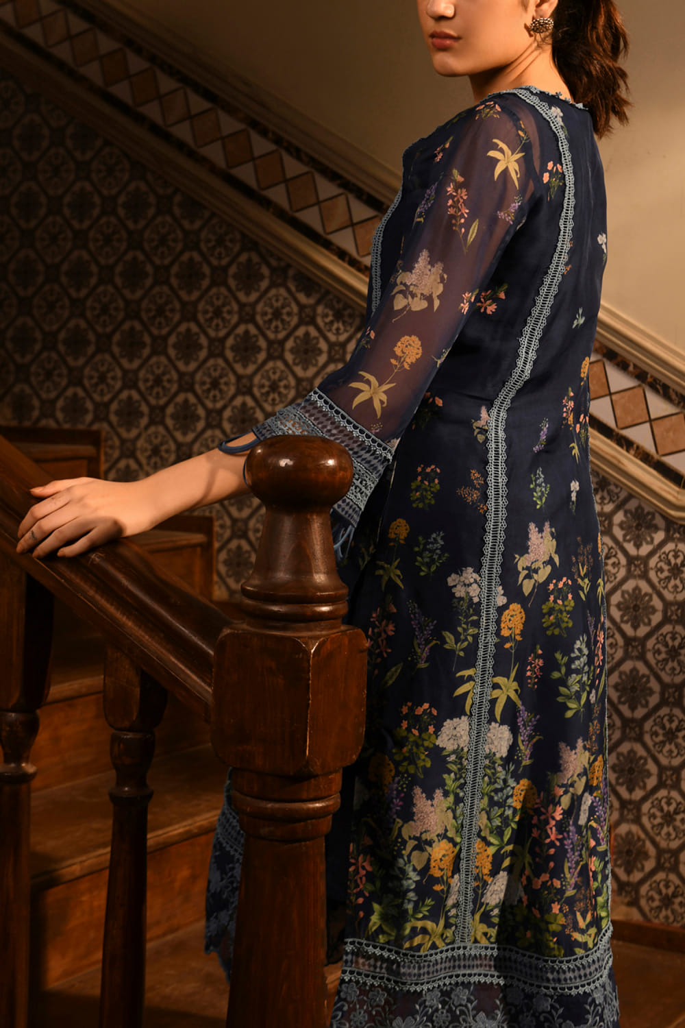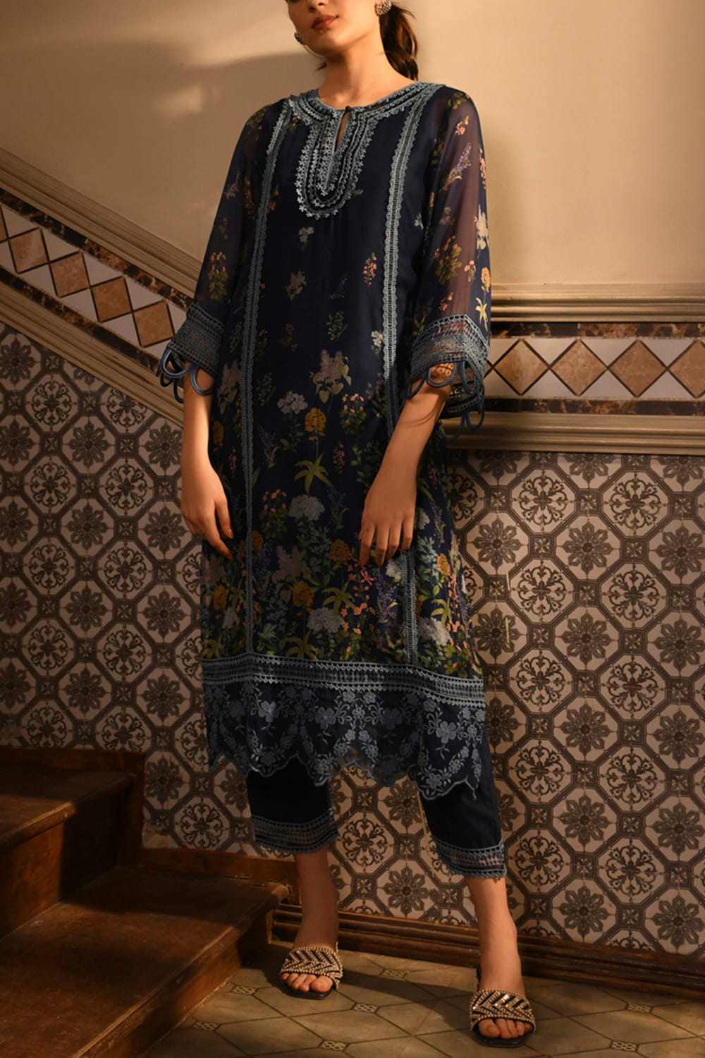 Mulmul designs this magnificent kurta rendered in tencel luxe with floral and leaf prints featuring intricate floral lace work and a scalloped embroidered hem. It is paired with matching straight pants, a striped printed dupatta and an inner. Style the look with polki danglers and block heels for an occasion.
