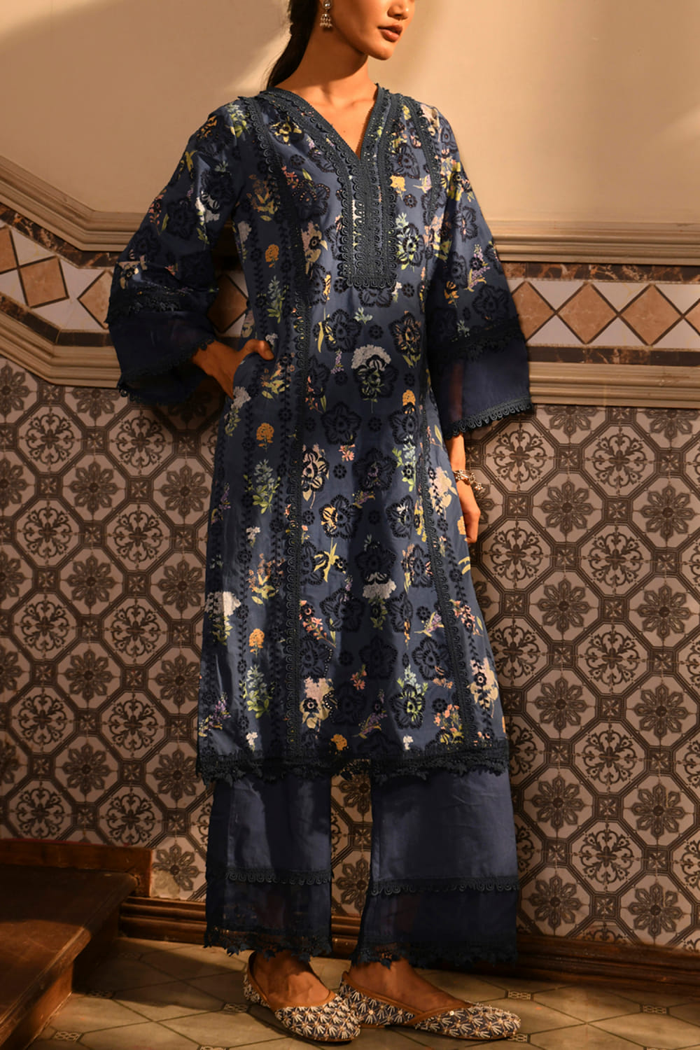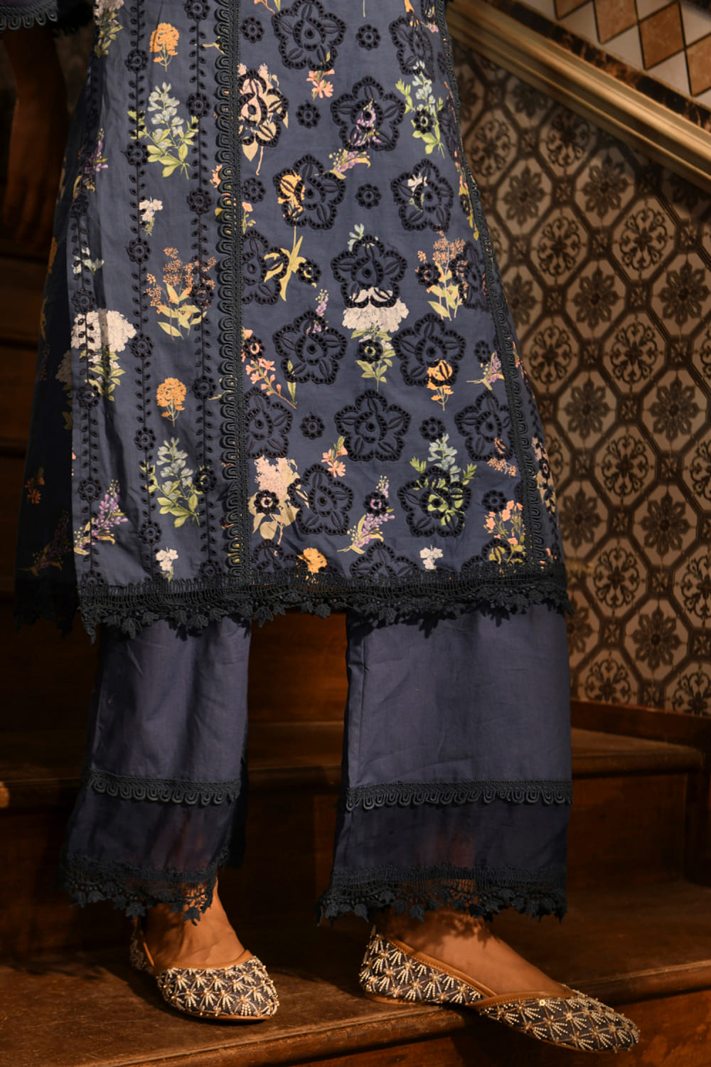 Mulmul designs this alluring kurta in mulmul cotton encapsulated with thread embroidery detailing in floral motifs and intricate lace work featuring a scalloped hem. It is paired with flared palazzos and a printed striped dupatta. Style the look with a polki ring and stilettos for a luncheon.