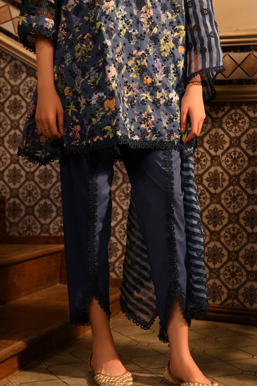 Mulmul designs this captivating kurta rendered in mulmul cotton with floral and leaf prints featuring intricate lace work and delicate embroidery detailing in an asymmetrical silhouette. It is teamed with matching tulip pants and a striped printed dupatta. Style the look with cubic zirconia studs and a sling bag for a house party.