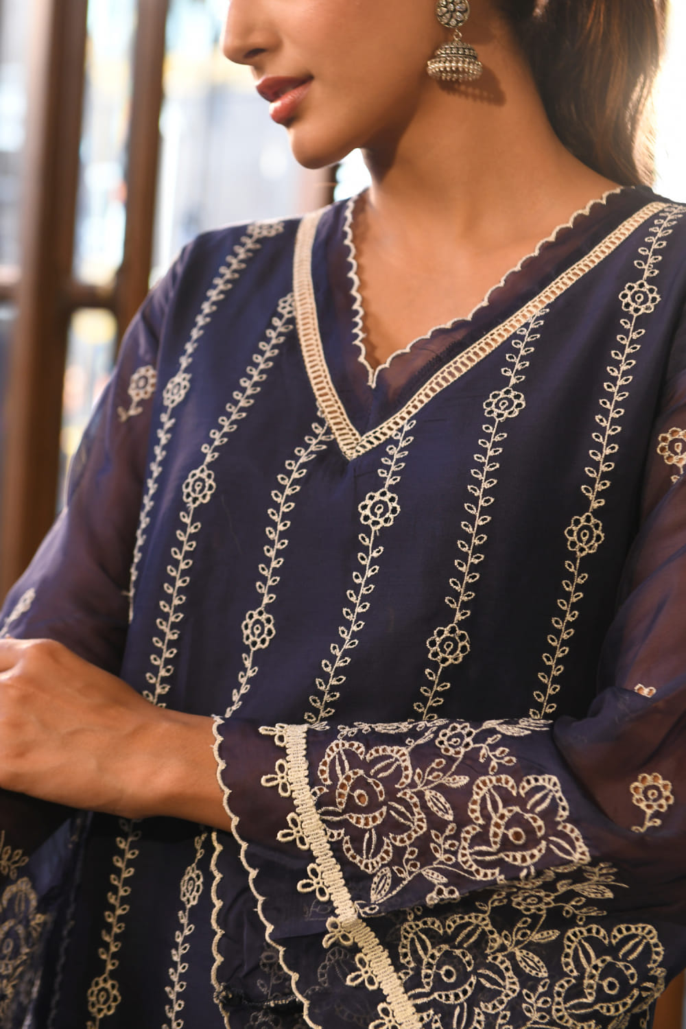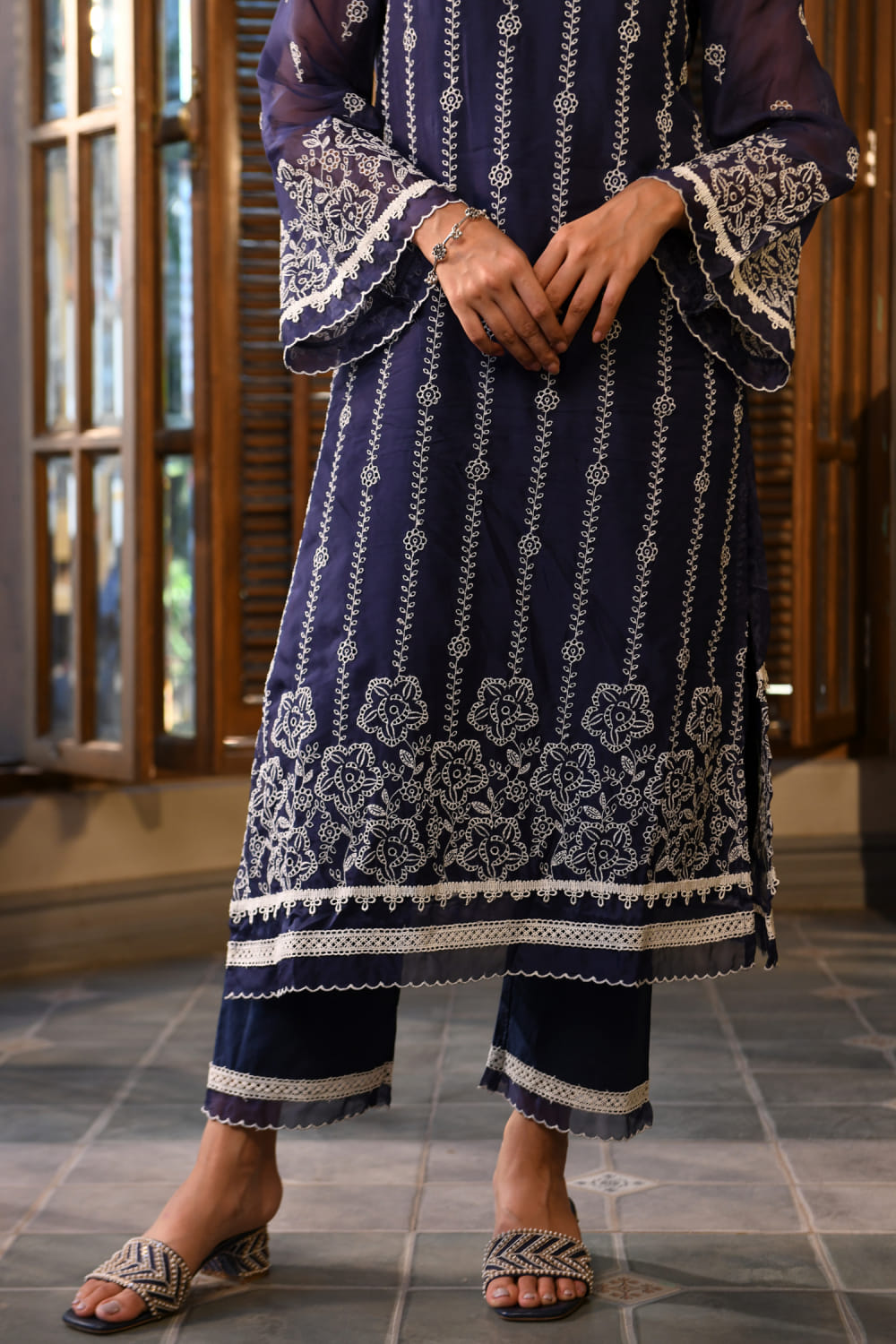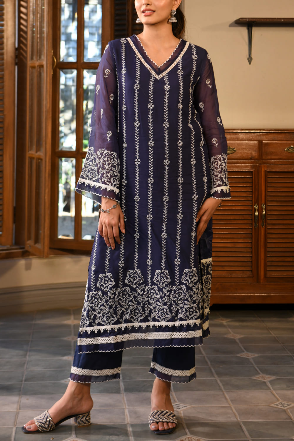 Navy floral thread embroidered kurta set
