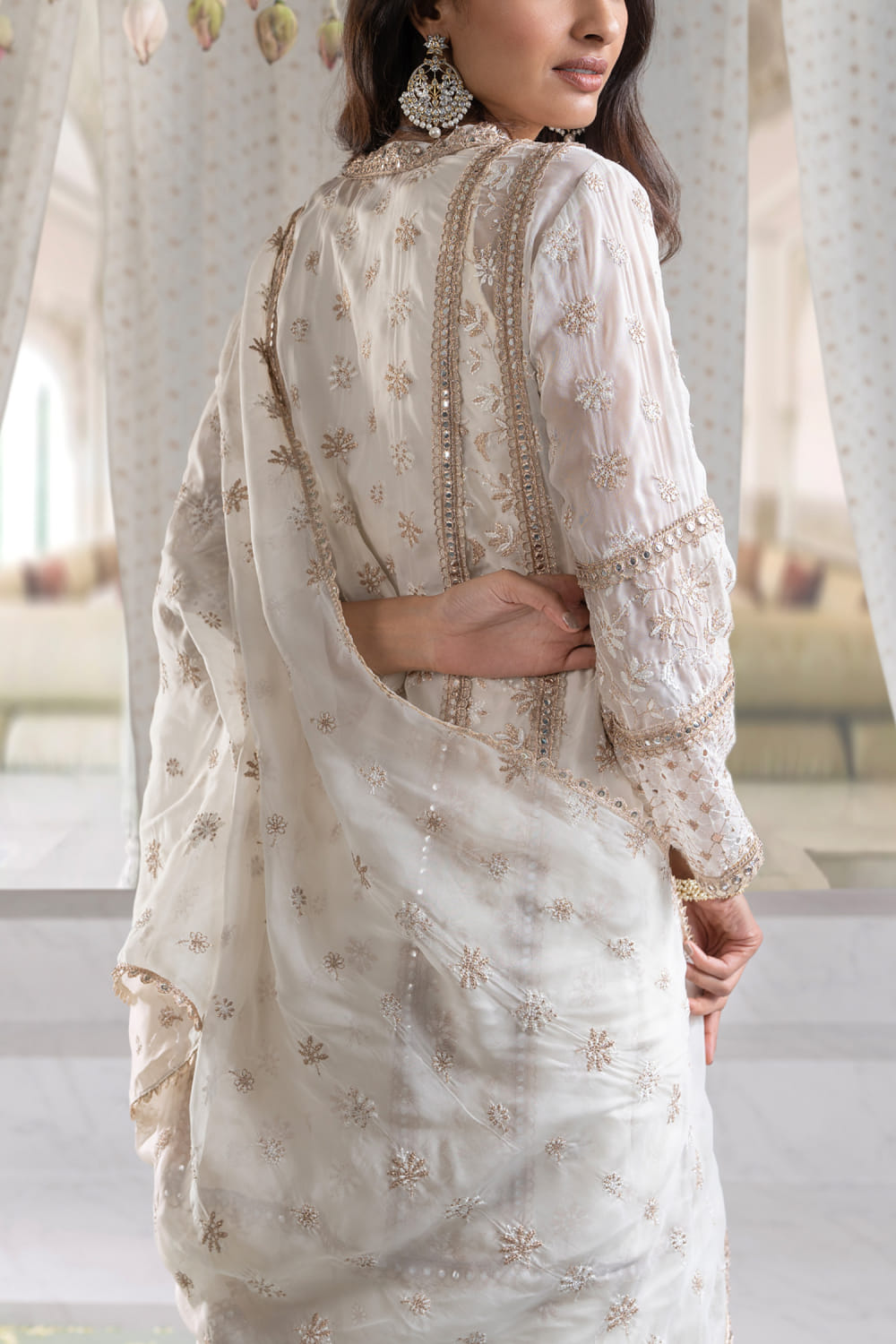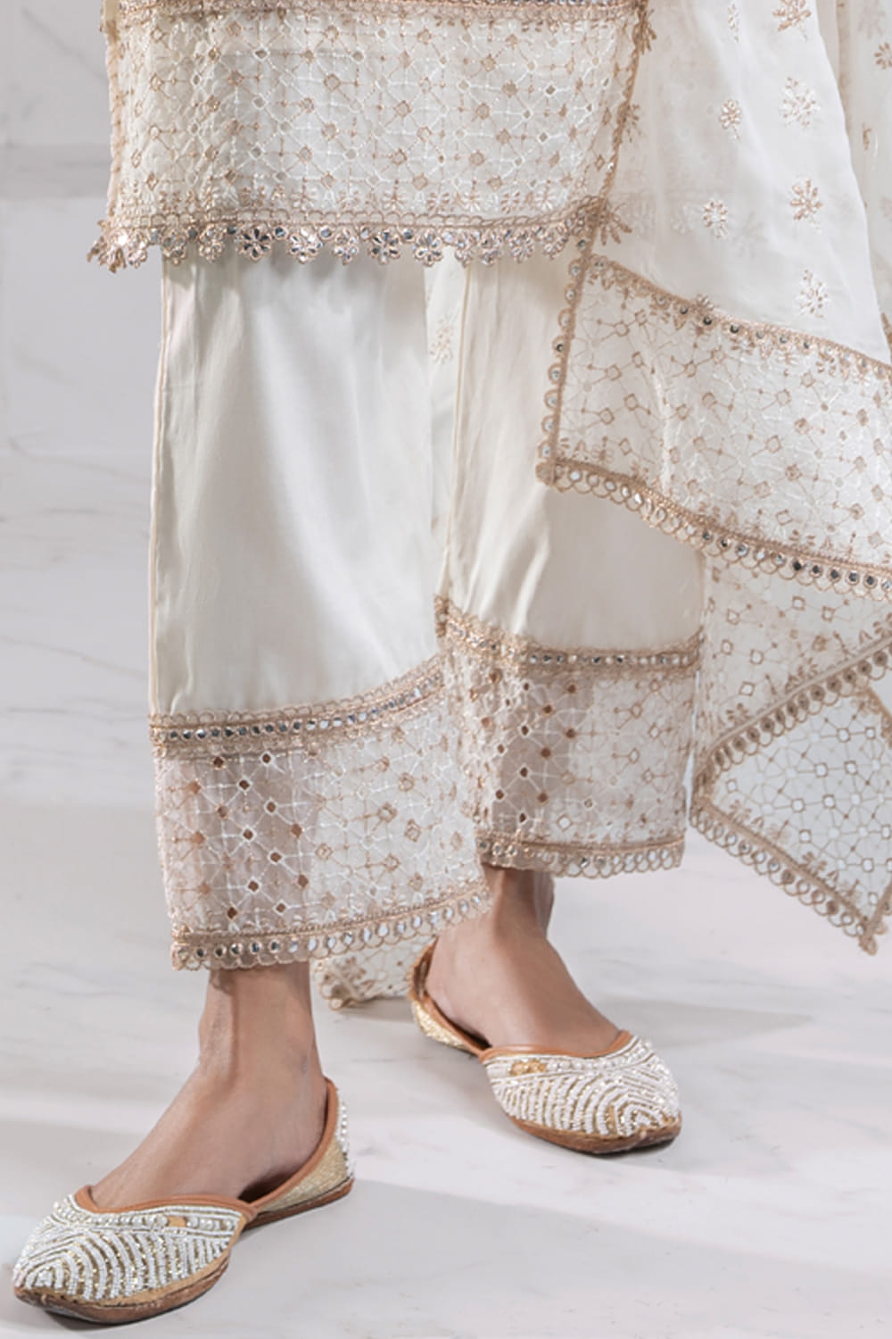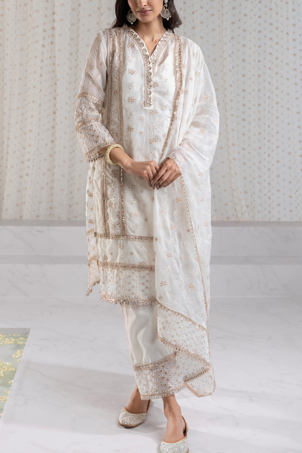 Mulmul designs this charming kurta enriched with thread and zari embroidery in floral motifs featuring panel detailing and gota lace work, pairing it with matching embroidered straight pants. Adorn the look with a matching dupatta and embellished danglers for a festive update. The dupatta here is shown for styling purposes only.