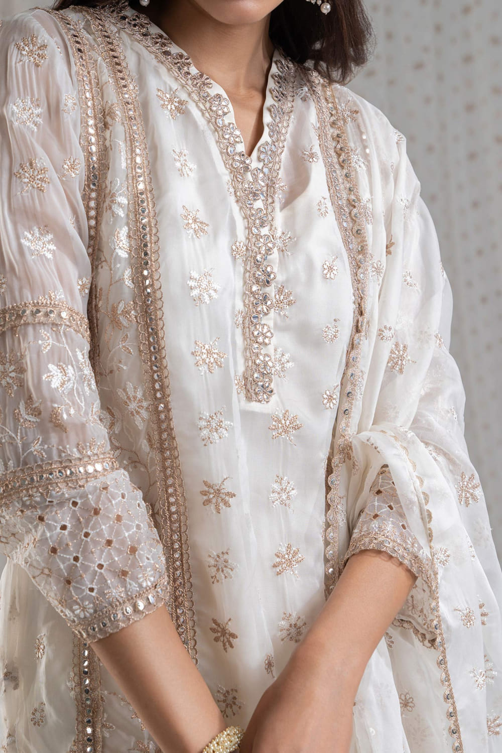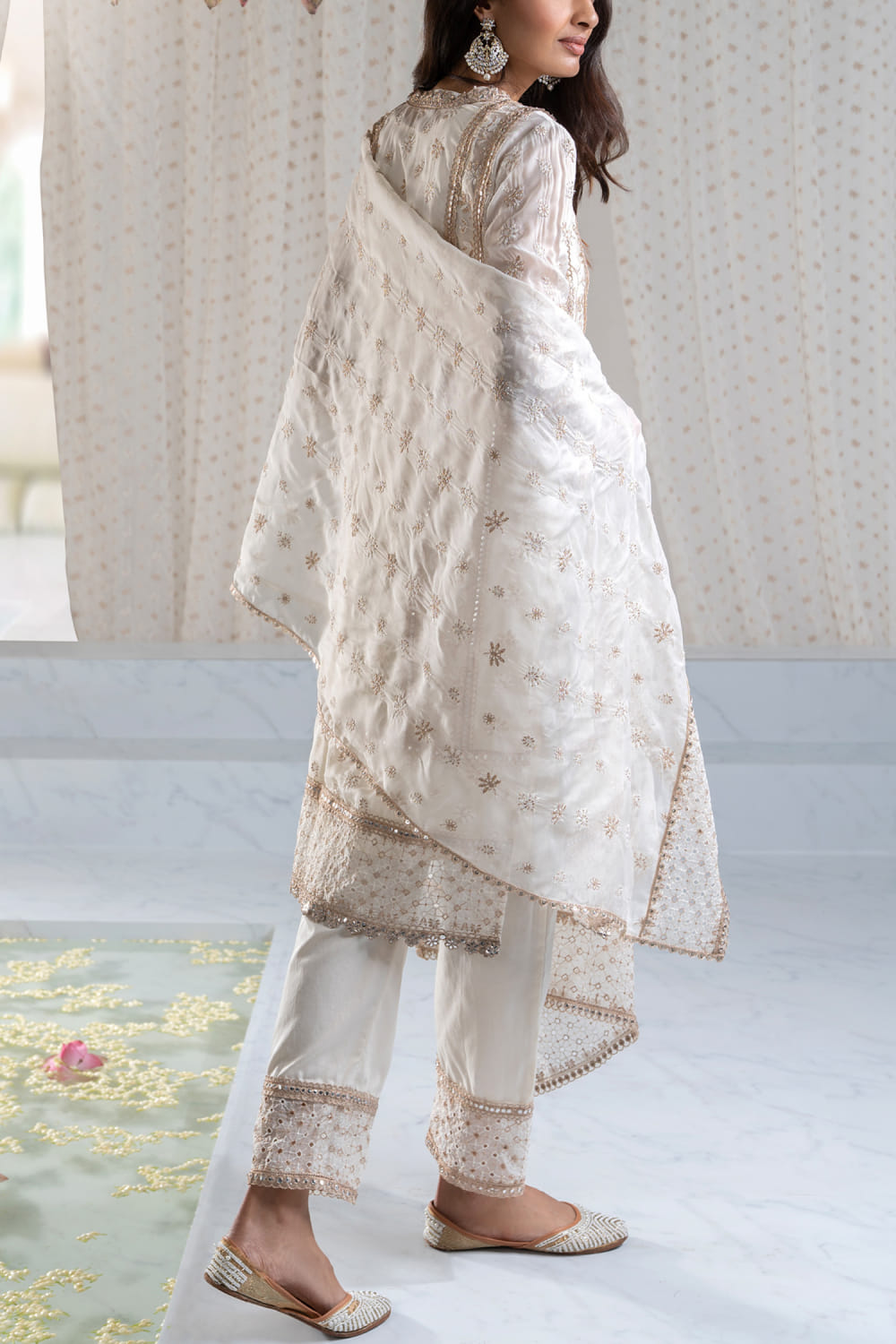 Mulmul designs this understated kurta customised with thread and zari embroidery in floral motifs featuring panel detailing and gota lace work, teaming it with matching embroidered straight pants and a matching embroidered dupatta. Style the look with chandbaalis and embellished juttis for a festive affair.