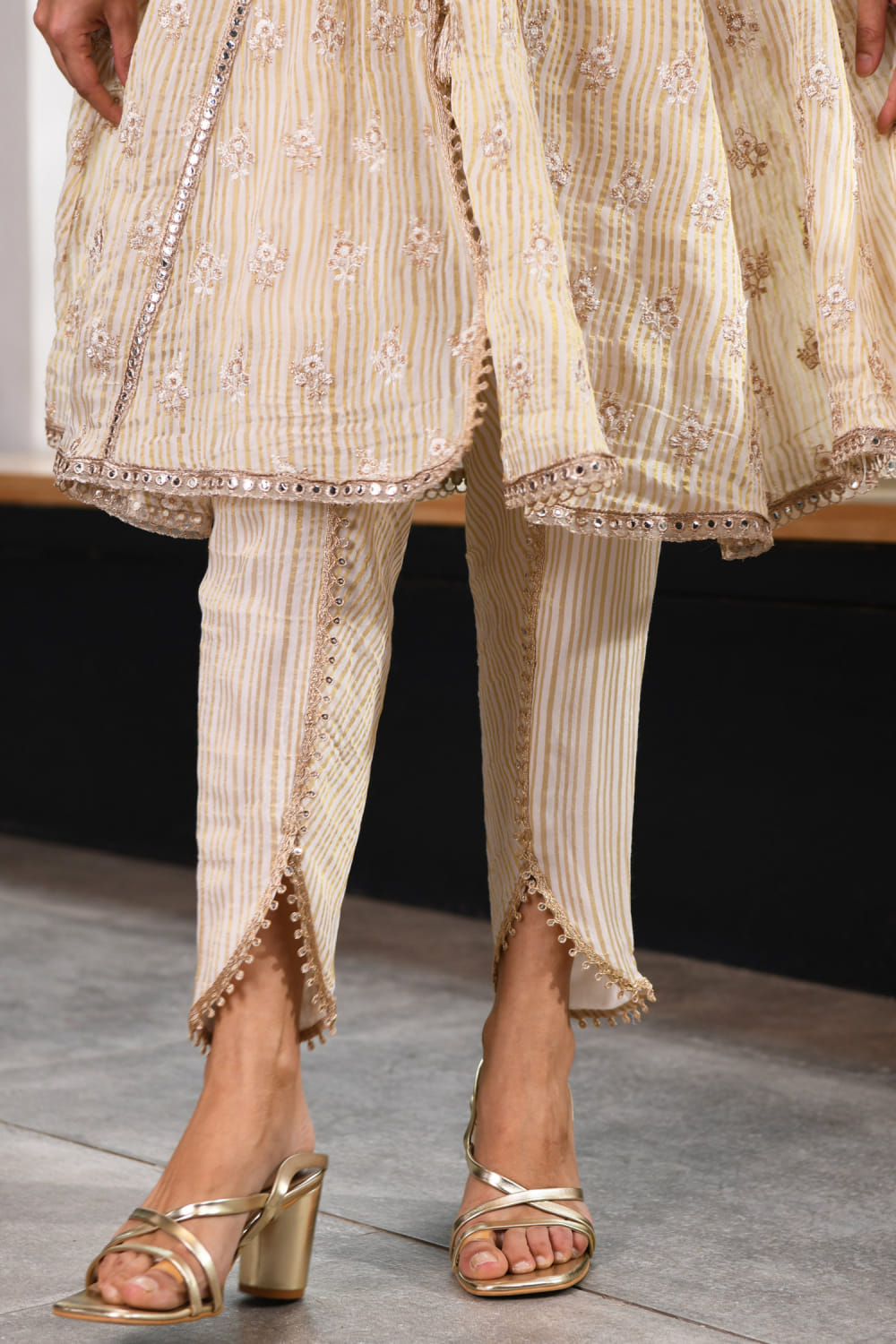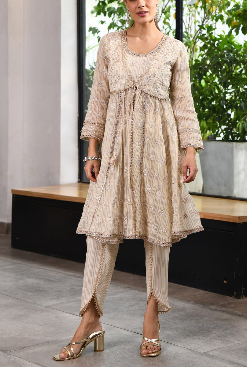 Mulmul designs this splendid anarkali-style short jacket encapsulated with stripes, scallop edges, sequins, mirror work, gota detailing, tie-up tassels, zari and thread embroidery in floral patterns, complementing it with matching kurta, and pants. Style the look with a dupatta and a potli bag for a pre-wedding affair.