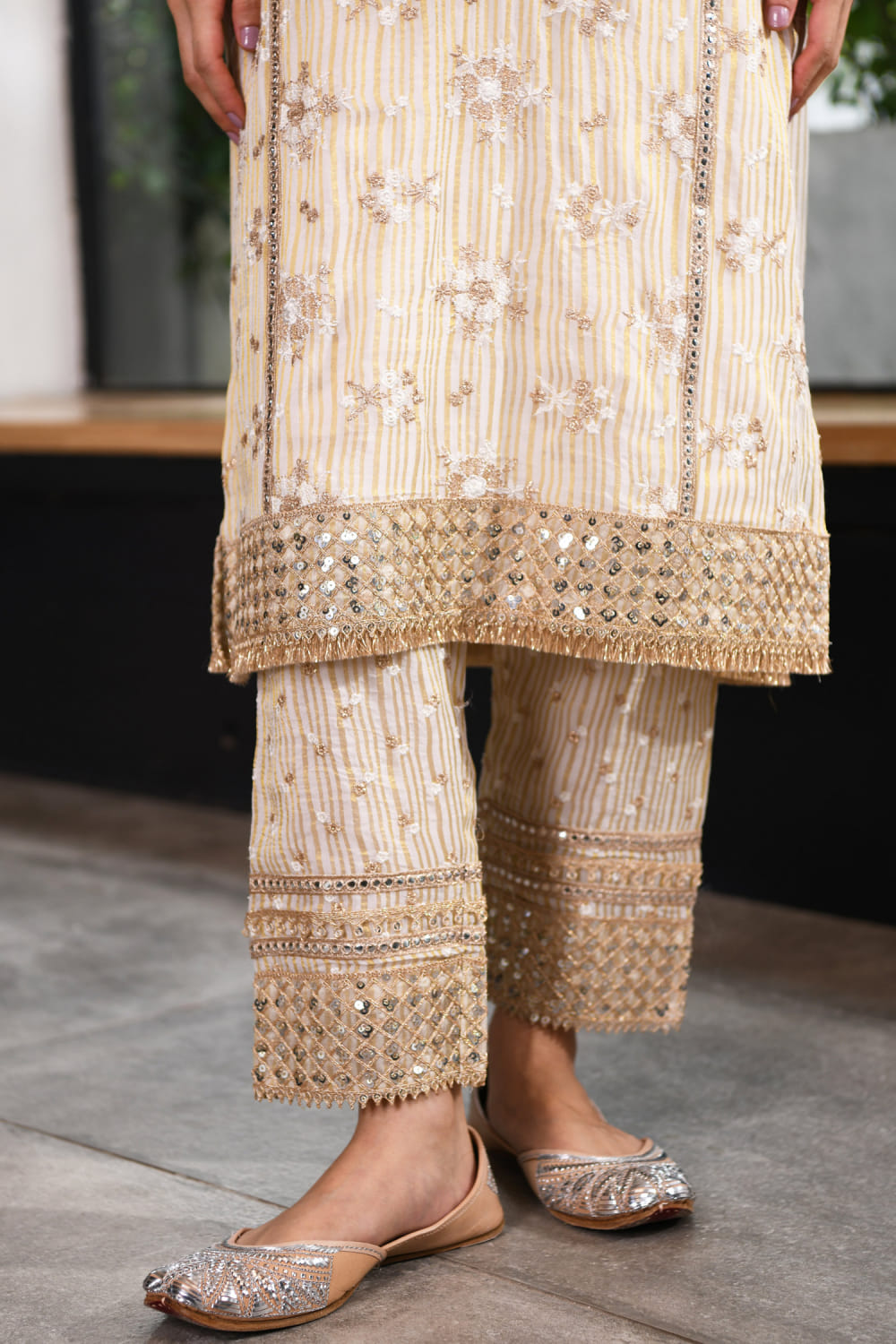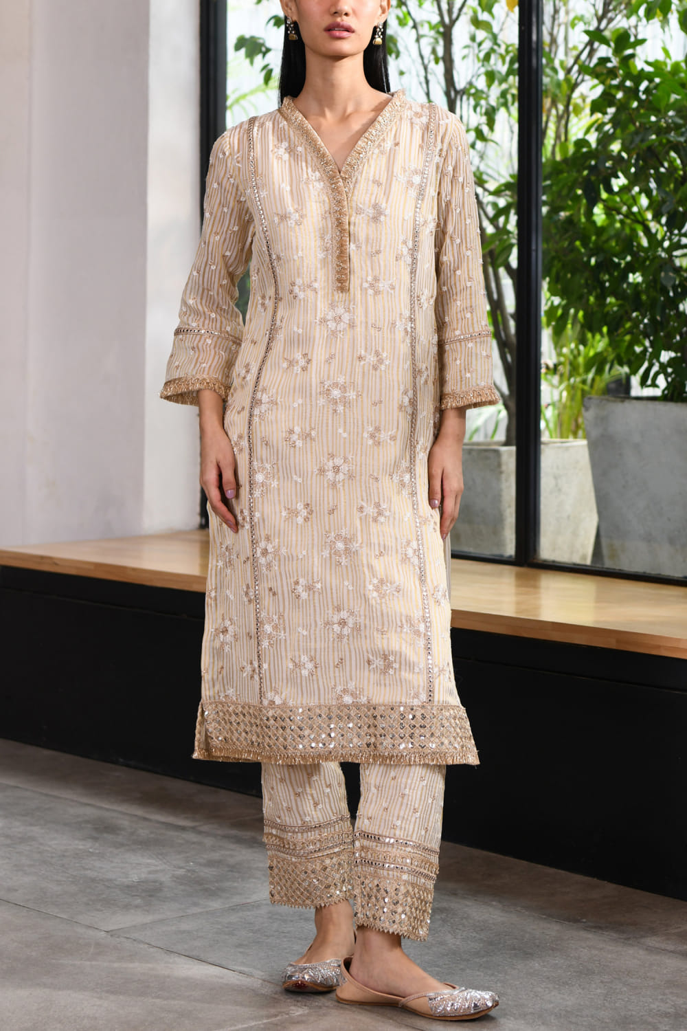 Mulmul designs this elegant kurta rendered with stripes, scallop edges, sequins, mirror work, gota detailing, zari and thread embroidery in floral patterns, teaming it with matching pants and a slip. Style the look with a dupatta and an embellished ring for intimate festivities.