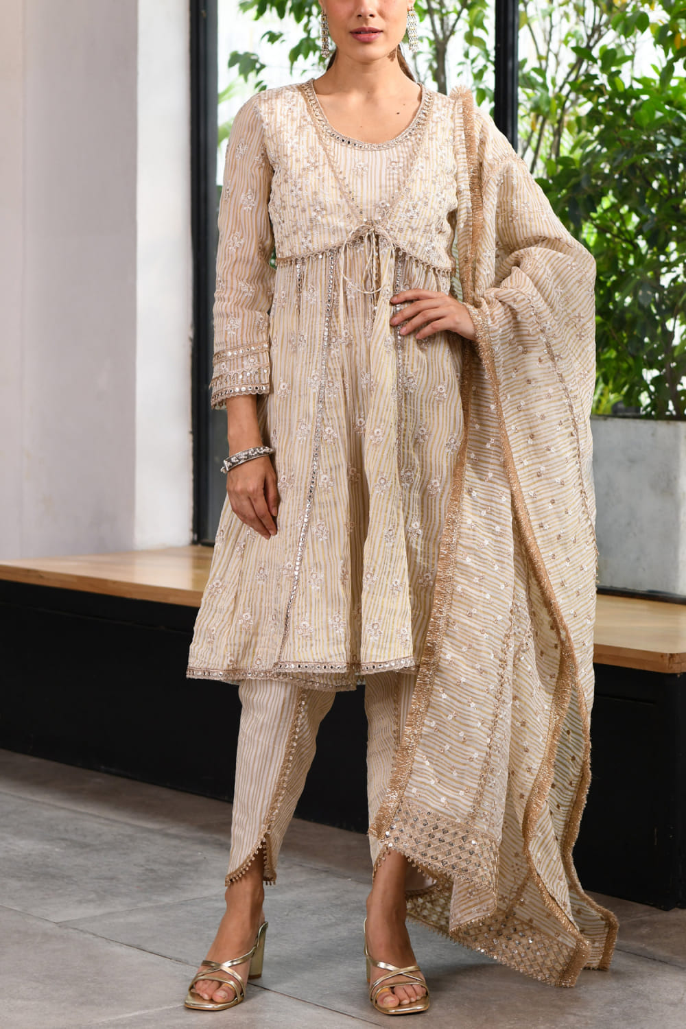 Mulmul designs this admirable anarkali-style short jacket customised with stripes, scallop edges, sequins, mirror work, gota detailing, tie-up tassels, zari and thread embroidery in floral patterns, pairing it with matching kurta, pants and dupatta. Style the look with antique chandbalis and an embellished ring for a traditional appeal.