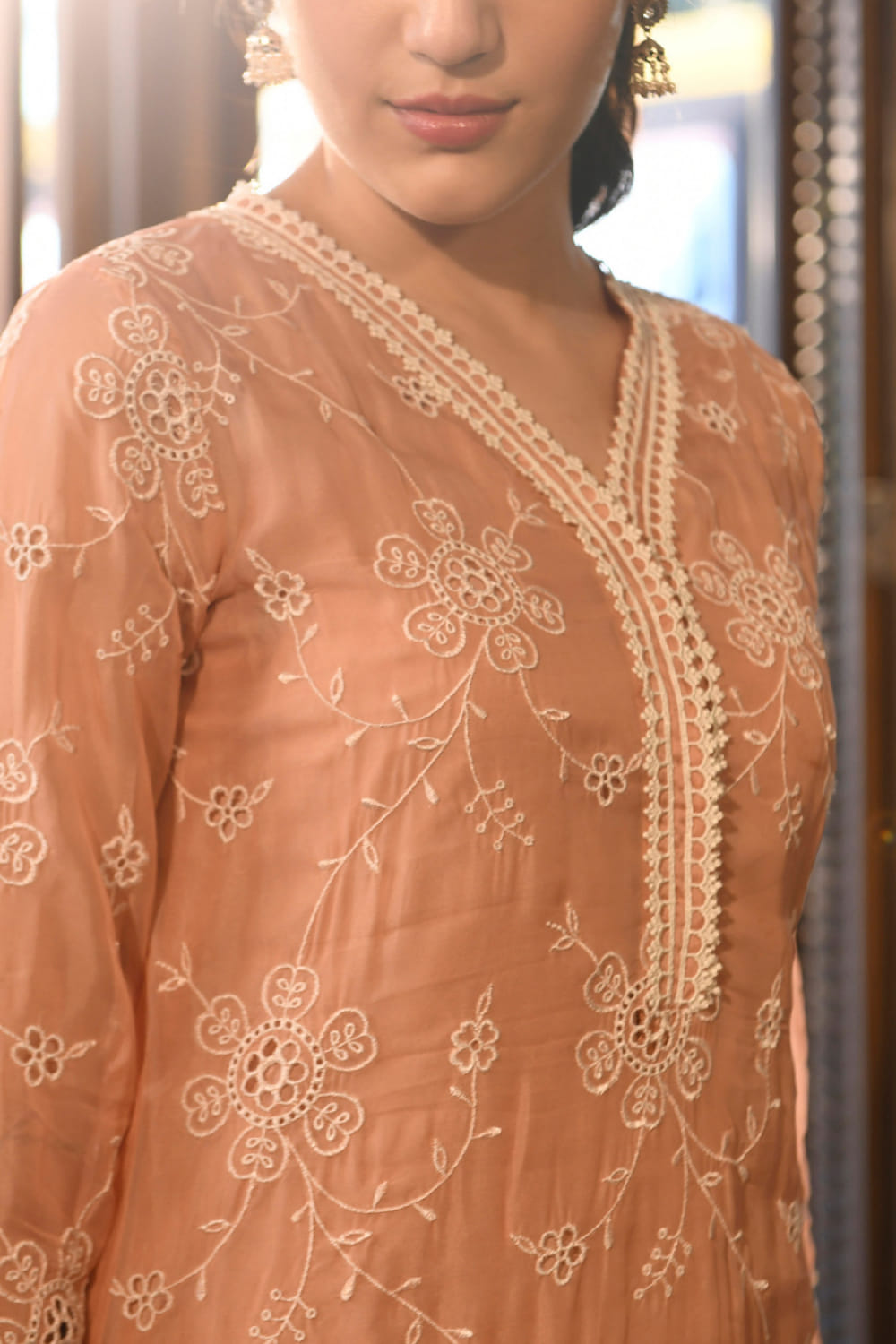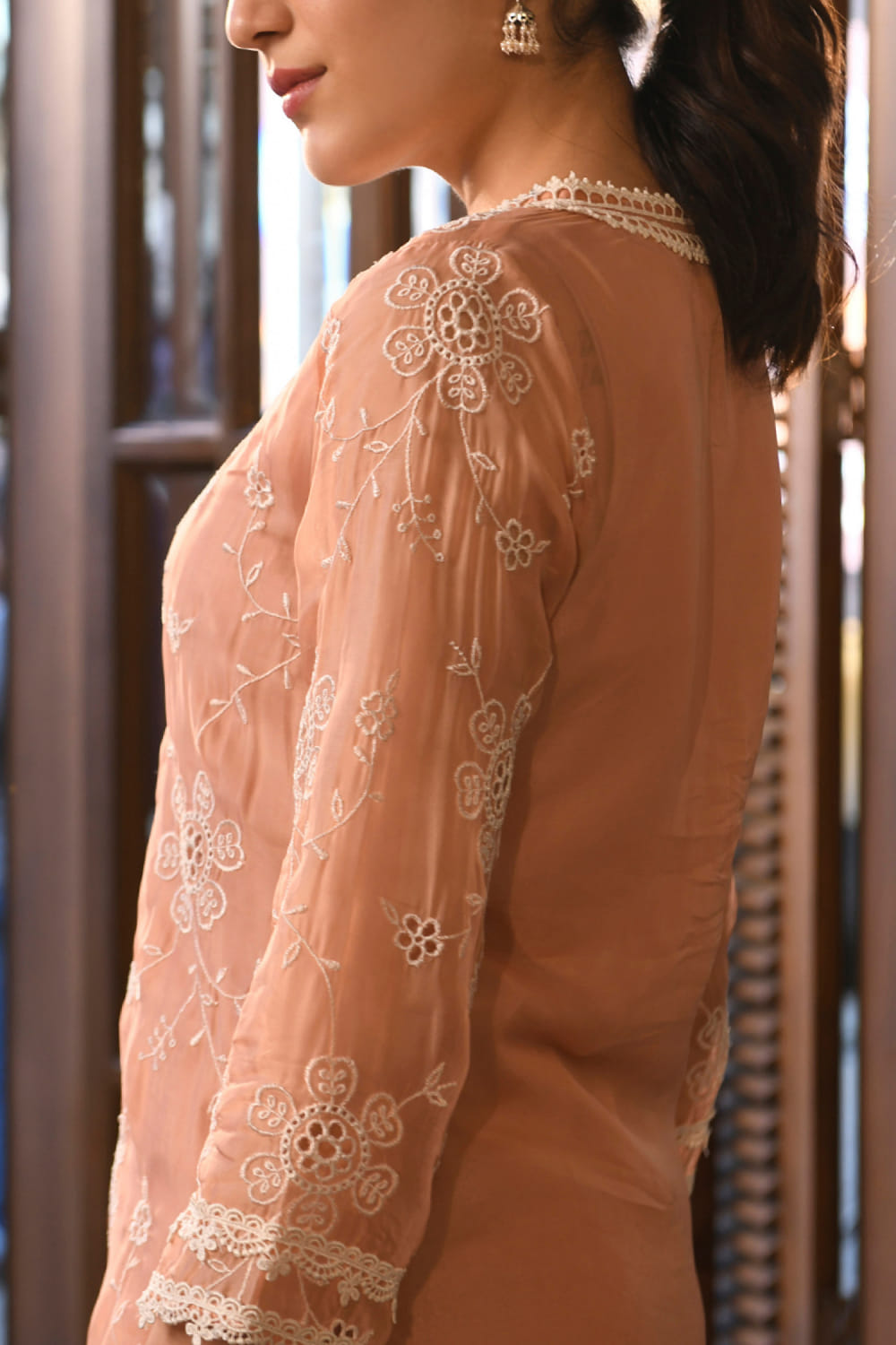 Mulmul designs this occasion-ready kurta rendered in tencel organza with lace detailing and thread embroidery in floral patterns, pairing it with a matching dupatta, camisole and matching straight pants. Style the look with pearl danglers and an embellished ring.