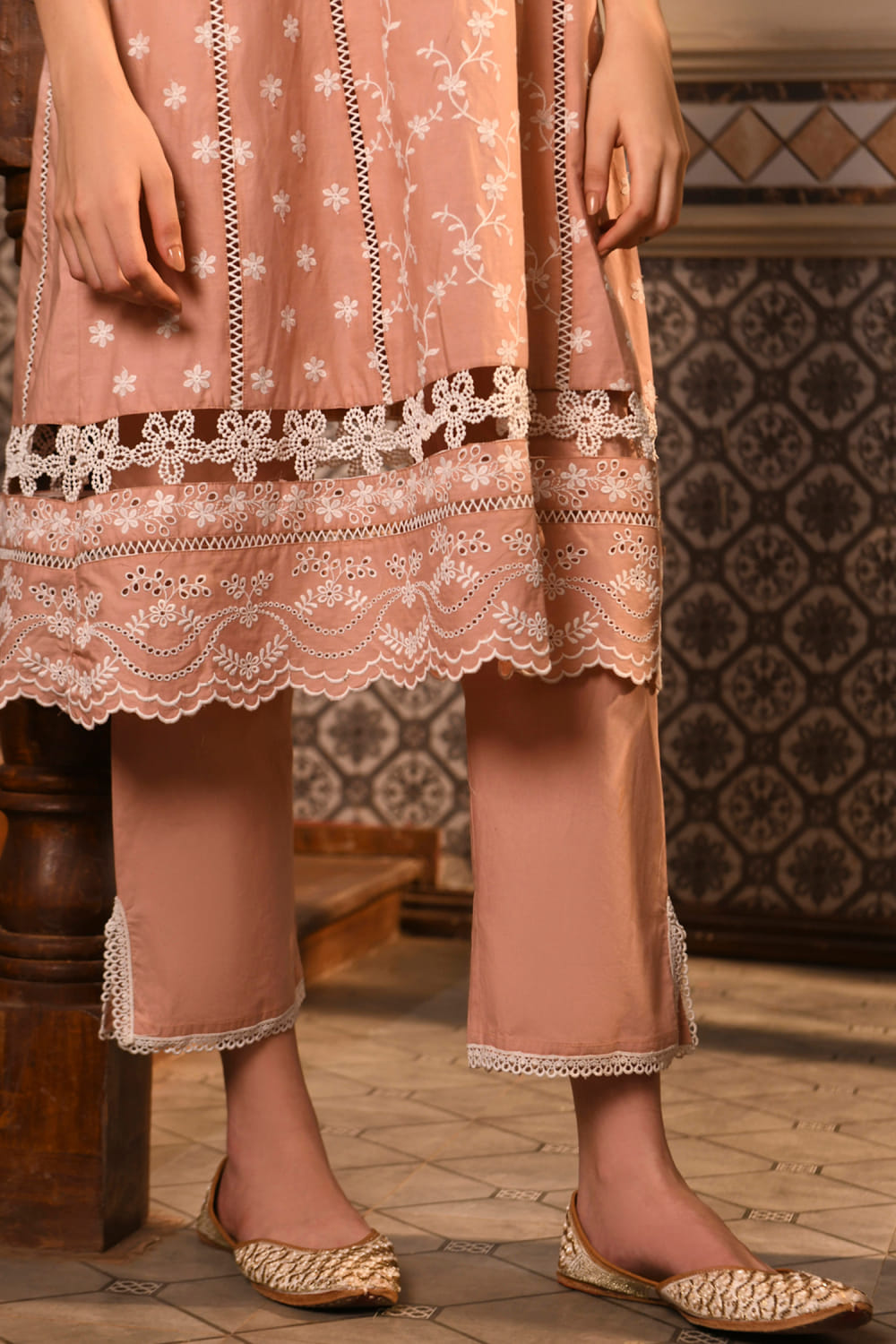 Mulmul designs this alluring kurta in mulmul cotton encapsulated with embroidery detailing in floral patterns featuring intricate lace work and a scalloped hem. It is paired with matching pants. Style the look with block heels and a capsule clutch for an eye-catching impression.