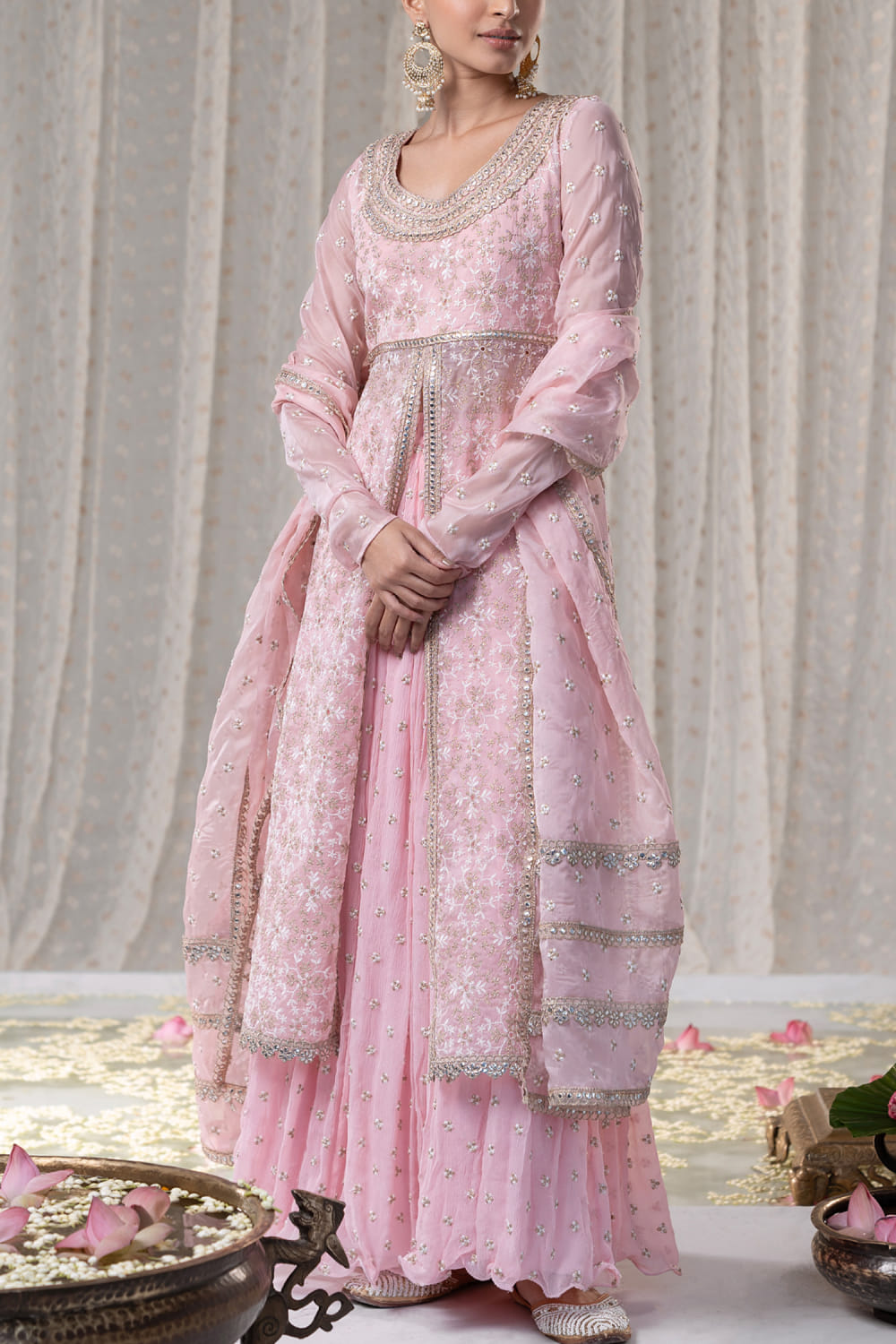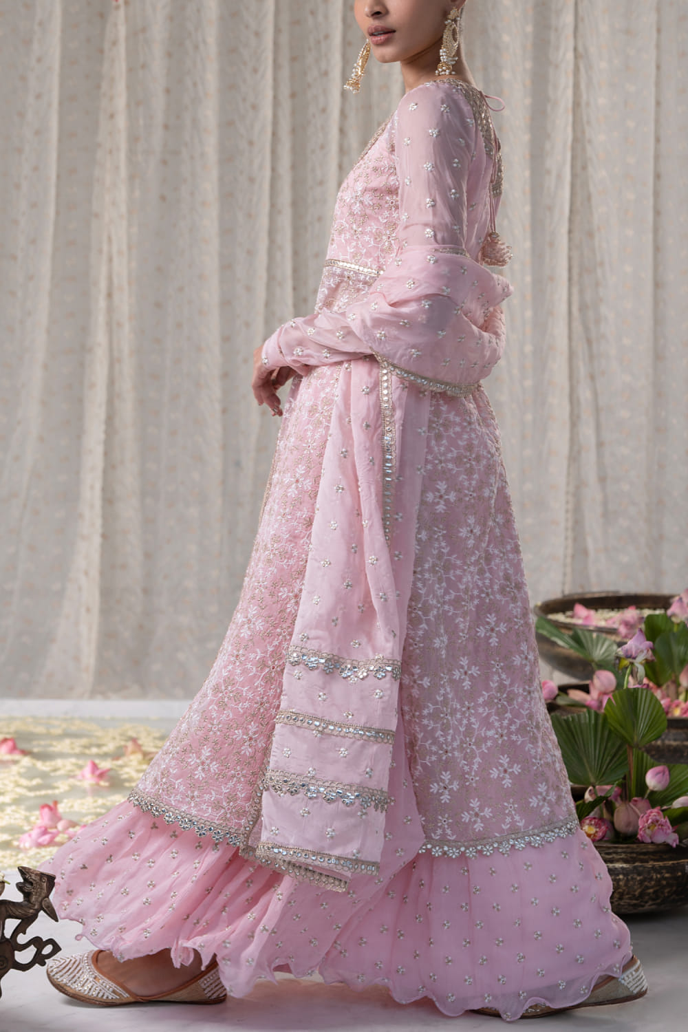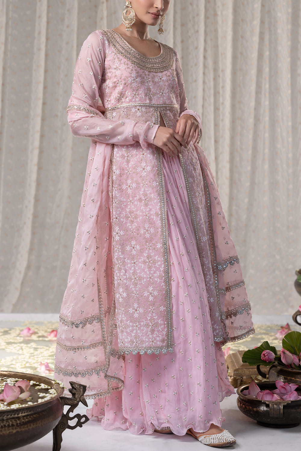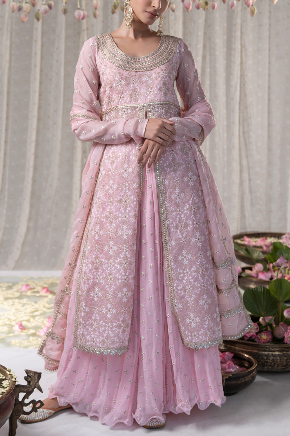 Mulmul designs an enchanting look with this half-front slitted long kurta crafted with full churidar sleeves, thread work and gold zari embroidery in floral motifs featuring gota lace work, complementing it with a matching voluminous embroidered skirt. Style the look with a matching dupatta and an embellished necklace set for a wedding appeal. The dupatta here is shown for styling purposes only.