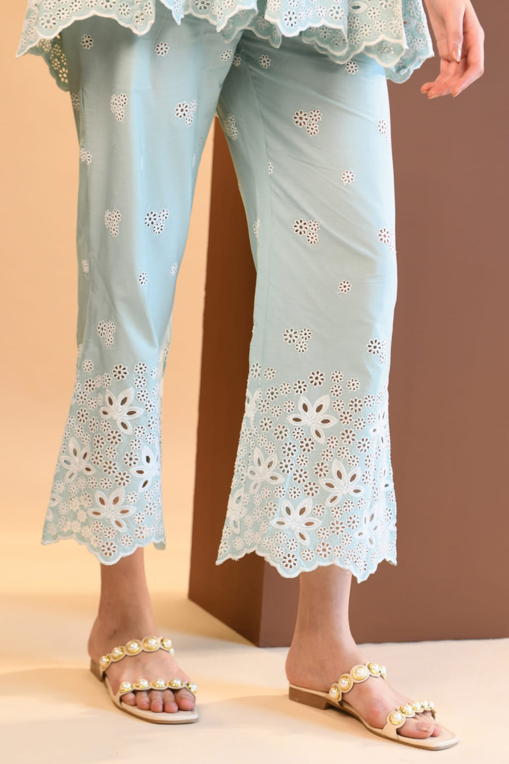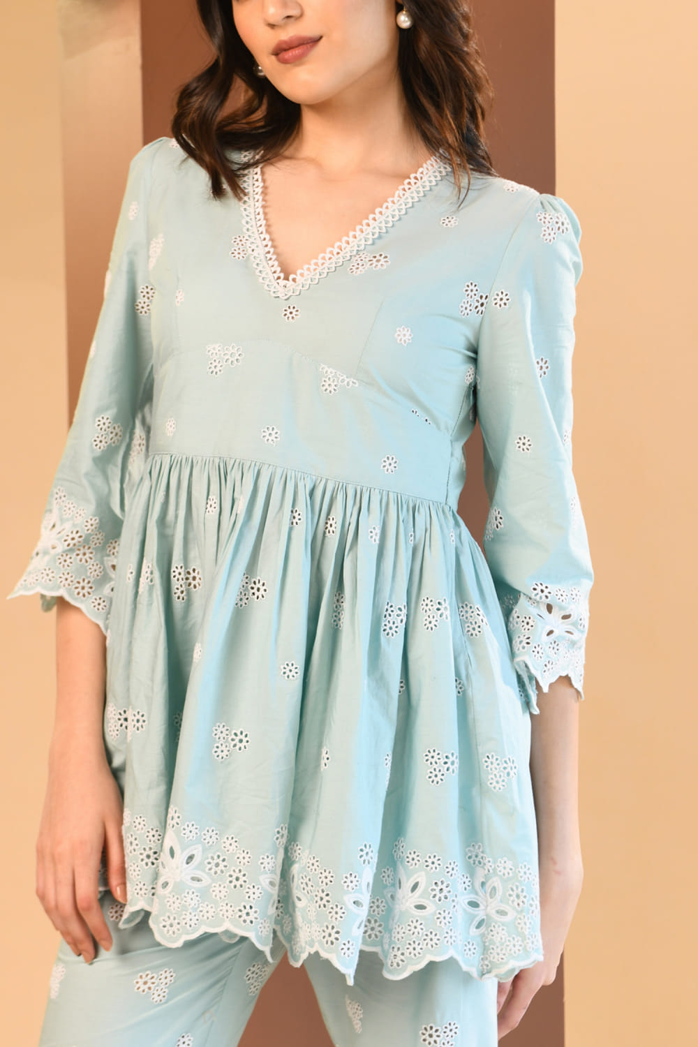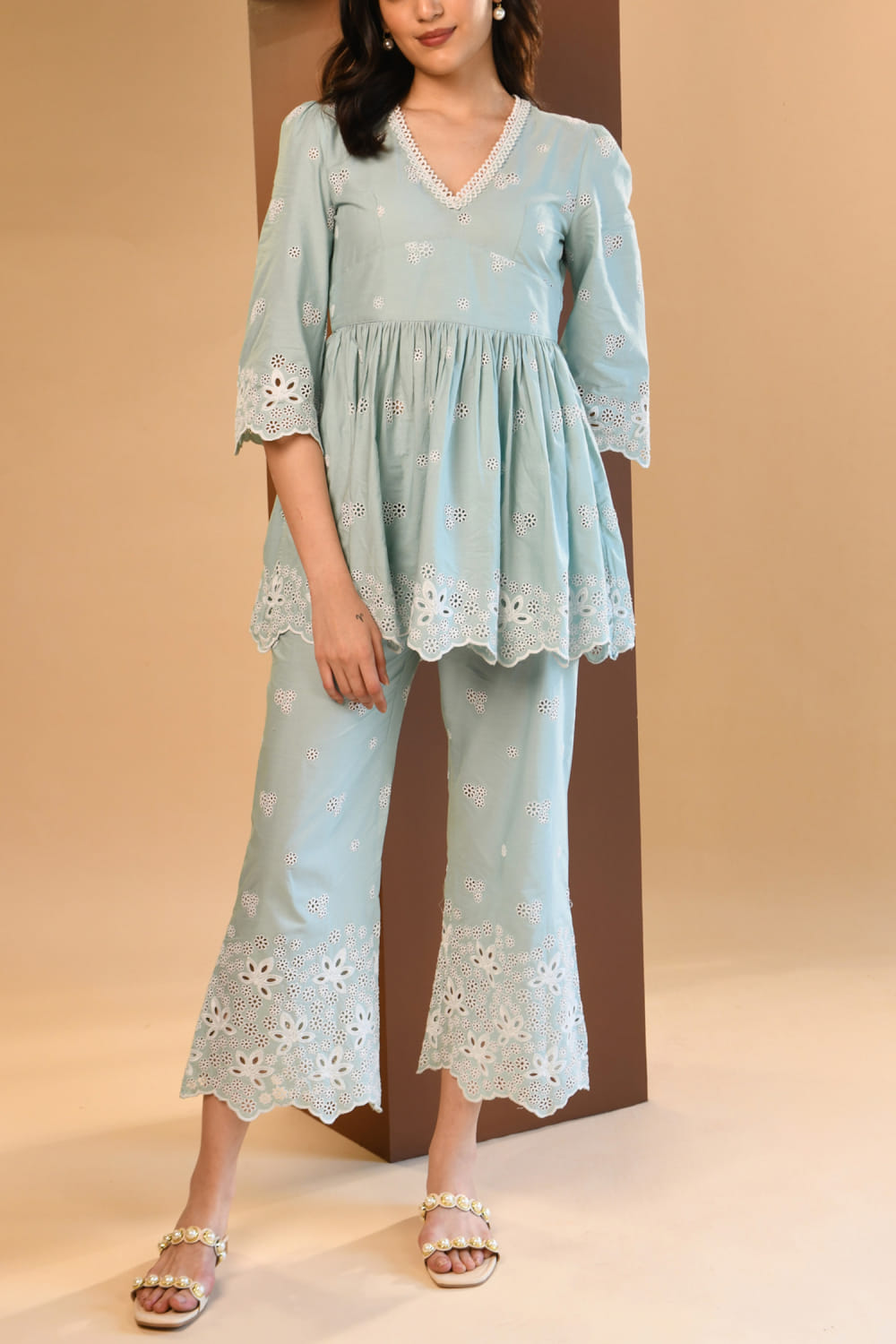 Mulmul designs this charming peplum kurta customised in mulmul cotton with cutwork and thread embroidery in floral patterns featuring lace work and a scalloped hem. It is paired with matching straight pants. Style the look with pearl drop earrings and block heels for brunch.