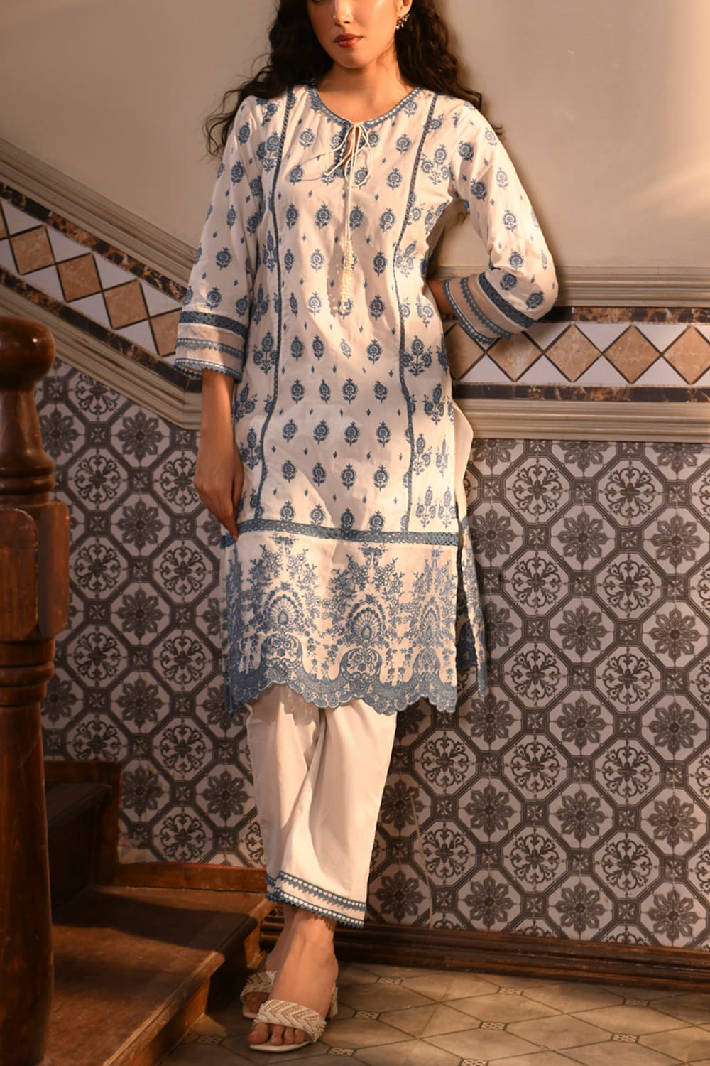 Mulmul designs this festive-ready kurta embraced in mulmul cotton with thread embroidery detailing in floral motifs and patterns featuring intricate lace work, tie-up tassel accents and a scalloped hem. It is paired with matching pants. Style the look with chunky hoops and stilettos for a captivating appeal.