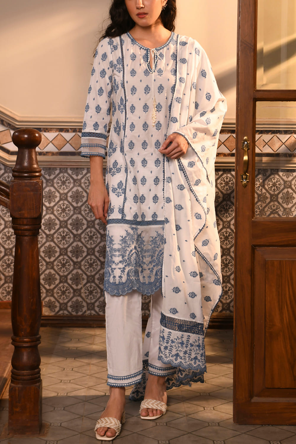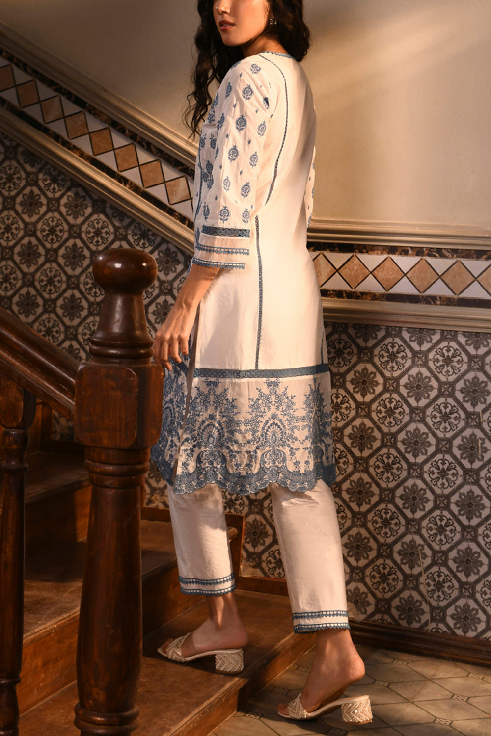 White and blue thread embroidery kurta set