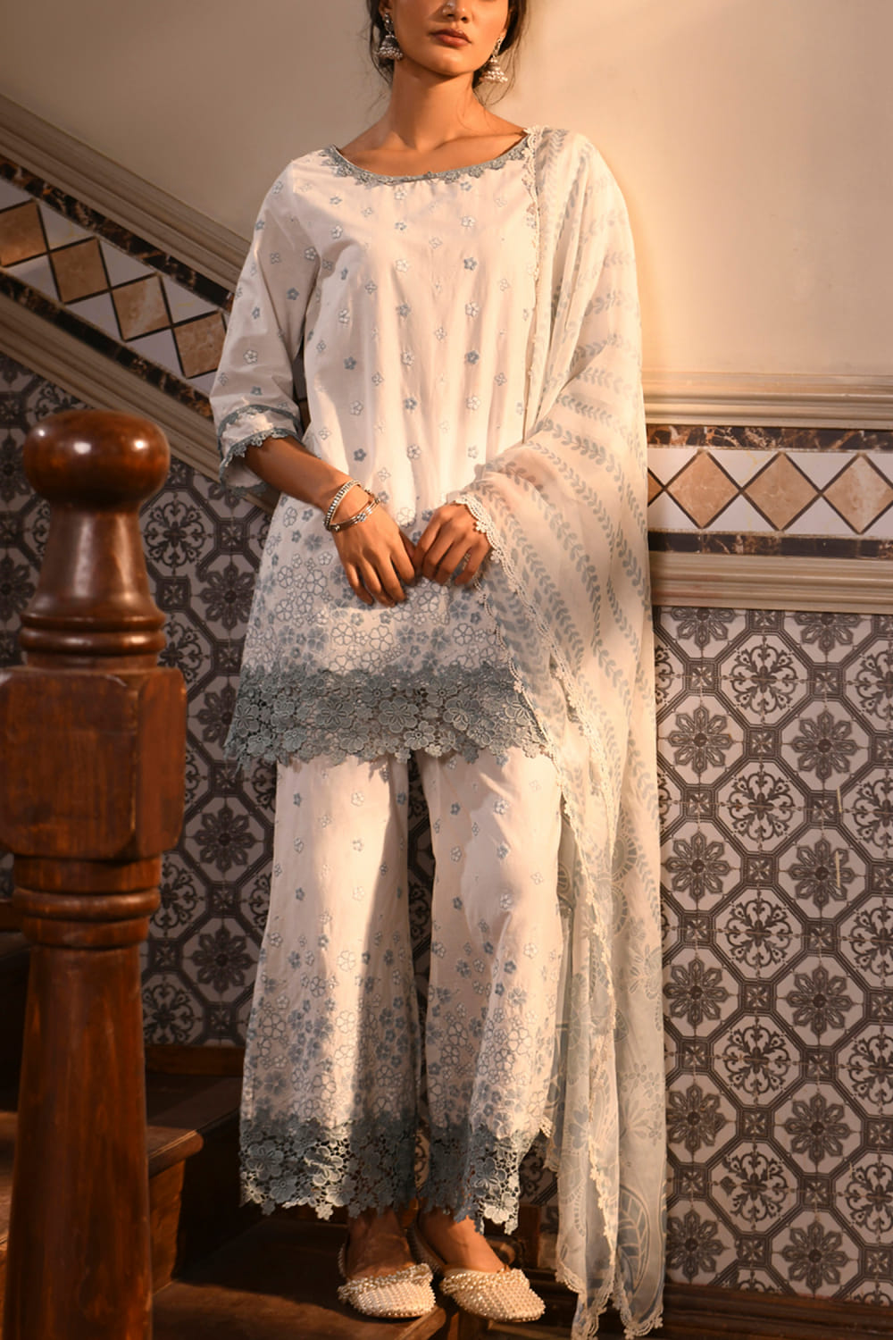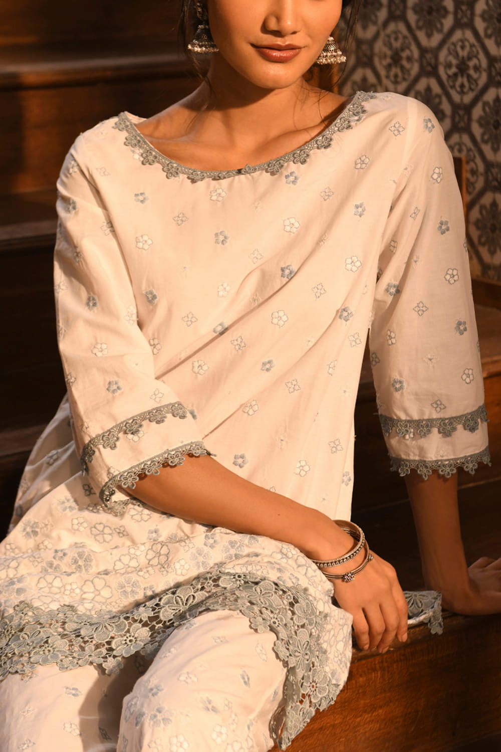 White and grey floral embroidery kurta set