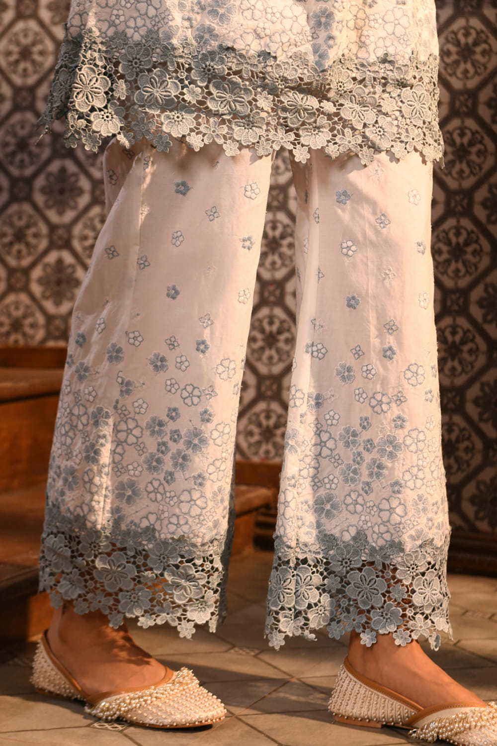 Mulmul designs this awe-inspiring short kurta in mulmul cotton enhanced with thread embroidery detailing in floral motifs featuring intricate floral lace work, teaming it with matching flared pants and a matching dupatta. Style the look with hoop earrings and mule heels for a traditional occasion.