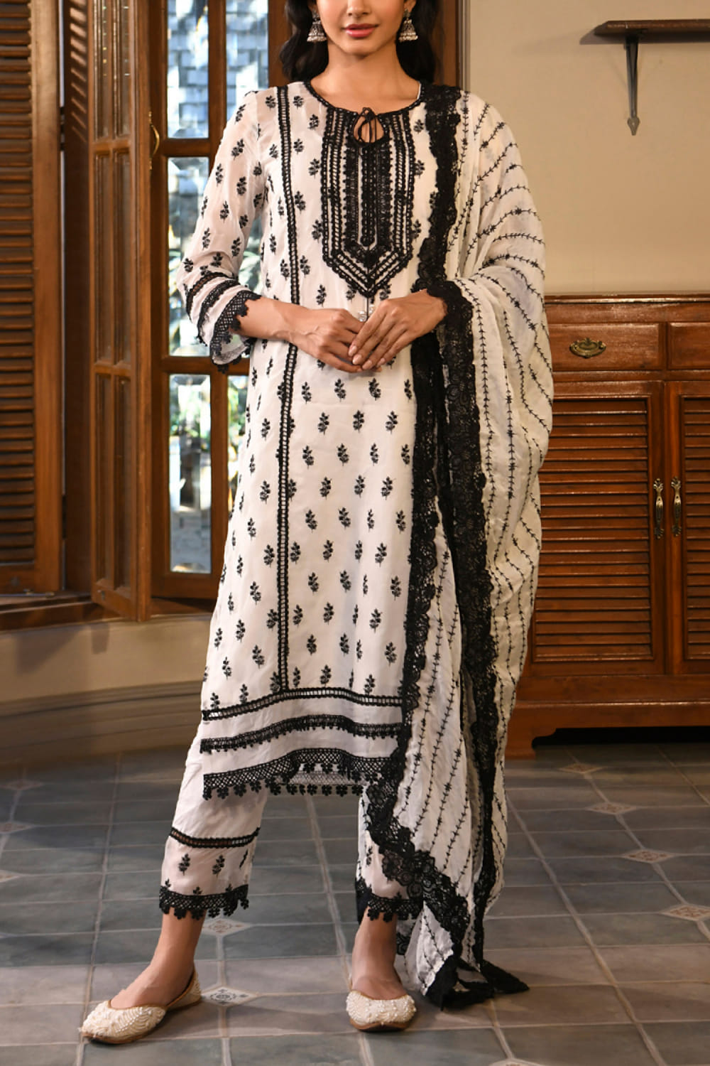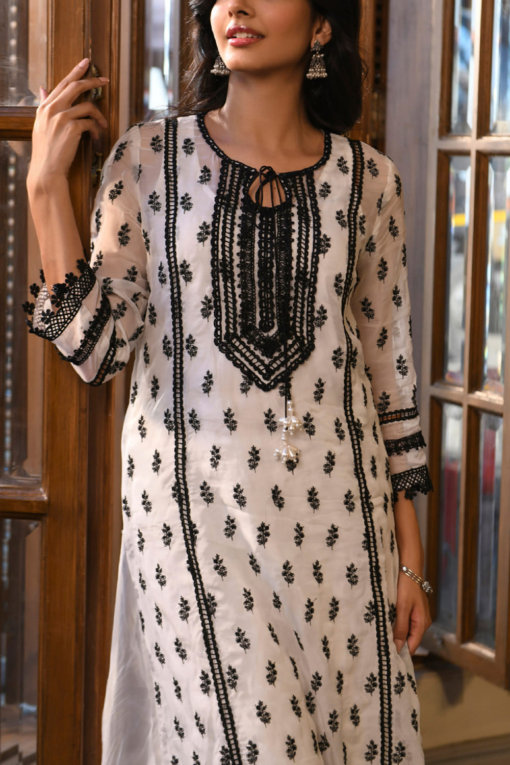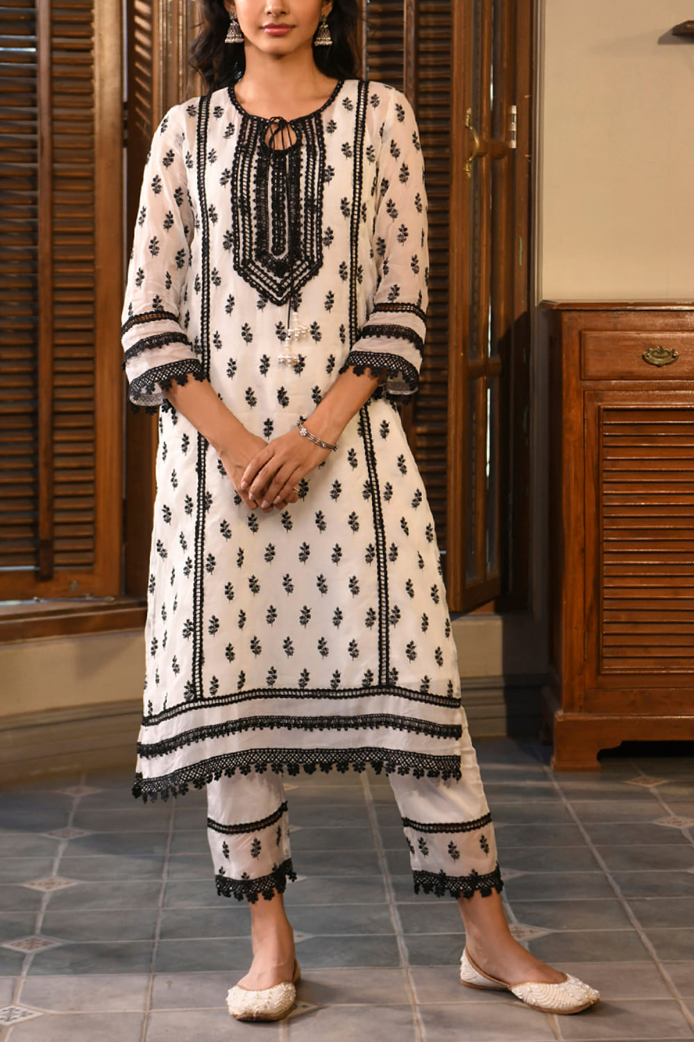 Mulmul designs this timeless kurta in tencel organza enriched with neck tie-up detailing, lace work and thread embroidery in floral motifs featuring a straight silhouette, pairing it with a matching dupatta, camisole and matching straight pants. Style the look with meenakari jhumkas and kolhapuri heels.