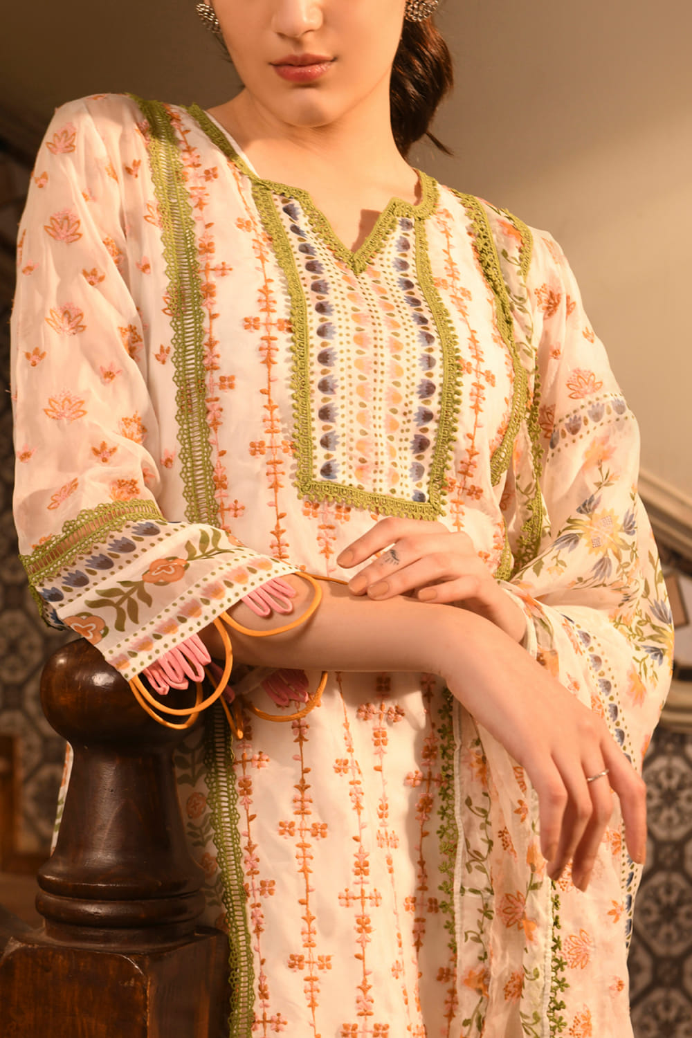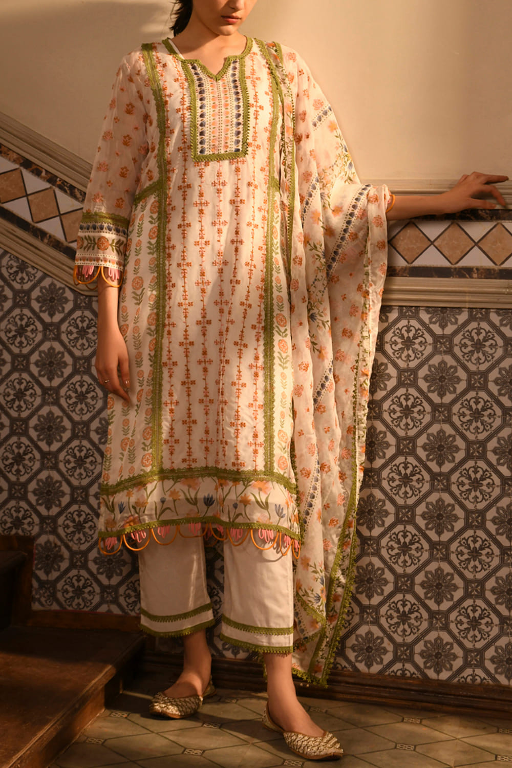 Mulmul designs this captivating kurta in tencel luxe encapsulated with floral and leaf prints featuring intricate embroidery detailing and a scalloped hem. It is teamed with matching straight pants and an inner. Style the look with chunky hoops and block heels for a festive appeal.