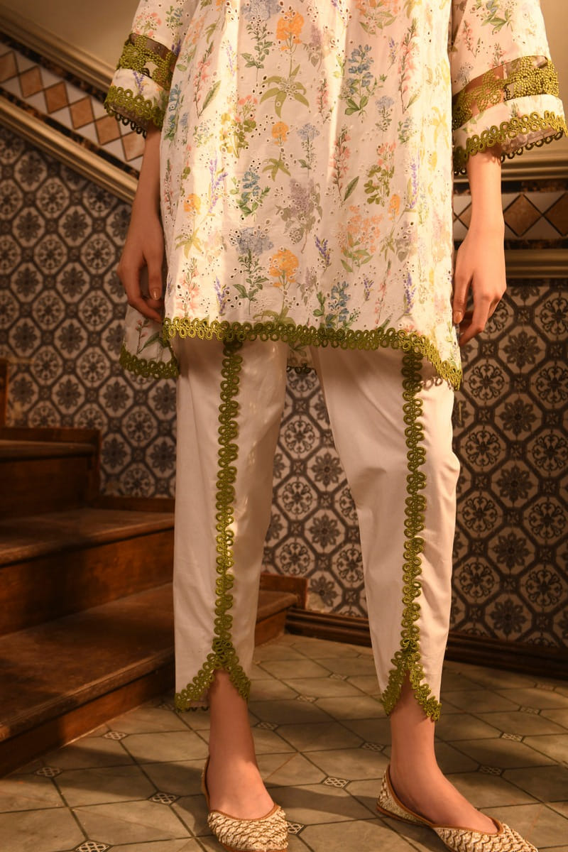 Mulmul designs this wardrobe-staple kurta customised in mulmul cotton with floral and leaf prints featuring intricate lace work and delicate embroidery detailing in an asymmetrical silhouette. It is teamed with matching tulip pants and a striped printed dupatta. Style the look with stone drop earrings and a capsule clutch for a casual appeal.