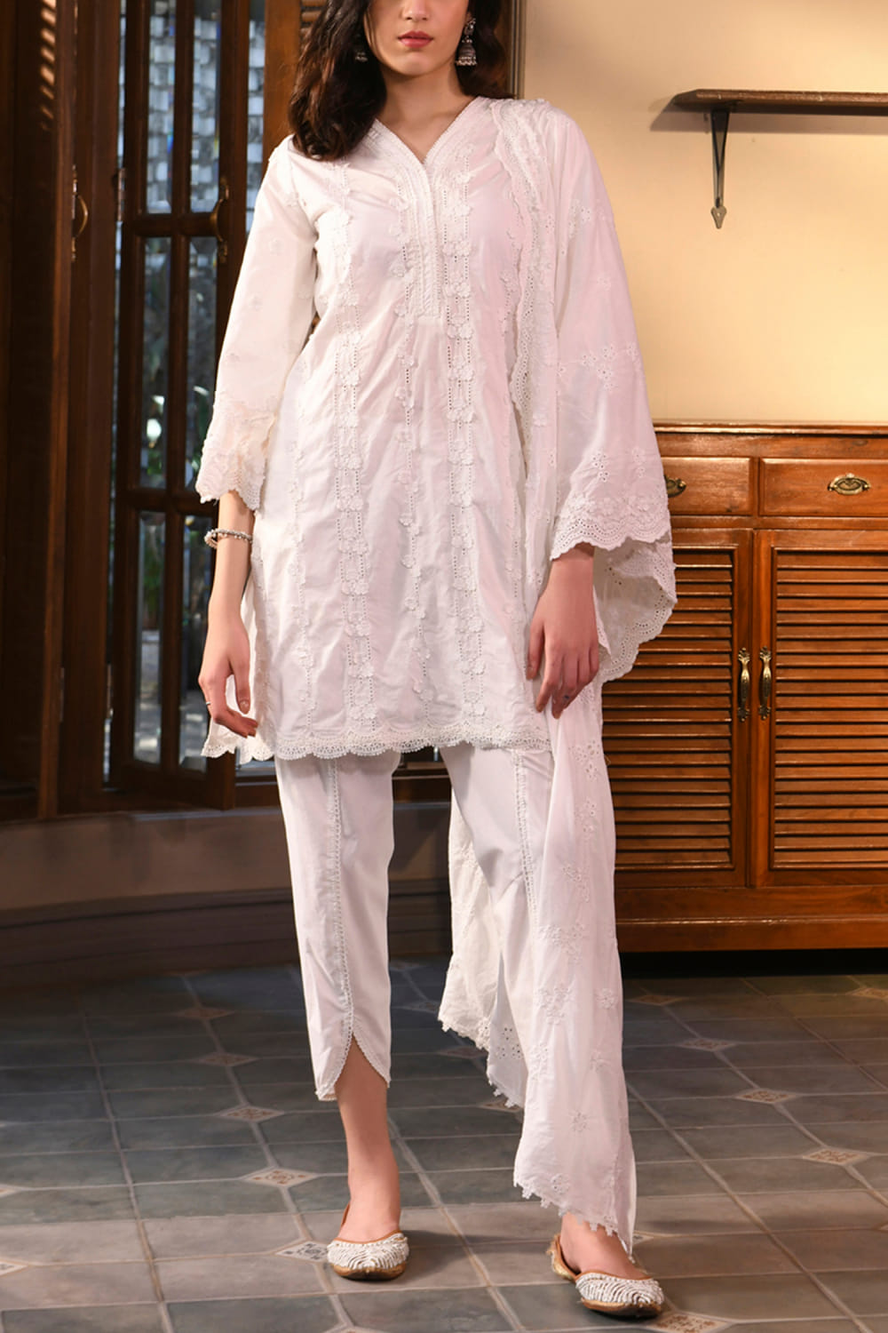White linear and floral embroidery kurta set