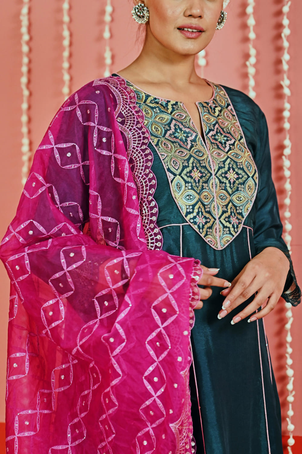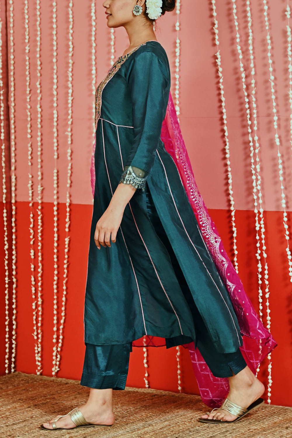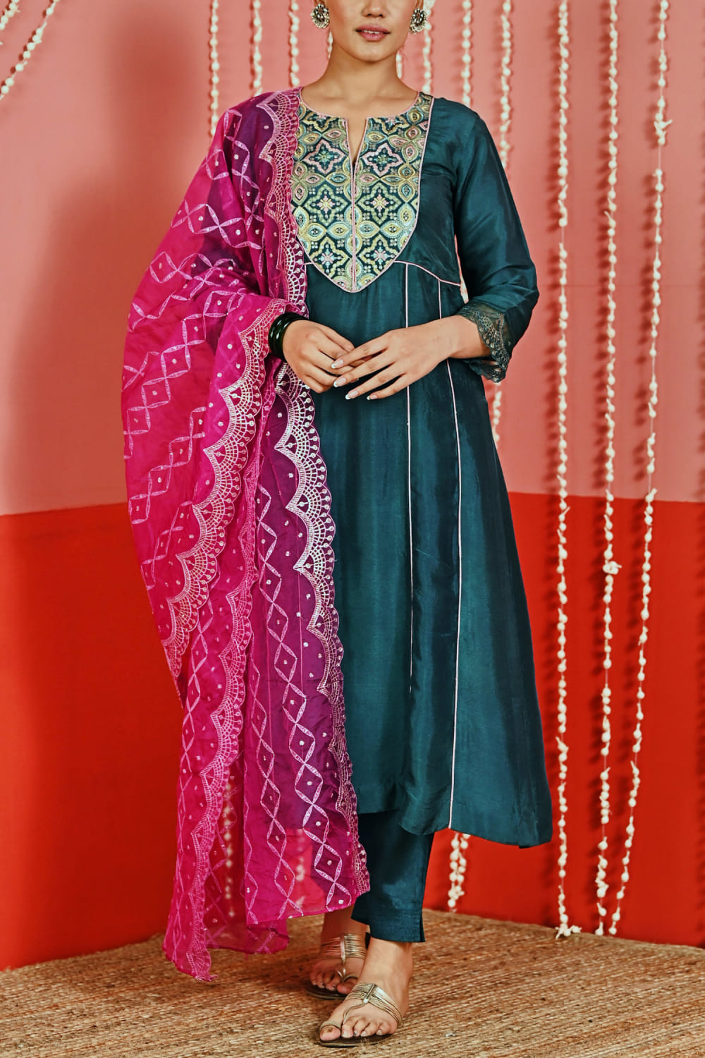 Myaara designs this stunning A-line panelled kurta encapsulated with sequins in a floral embroidered yoke, teaming it with a matching pair of pants and a contrast scalloped embroidered dupatta. Style the look with embellished chandbaalis and metallic kolhapuris for a festive soiree.